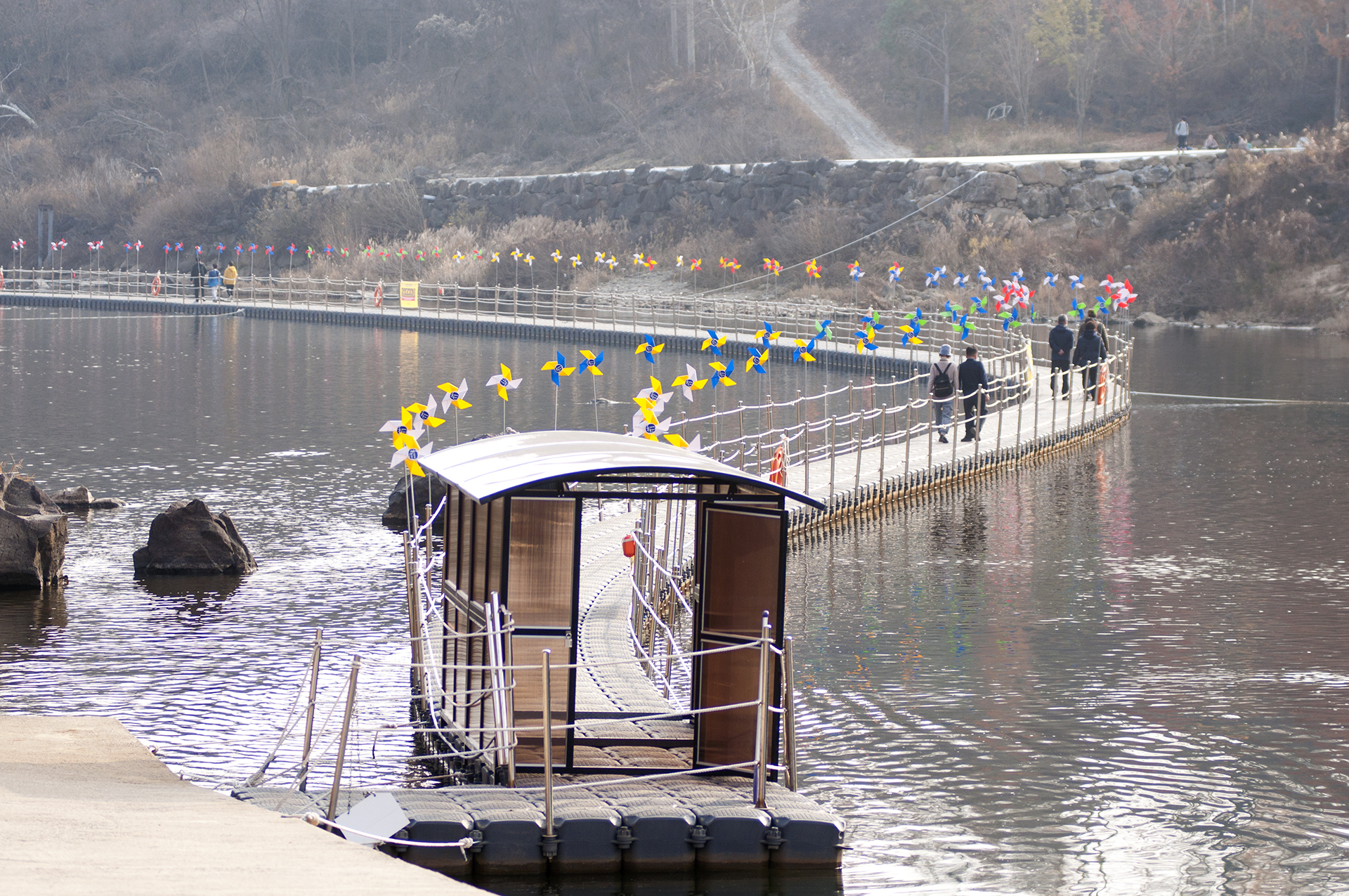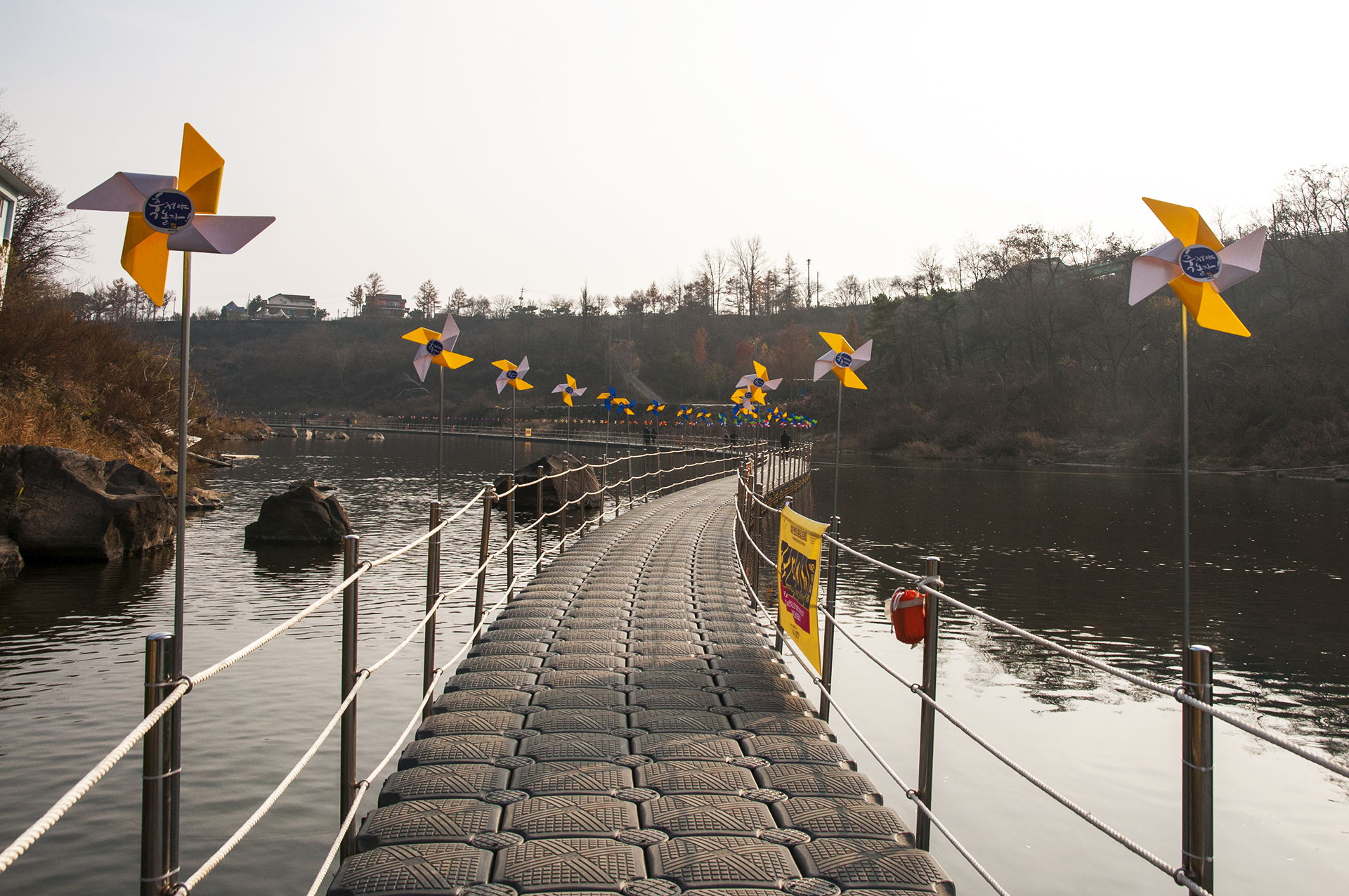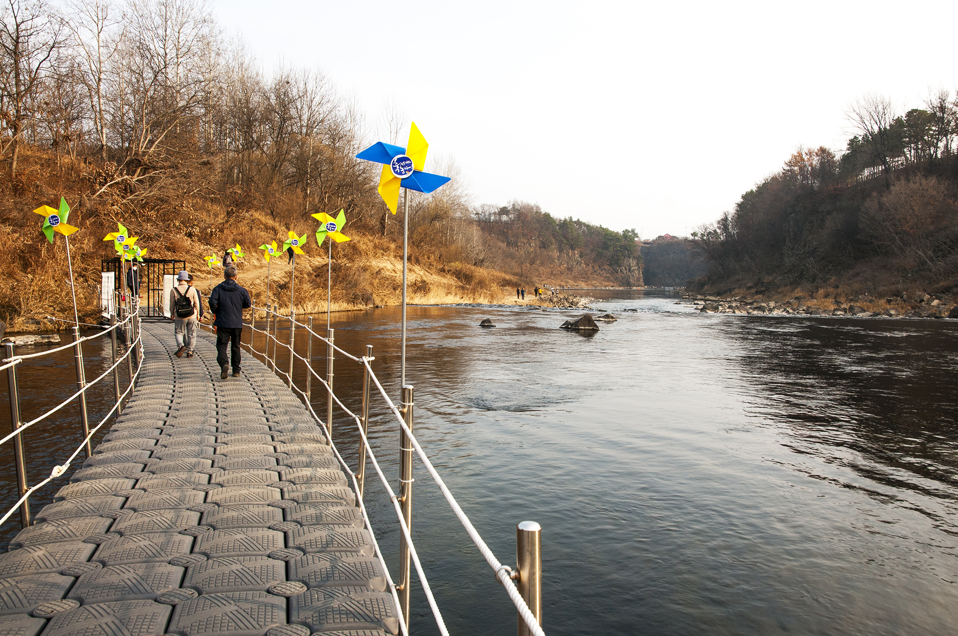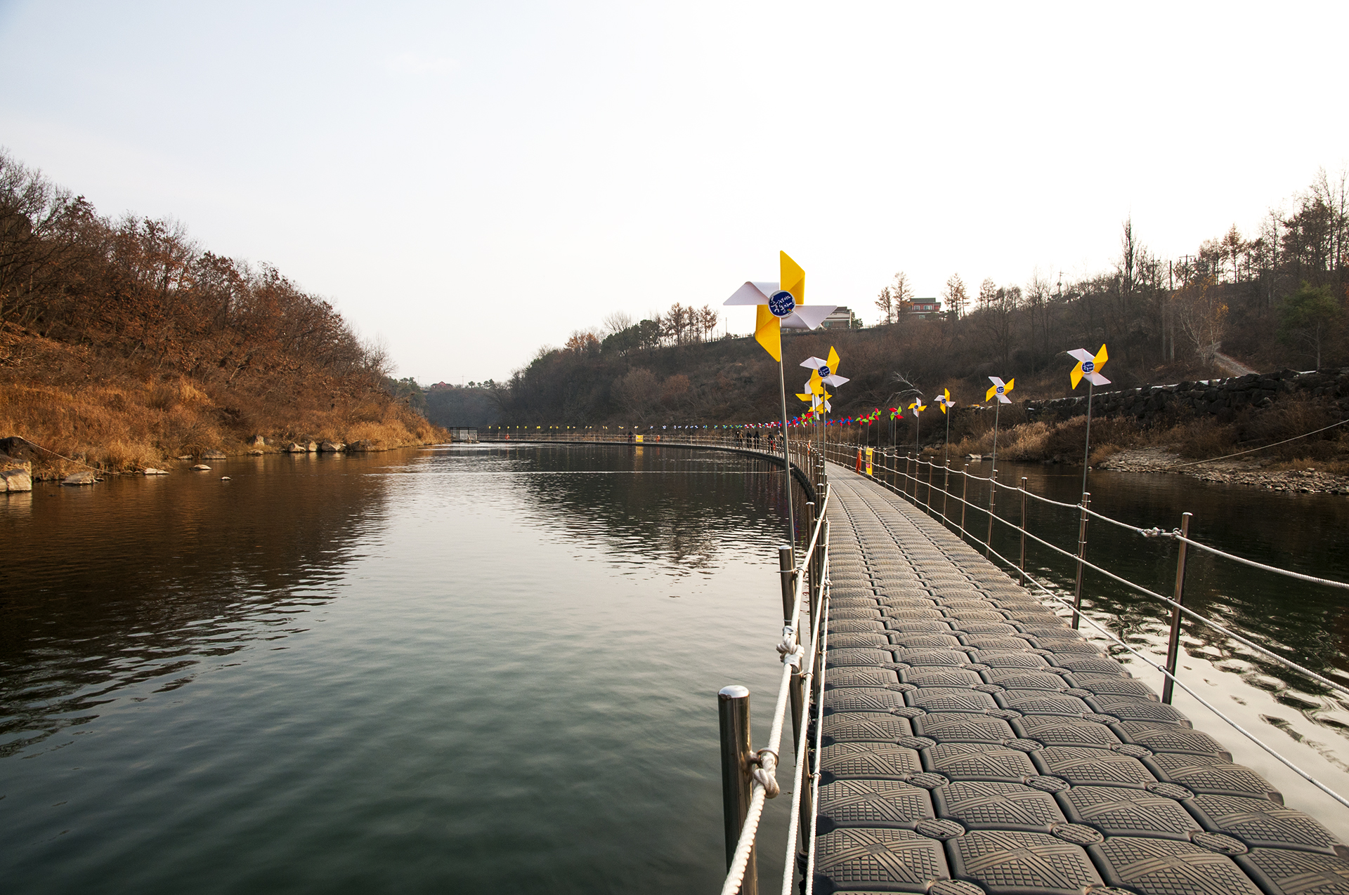 게이트 통과 직전, 바람개비가 길을 만들어주고 있는 부교가 강위에 둥둥 떠있는 재밌는 길이다.