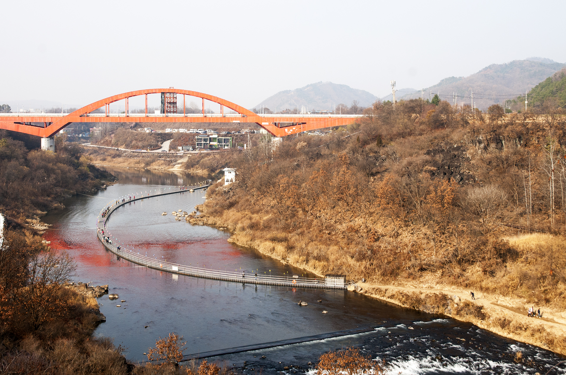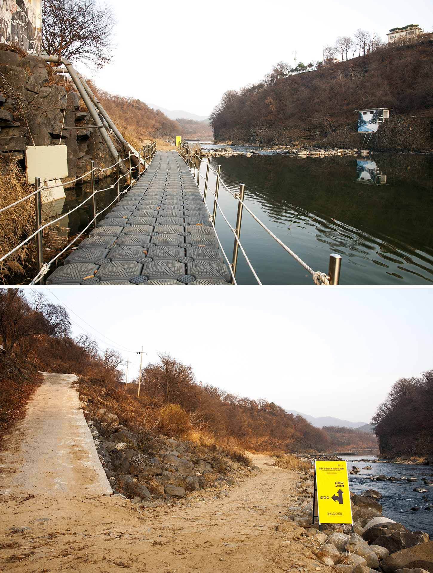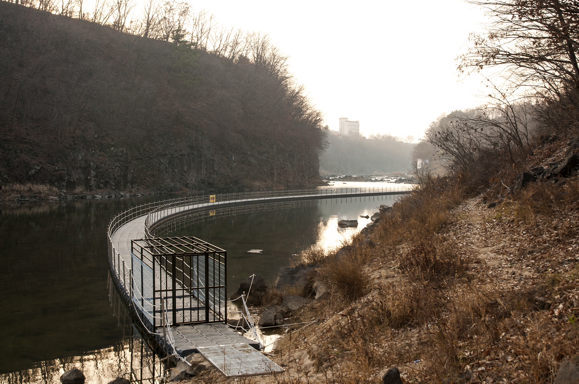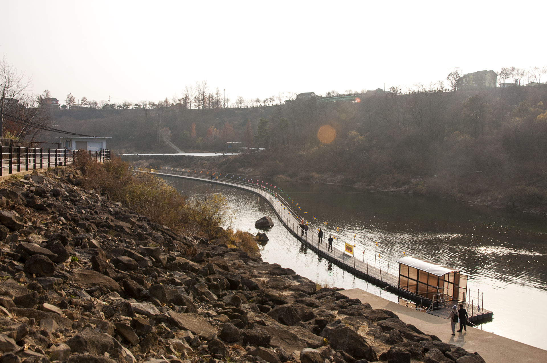 게이트 통과 직전, 바람개비가 길을 만들어주고 있는 부교가 강위에 둥둥 떠있는 재밌는 길이다.