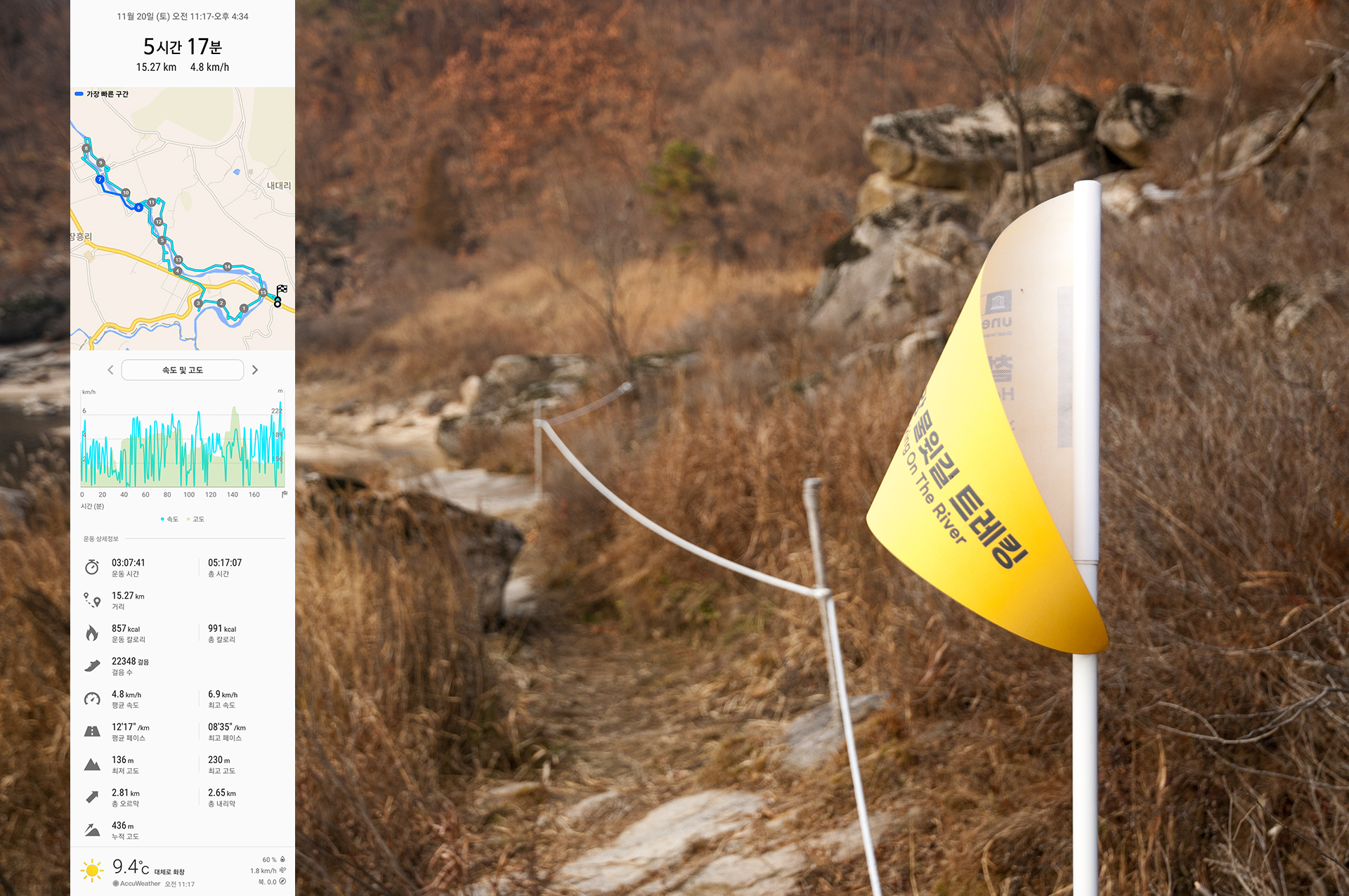 직접 걸어보니 총거리 15.27km, 5시간 17분이 소요됐다.