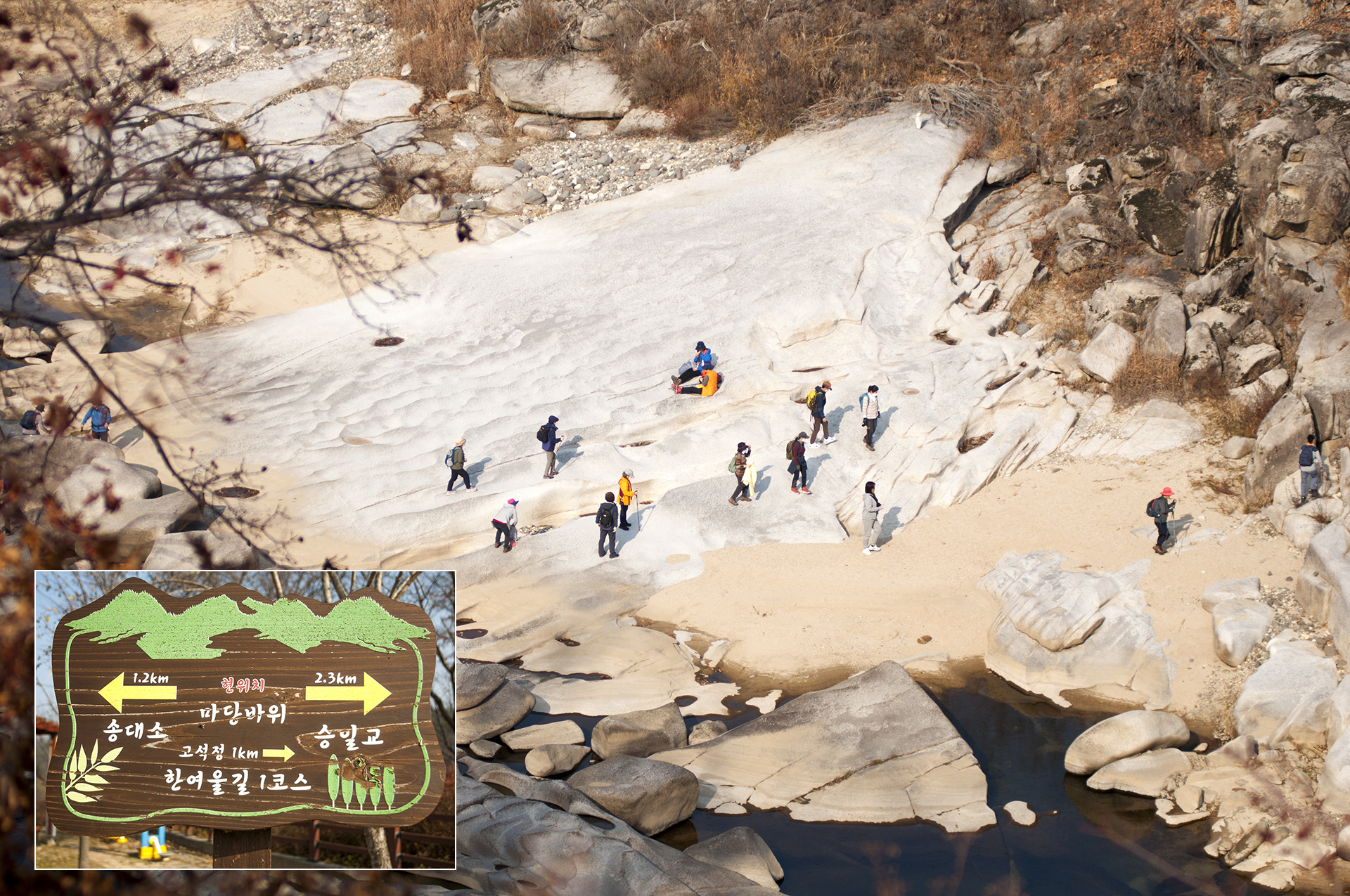 강 아래로 보이는 마당바위는 돌아갈때 반대편 길로 걷게되면 그때나 가볼수 있을것 같다.