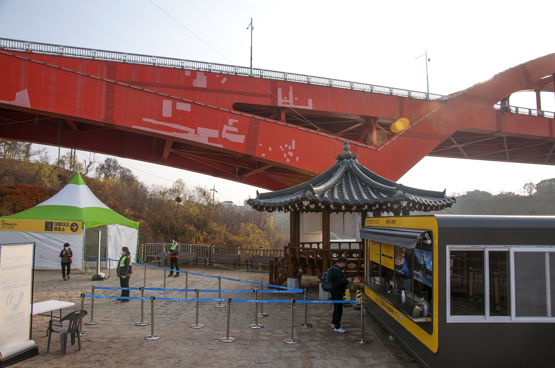 물윗길에 입장하기 위해서는 먼저 안심콜 전화와 체온측정 후에 입장할수 있다.