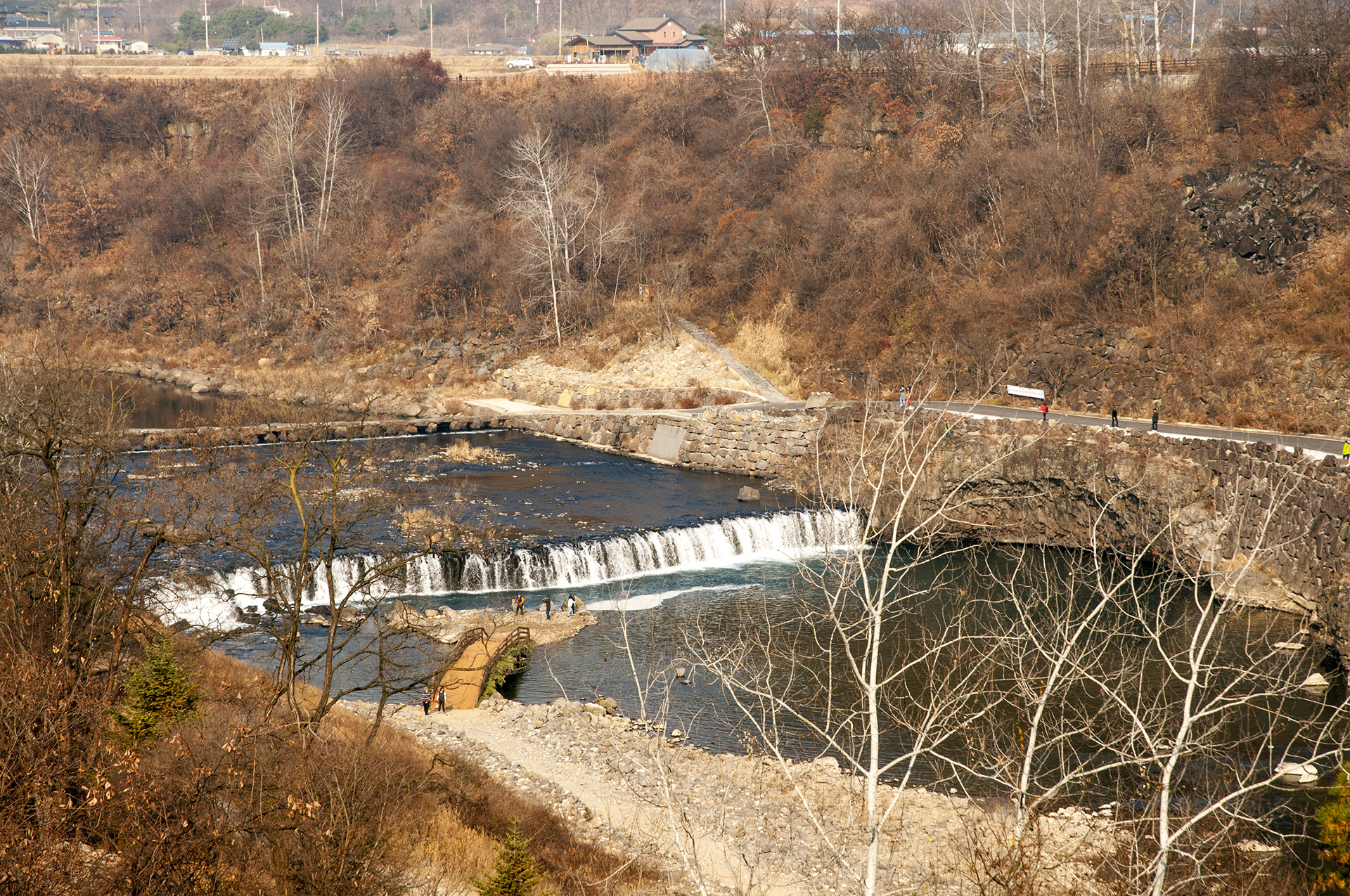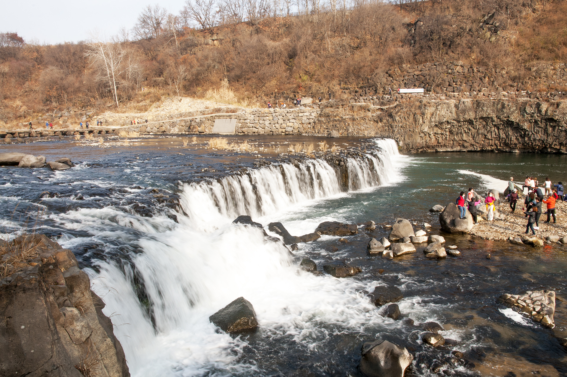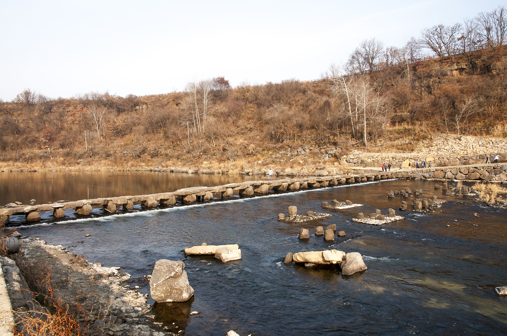 오늘 트레킹에서는 직탕폭포 윗쪽에 있는 이 돌다리를 건너 지금까지 걸어왔던 한탄강을 건너편으로 걸어 원점으로 돌아갈 것이다.