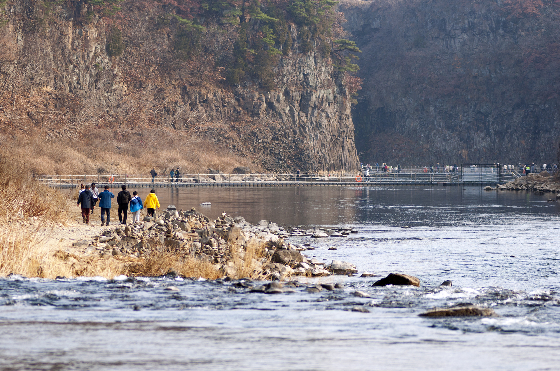 강변을 따라 세워놓은 돌탑과 갈대밭을 지나 앞쪽에 주상절리 암벽 사이로 물윗길이 이어진다.