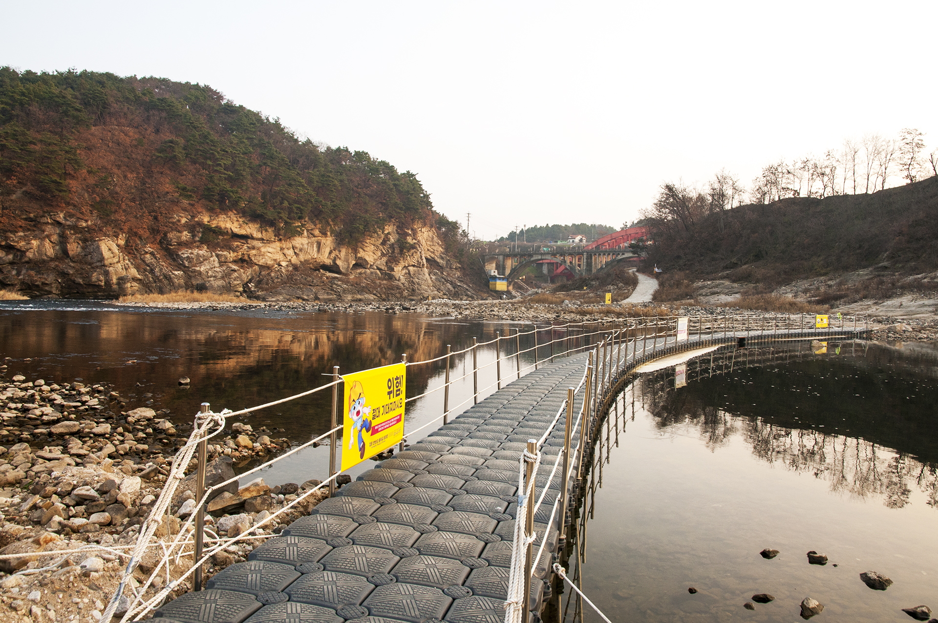 승일교로 가기 위해 강을 건너야하는 지점에 물윗길 부교가 개방되어 있으니 참 고마운 일이다.