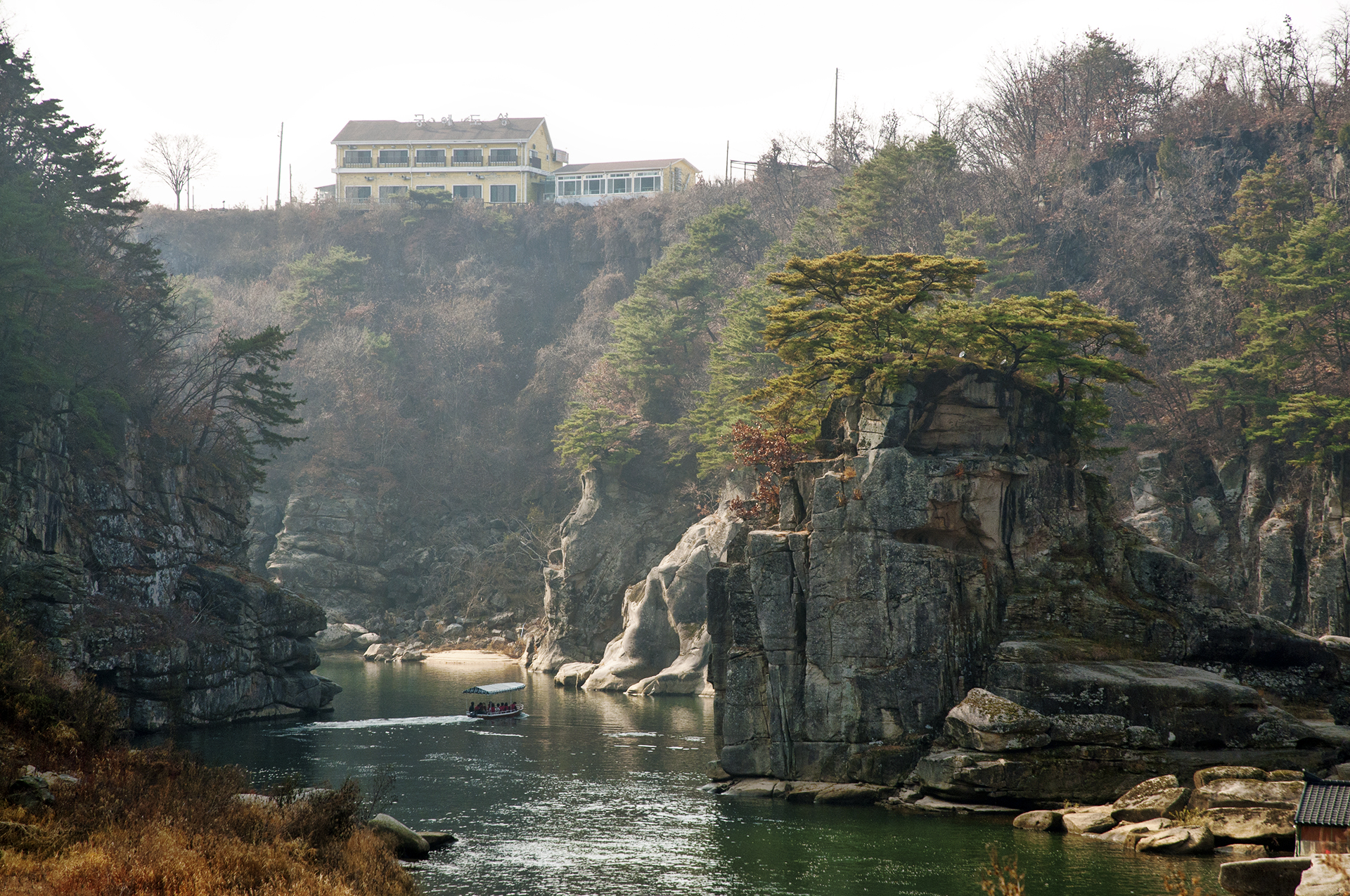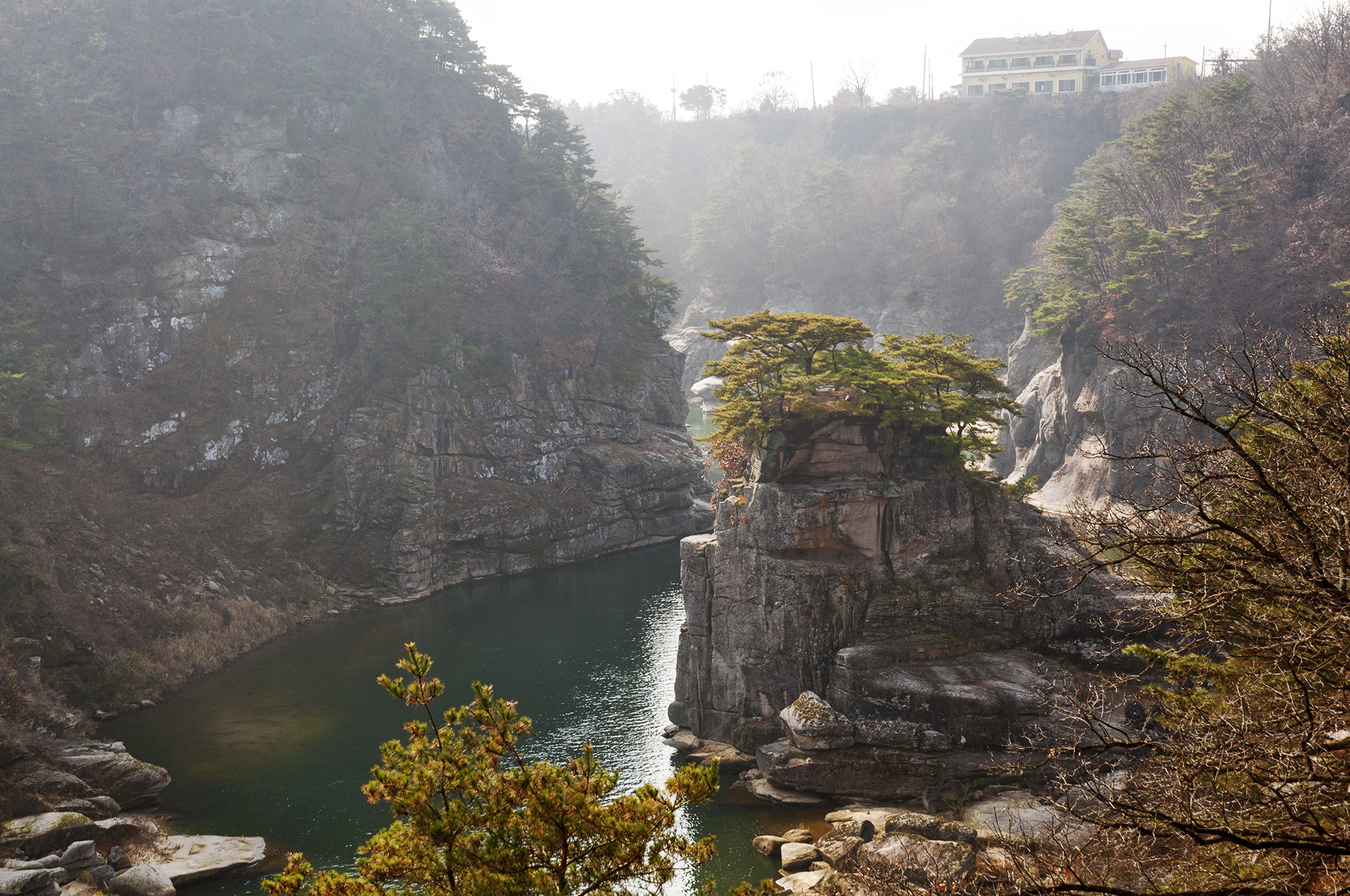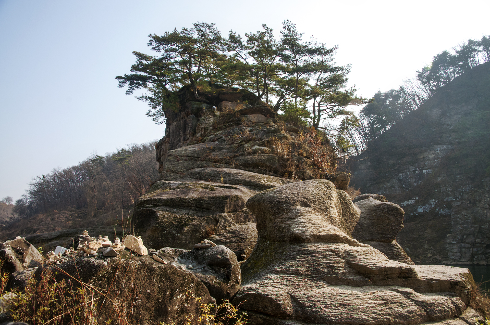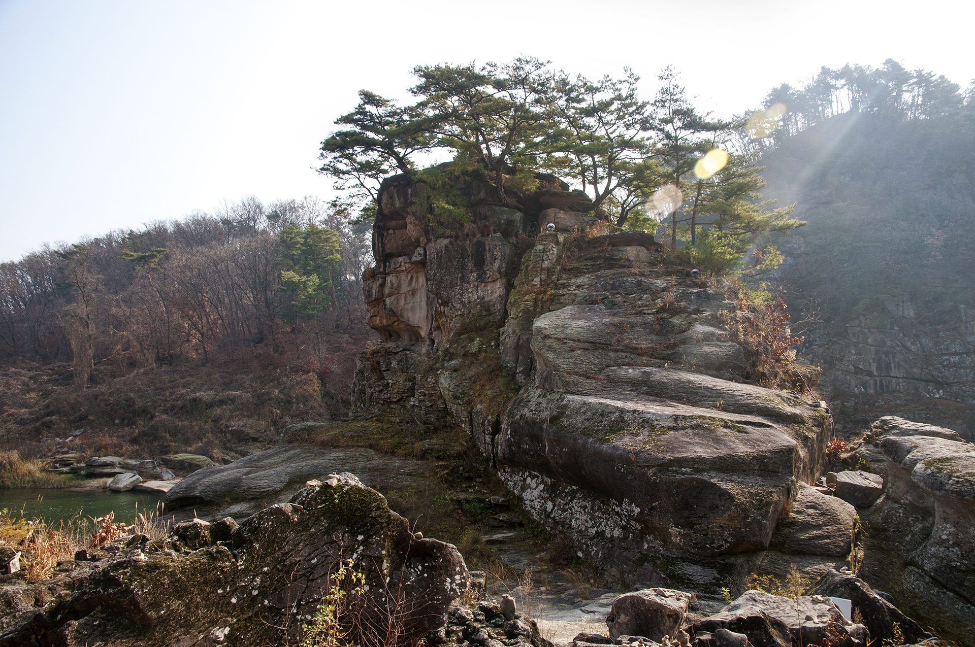 고석정 정자쪽 강가에 우뚝 솟아 있는 10m 높이의 고석은 고석정만의 멋스러움을 더해준다.