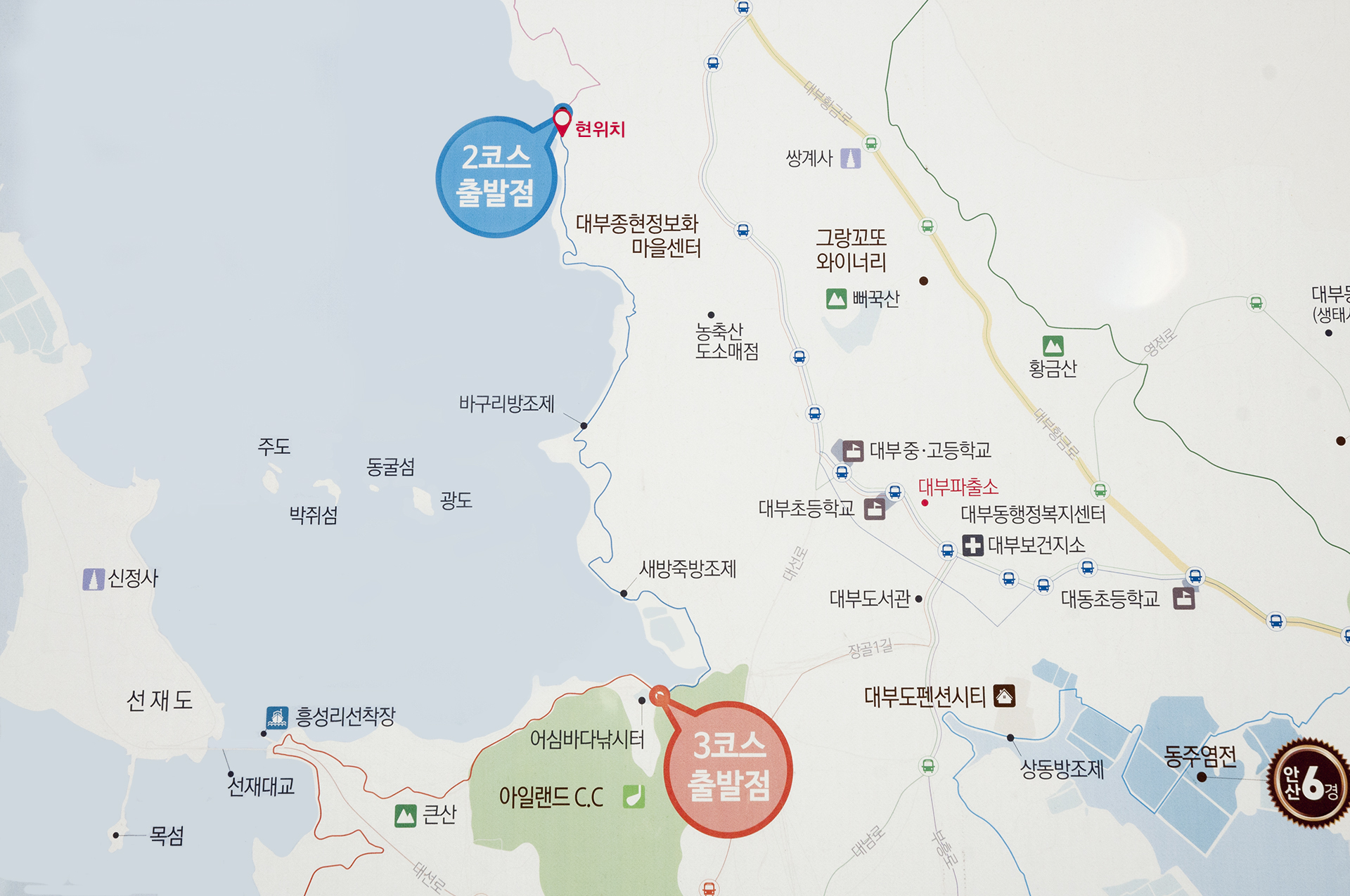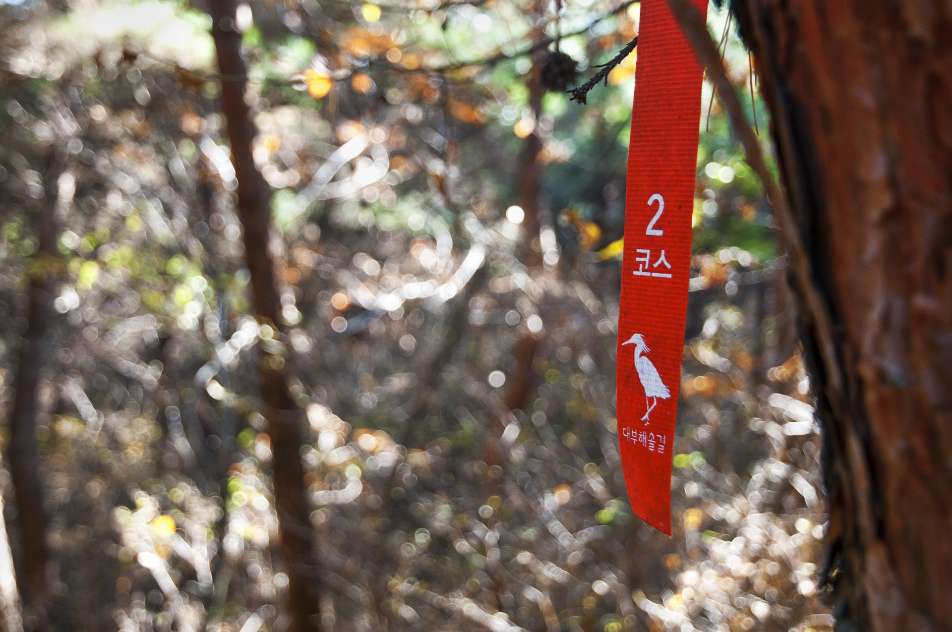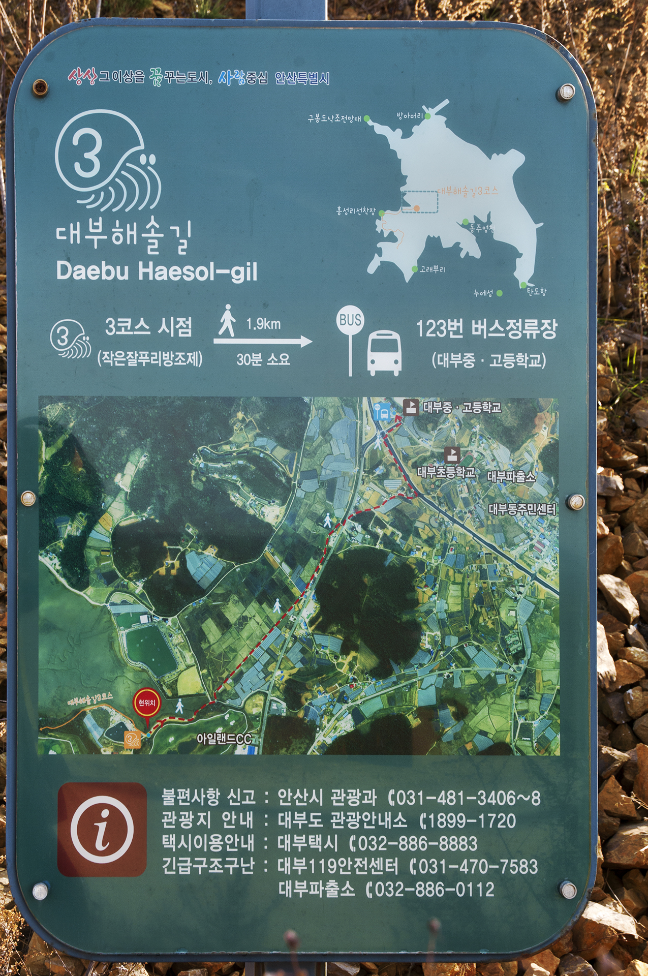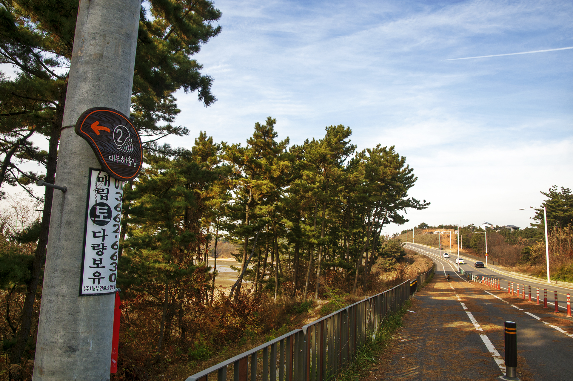 물이 들어와 도로를 따라 걷게될 경우 리본과 이정표를 보고 이 산으로 올라왔다면 물에 잠긴 해안길로 내려오게 되어 있으니 다시 돌아가야 될수도 있다. 밀물때는 아예 이곳을 패스하고 그냥 도로를 따라 걸어가면 된다.
