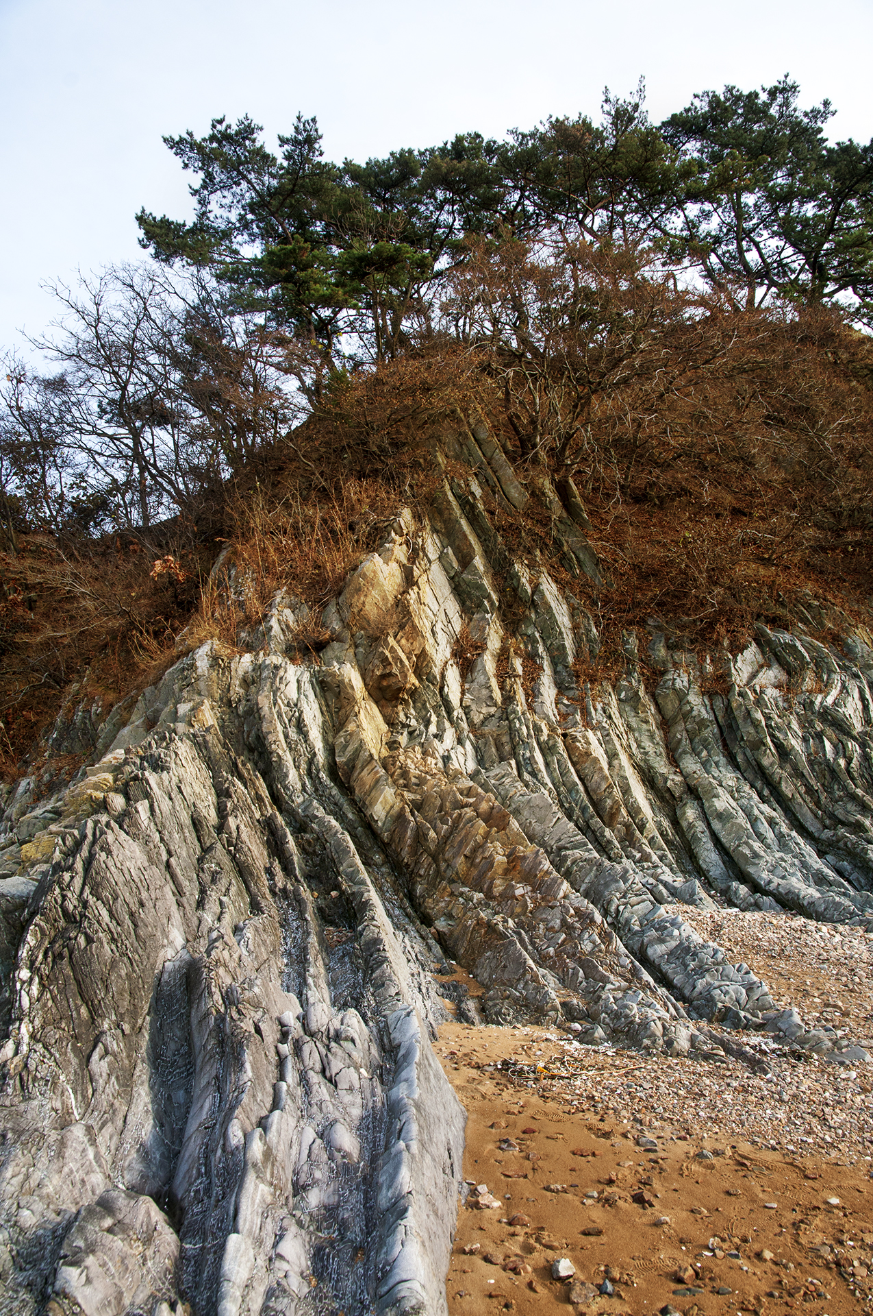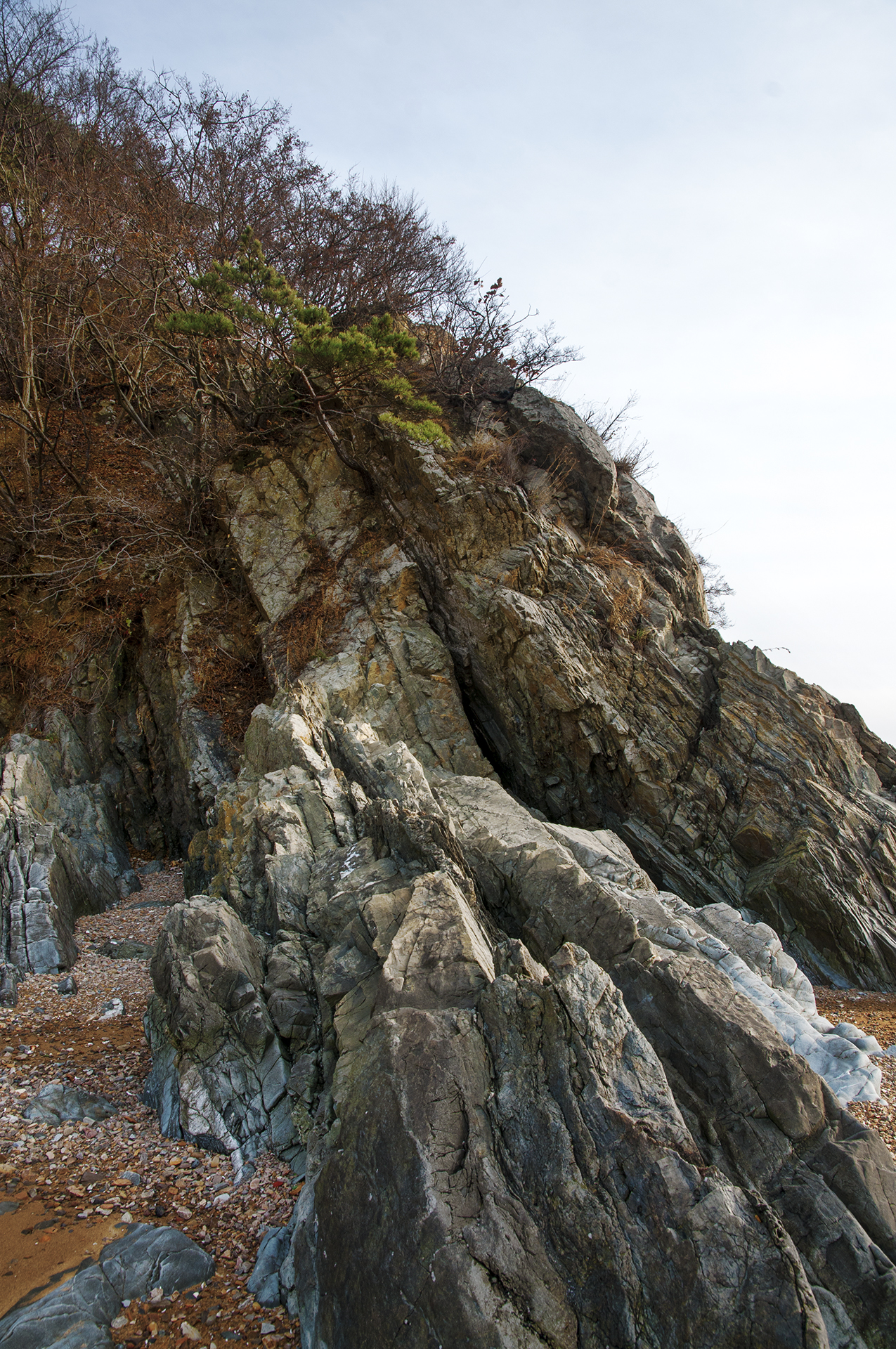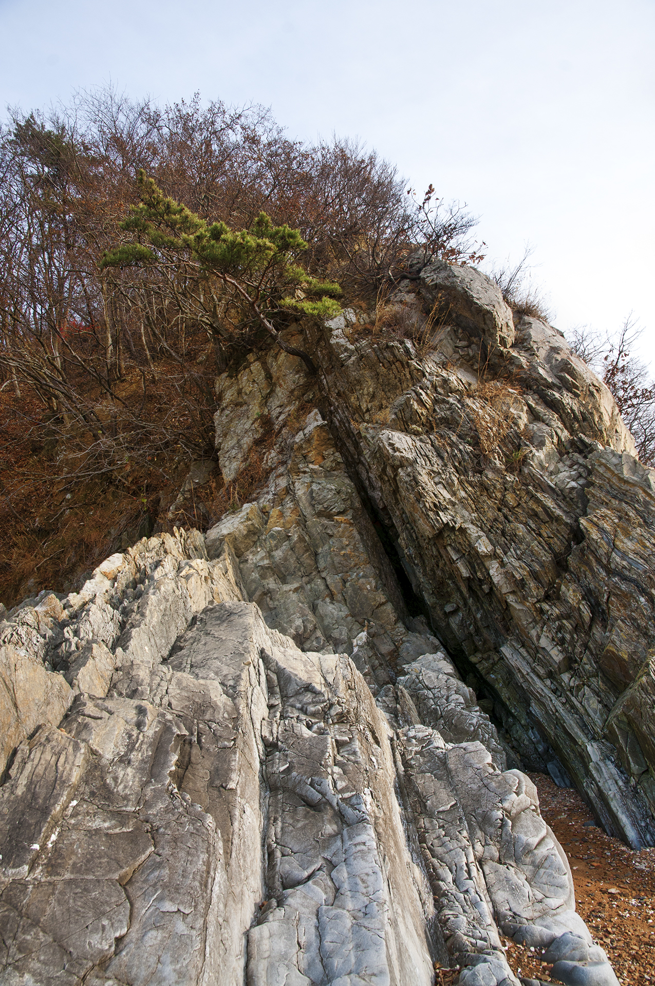 깨지고 쪼개진 바위 틈에서는 해송들이 자라나고 있다.