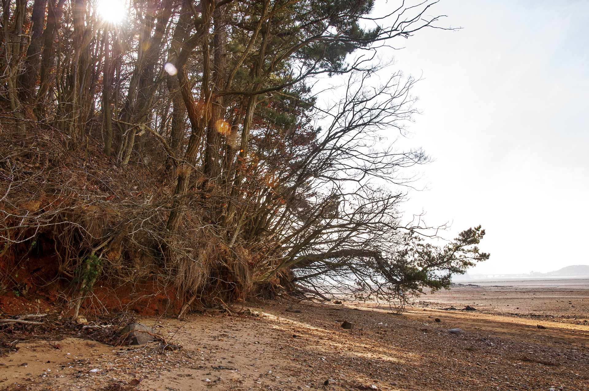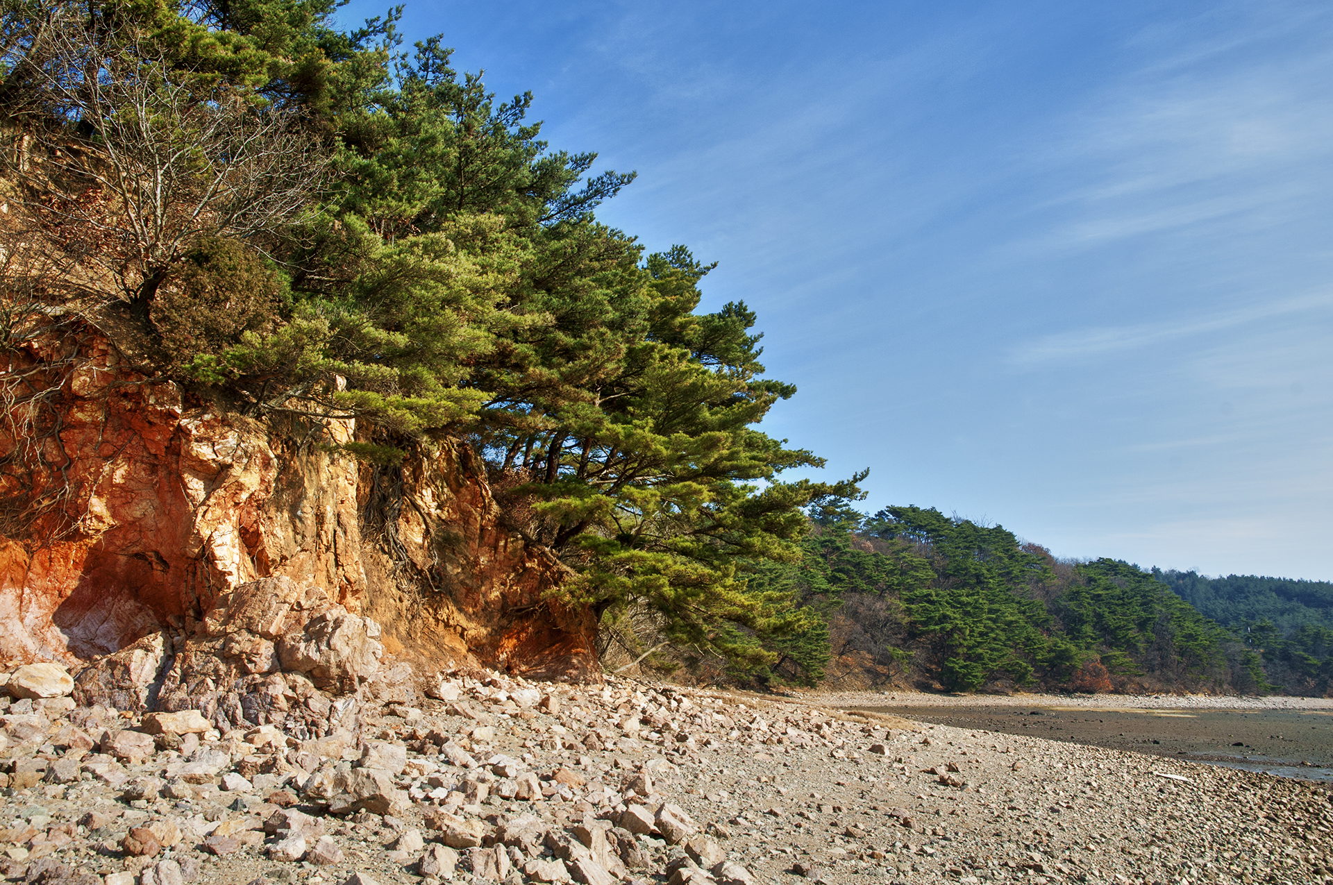밀물때면 이렇게 산의 흙이 파도에 깎여나가 아래부터 파이면서 아름드리 해송이 뿌리를 드러낸채 점차 죽어가고 있는 안타까운 모습이다.