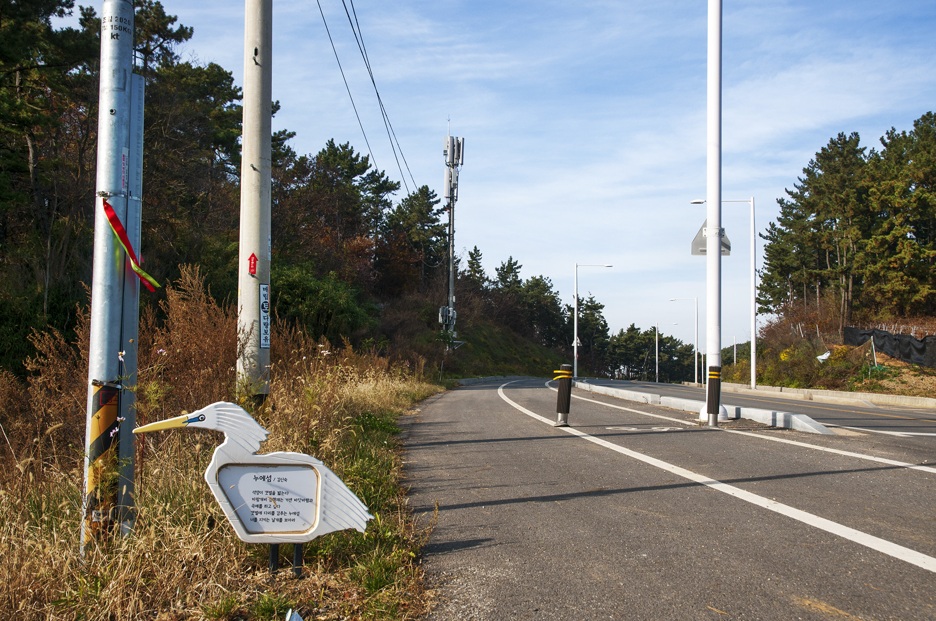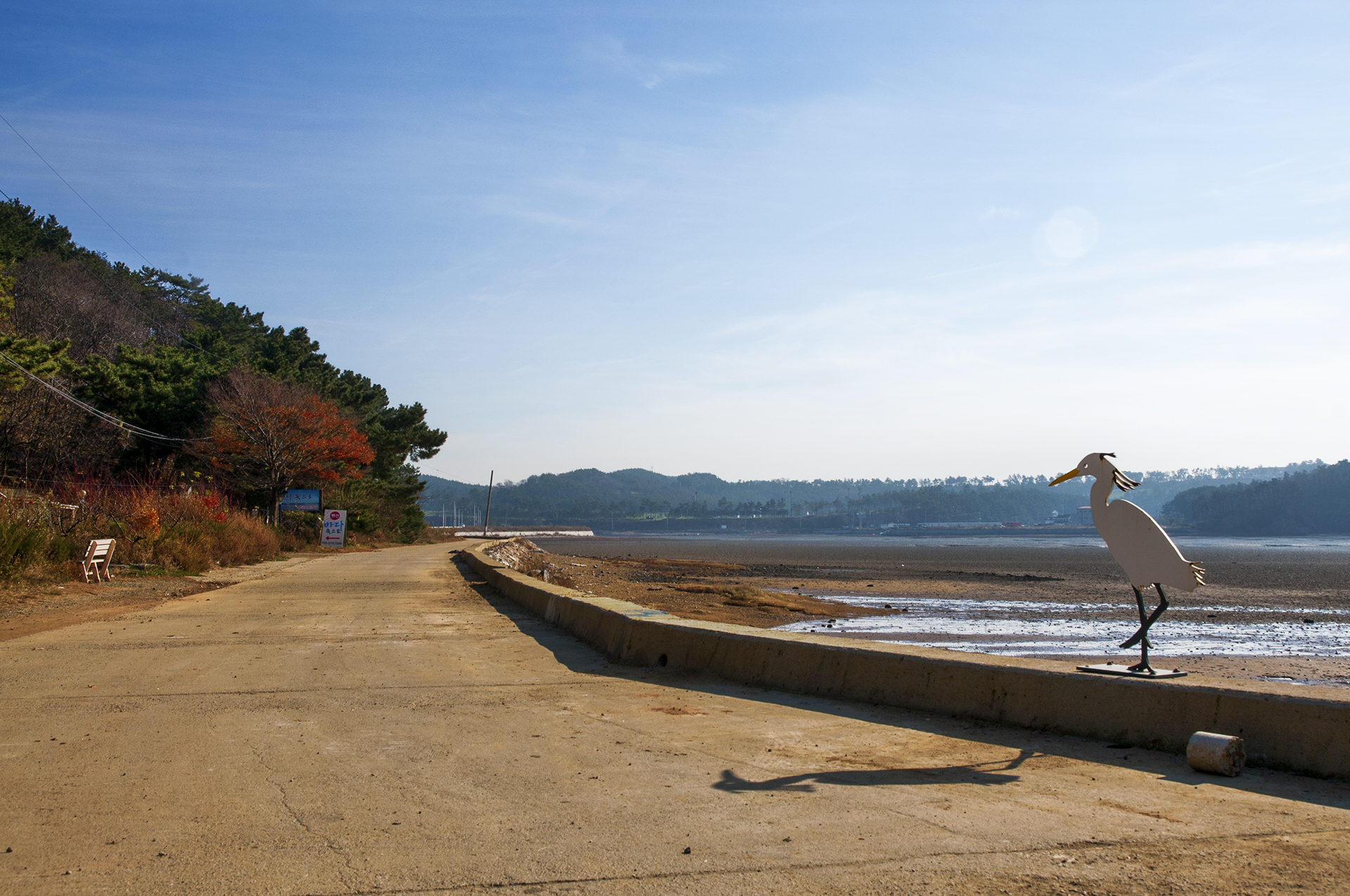 해솔길의 길잡이 역할을 하는 노랑부리백로가 새방죽방조제 길을 안내하고 있다.