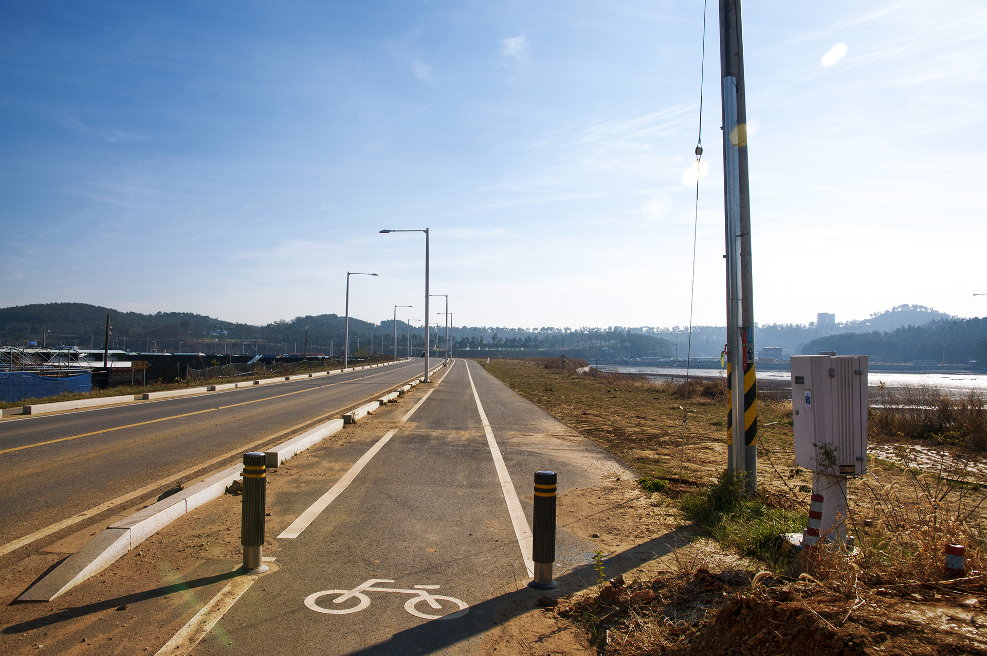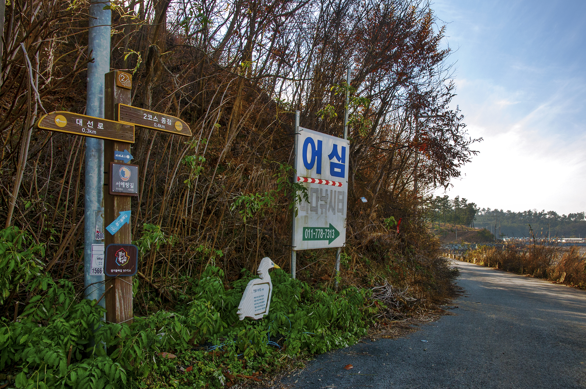 전망데크에서 200여m 진행하면 도로를 만나게 되고 어심낚시터 입구까지는 잠시동안 이 길을 걸어야 한다.