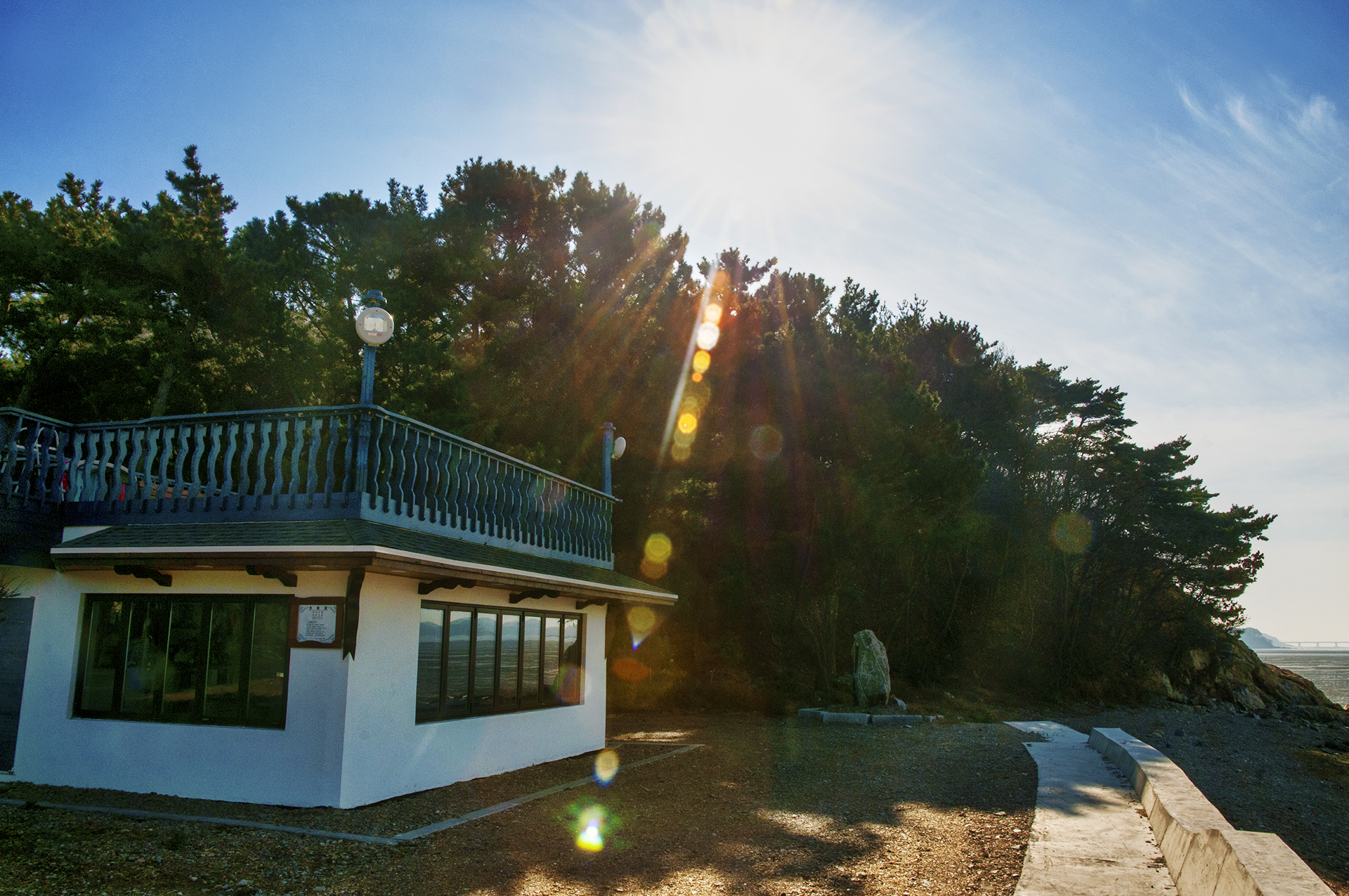 12:13분,해안가에 위치한 은전각이라는 건물에 도착, 뒷쪽의 산과 같은 바위섬으로 올라가는 코스가 이어진다.