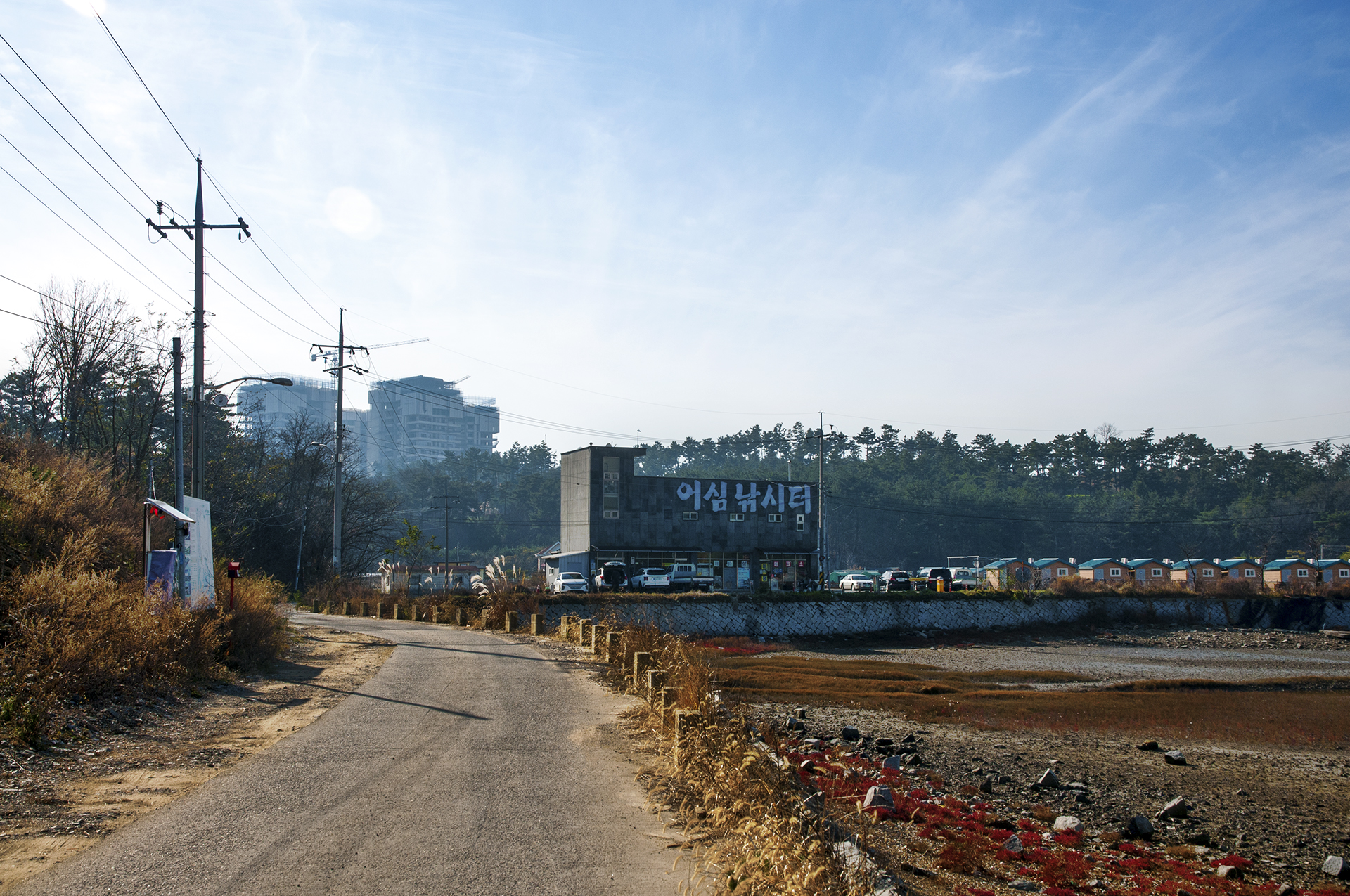왼쪽 도로 건너편에는 낚시터의 이색풍경이 펼쳐진다.