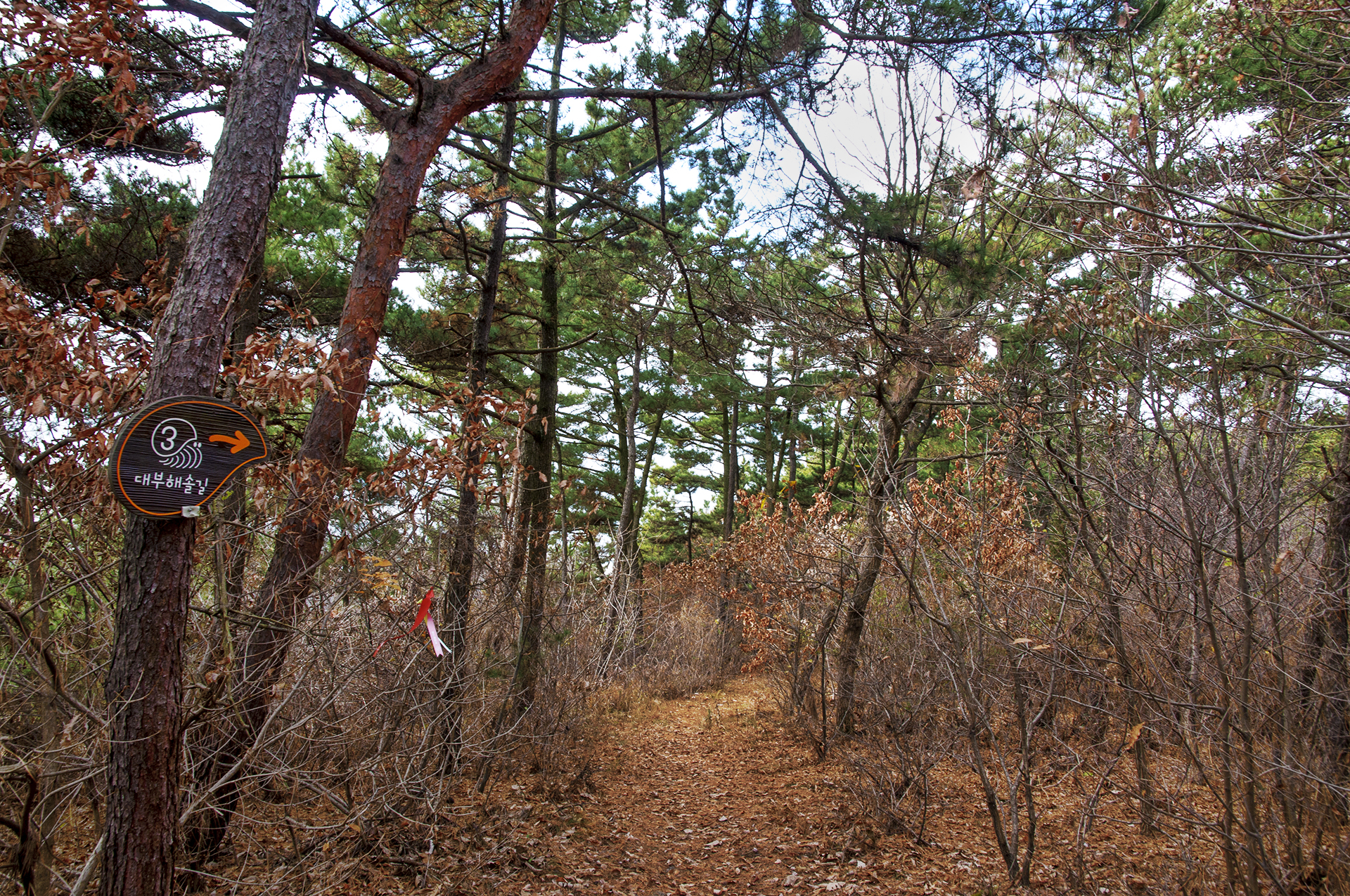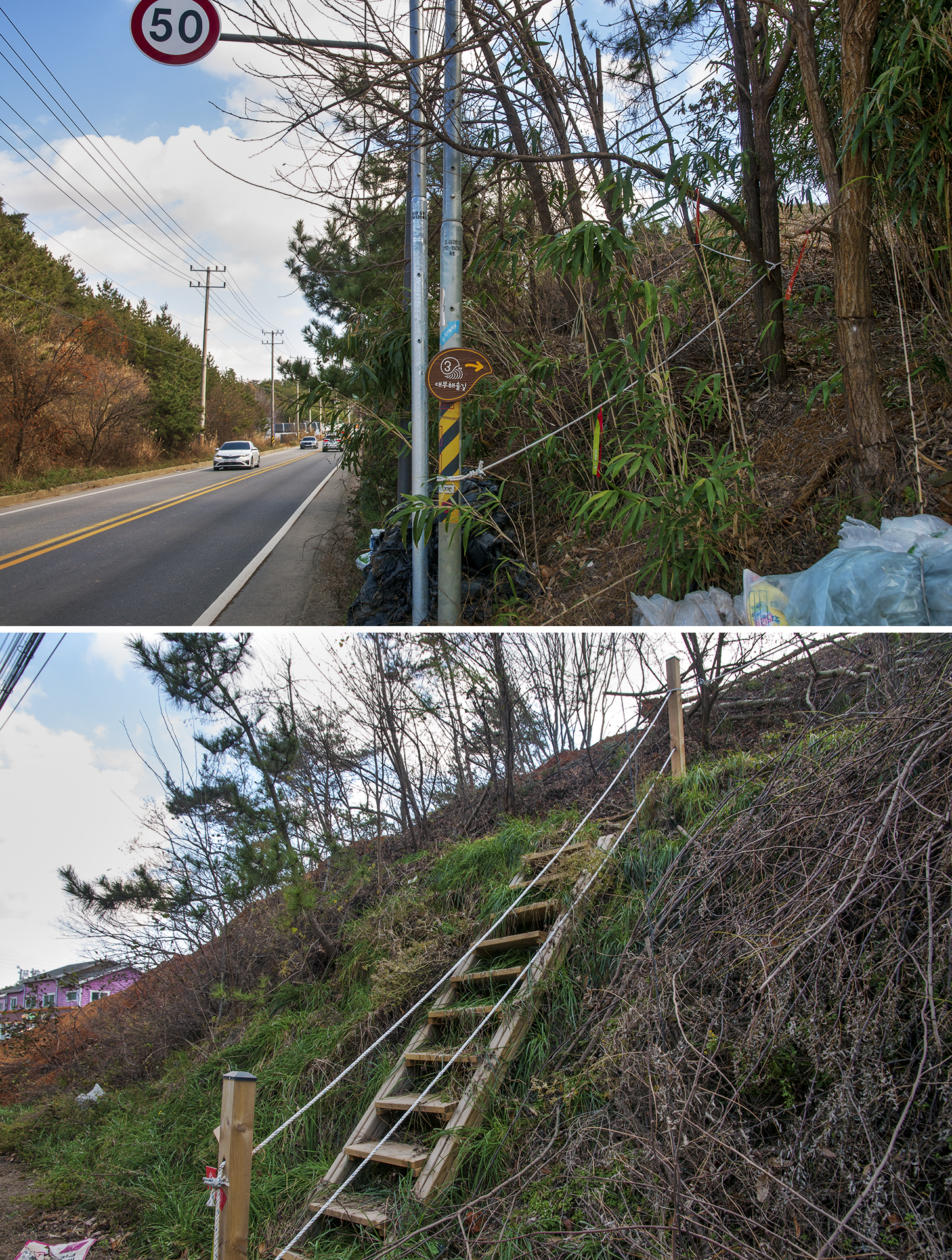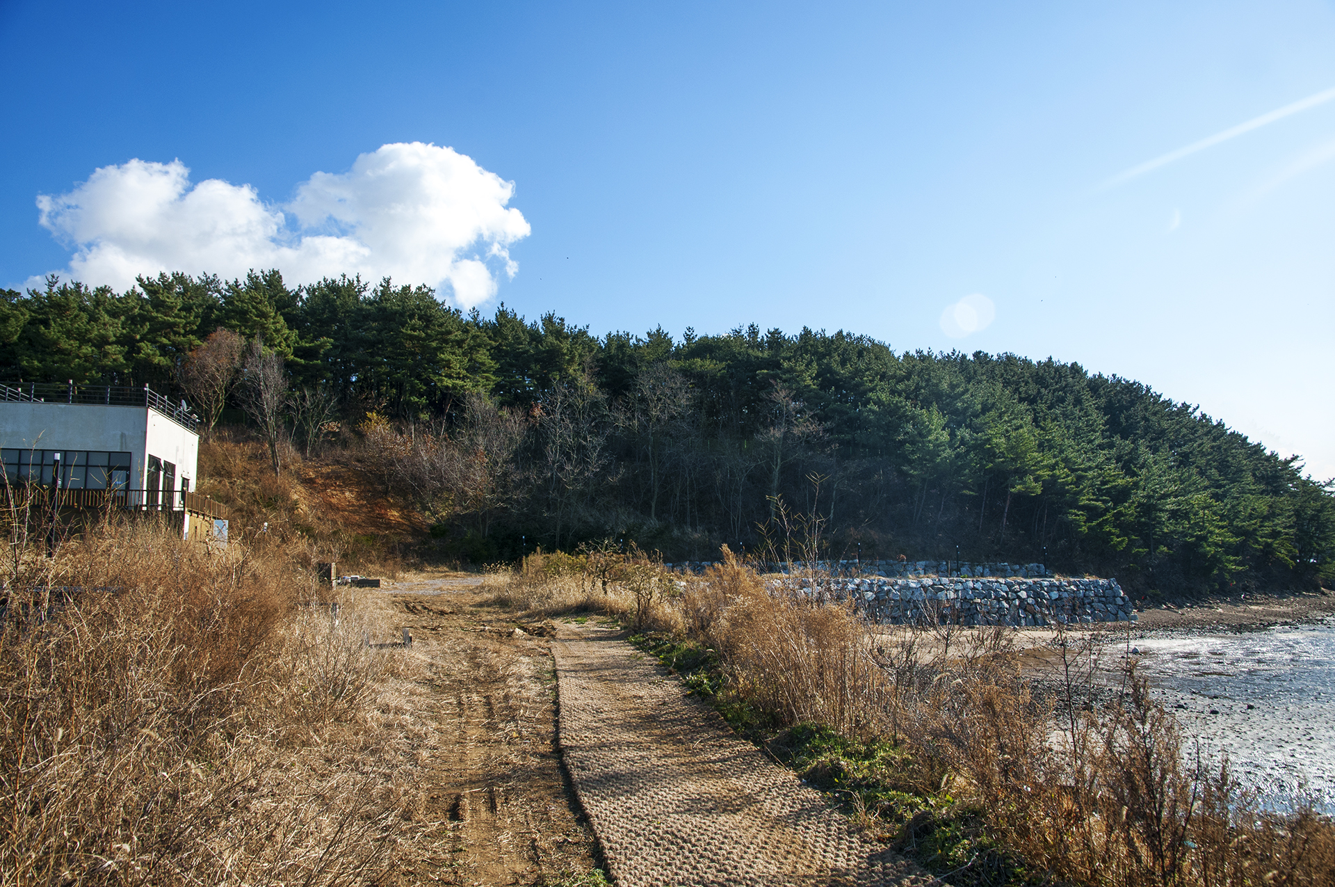 중간 지점에 바다를 조망할수 있는 쉼터가 조성되어 있어 쉬어가기 좋은 곳이다. 이 길을 따라 산이 있는 앞쪽까지 진행한뒤 해안가로 내려가면 된다.