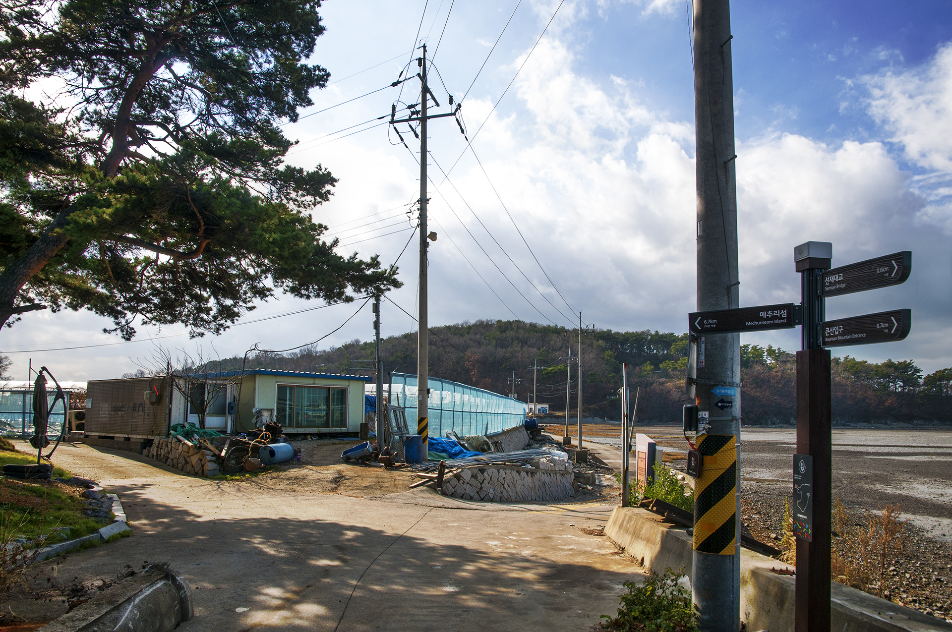 * 이 지점이 중요한 이유는 만조시에는 직진방향으로 1km정도 걸어가면 길이 물에 잠기는 구간이 나오게 되는데, 그때는 이곳에서 아예 우회로인 좌측길로 가야한다. 서해레미콘을 지나 흘곶길로 들어선뒤 집너머길로 걸어야 한다. (코스지도 참고)