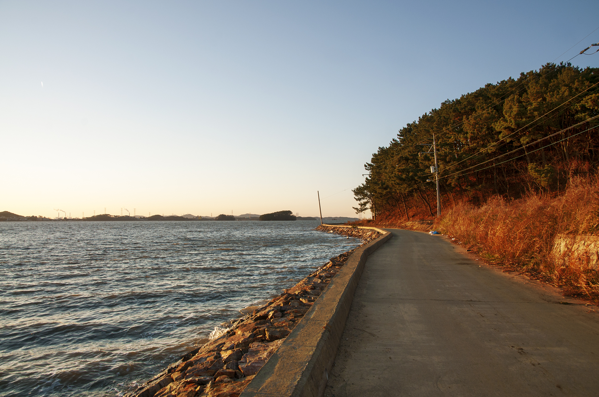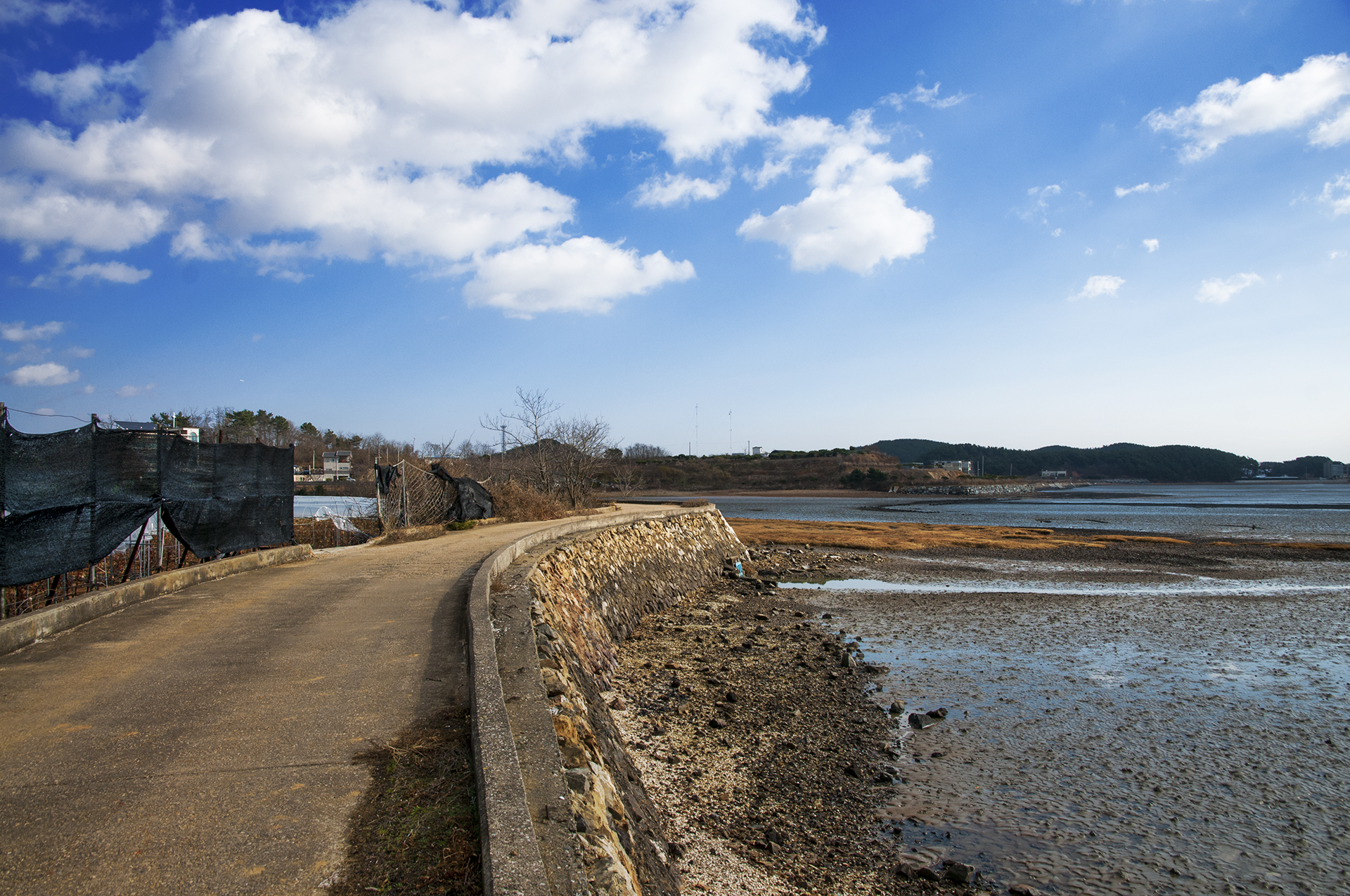 방조제에 앉아 계시던 어르신께 이 길을 여쭤보니 물이 빠지면 저 앞에 섬까지 걸어갈수 있는 길이라고 한다.