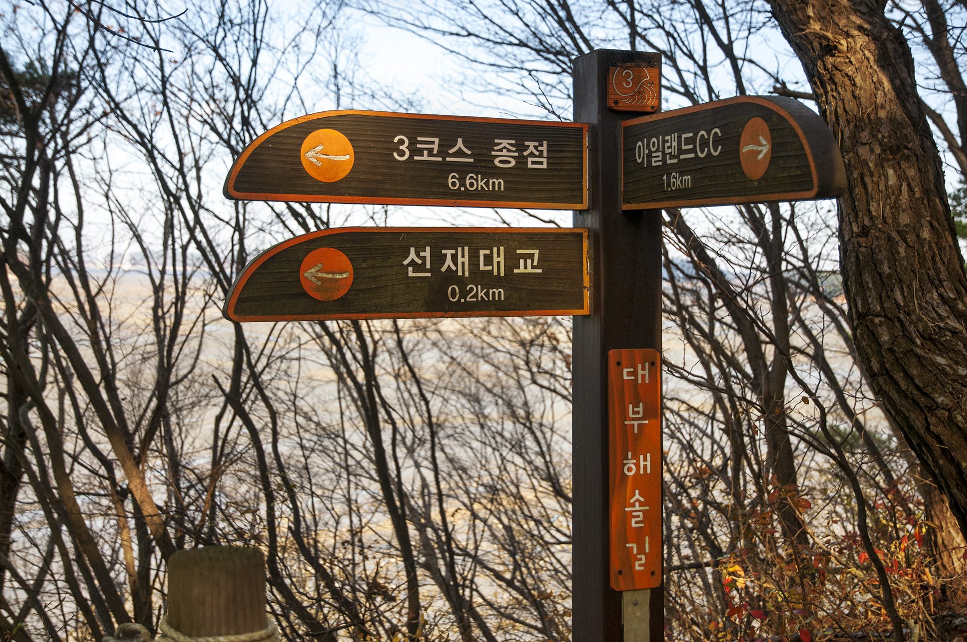 내리막길을 걸으며 나무 사이로 선재대교가 보이기 시작하고, 이정표를 만나게 되면 큰산을 다 넘어온 것이다.