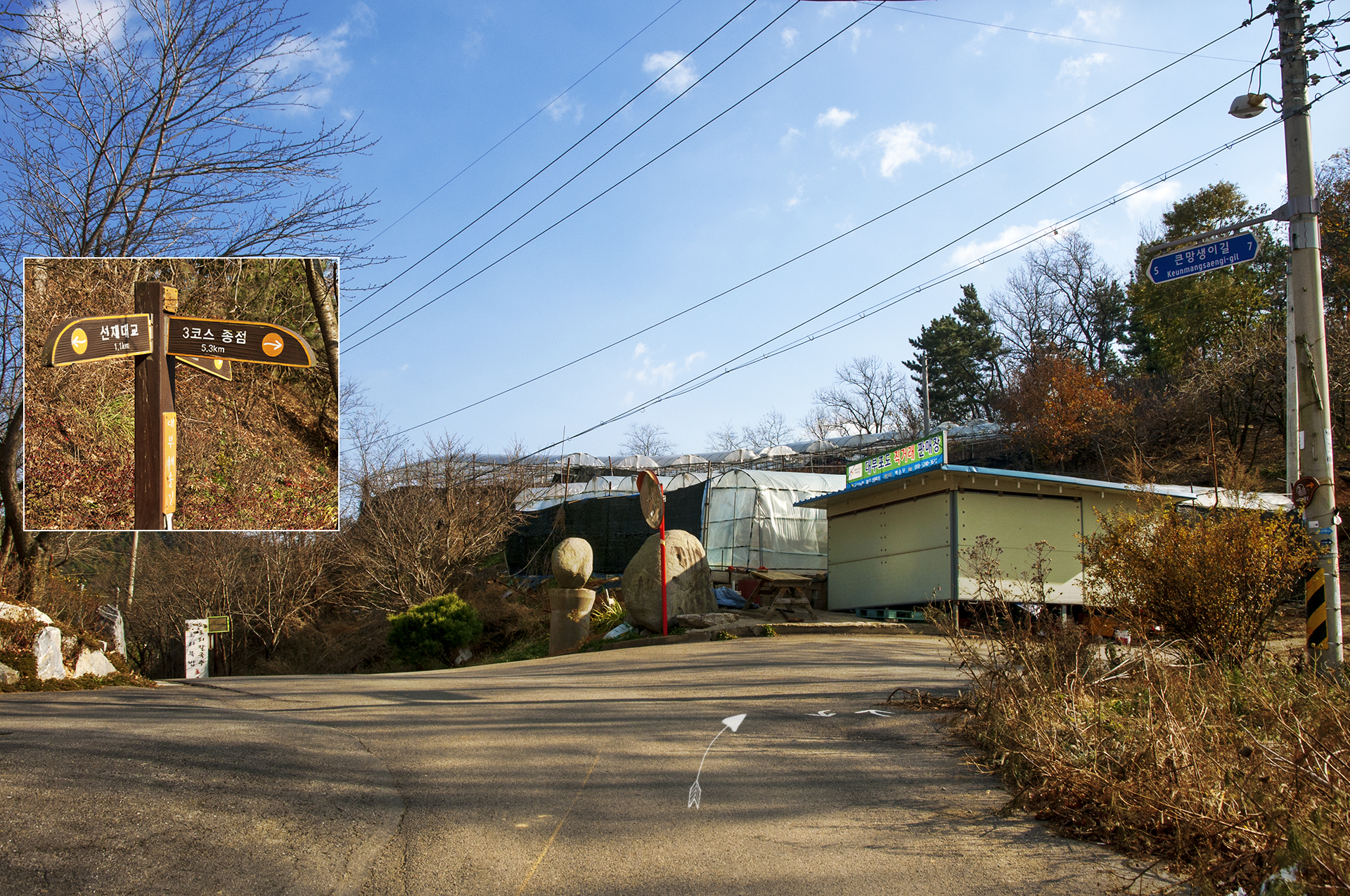 조금 더 진행해 예담쌈밥을 지나 극동방송 송신소 안내판이 보이고, 도로에서 우측길(전통찻집 차다옴이 보이는 길)로 들어서면 종점까지 2.9km 남았다는 이정표를 확인할수 있다.