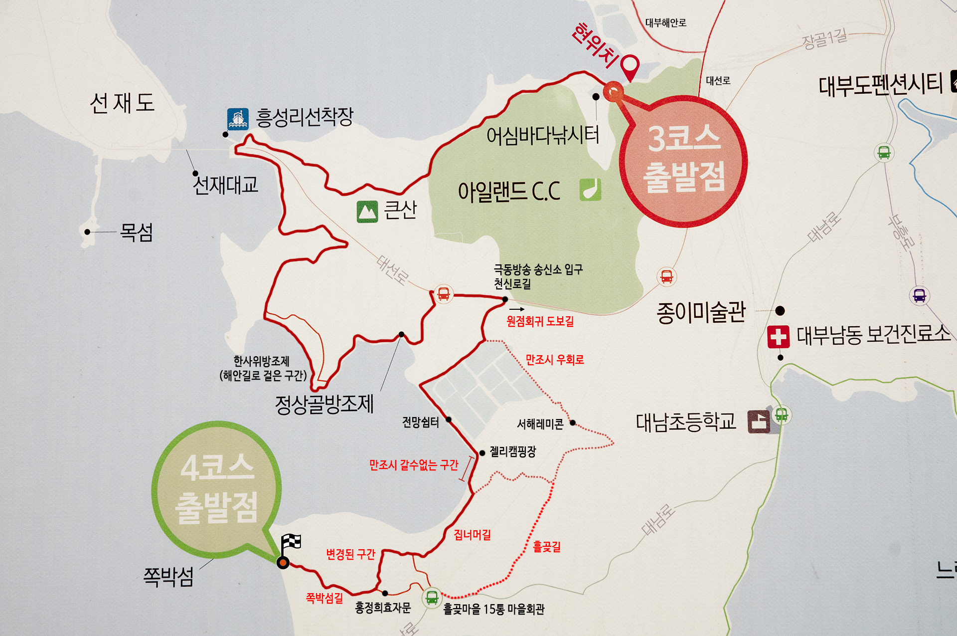 어심낚시터 - 아일랜드C.C - 큰산 - 선재대교 - 한사위방조제 - 정상골방조제 - 대선로(흥성리) - 천신로길입구 - 전망쉼터 - 젤리캠핑장앞 해안길 - 집너머길 - 쪽박섬길 - 쪽박섬