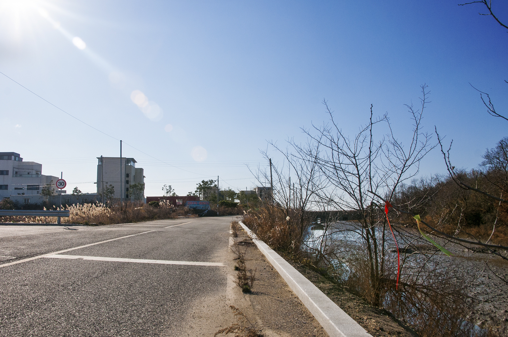 저 끝까지 도로를 따라가면 된다. 이 도로는 차량이 거의 없는 도로이기 때문에 위험하지는 않다.