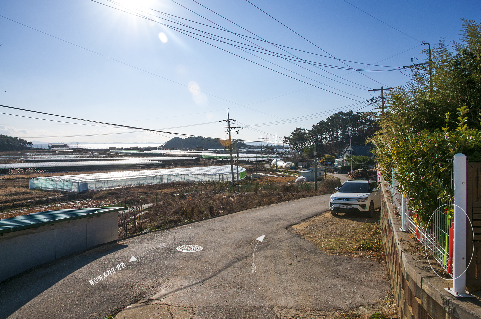 백암농원에서 7~8분 정도 걸어와 바닷가 앞 마지막 집앞을 지나가면 된다.