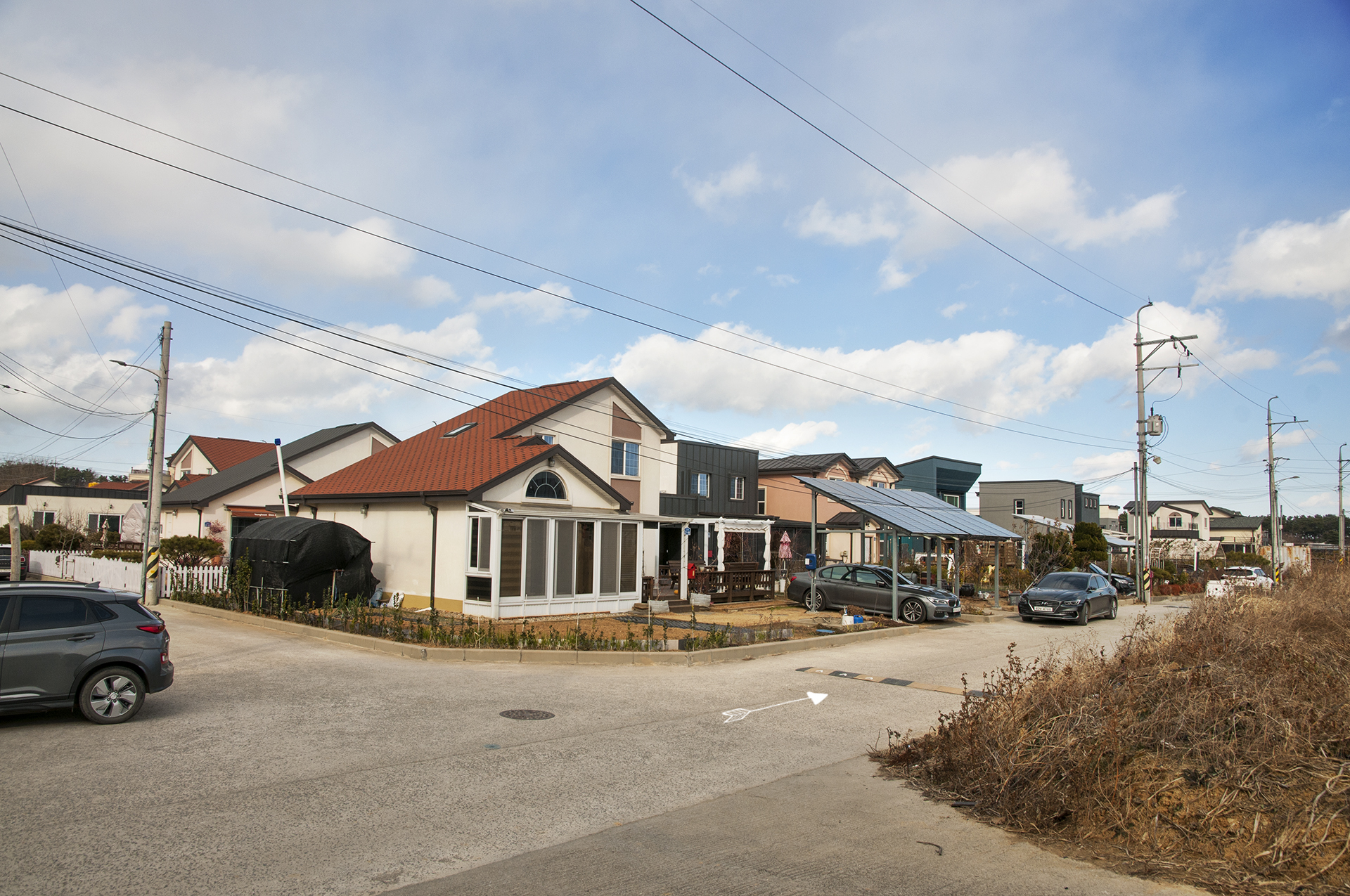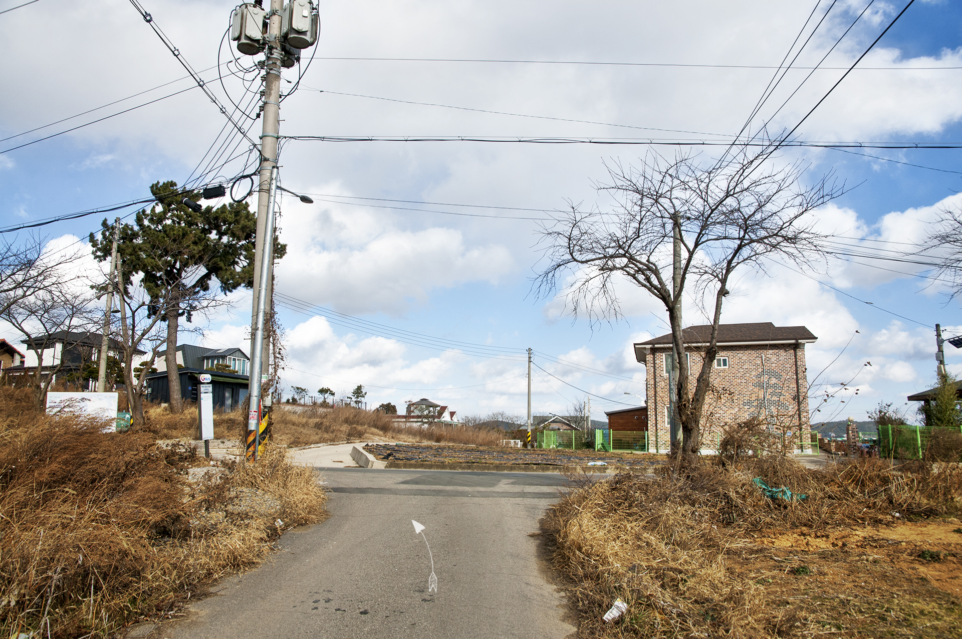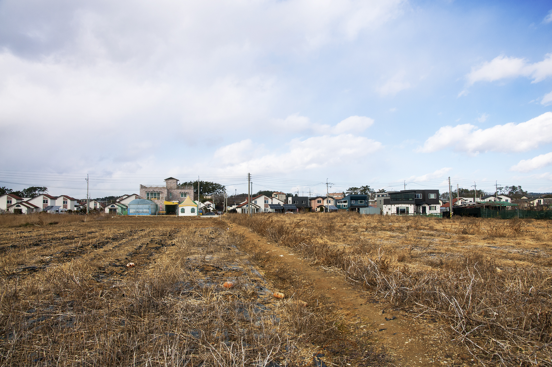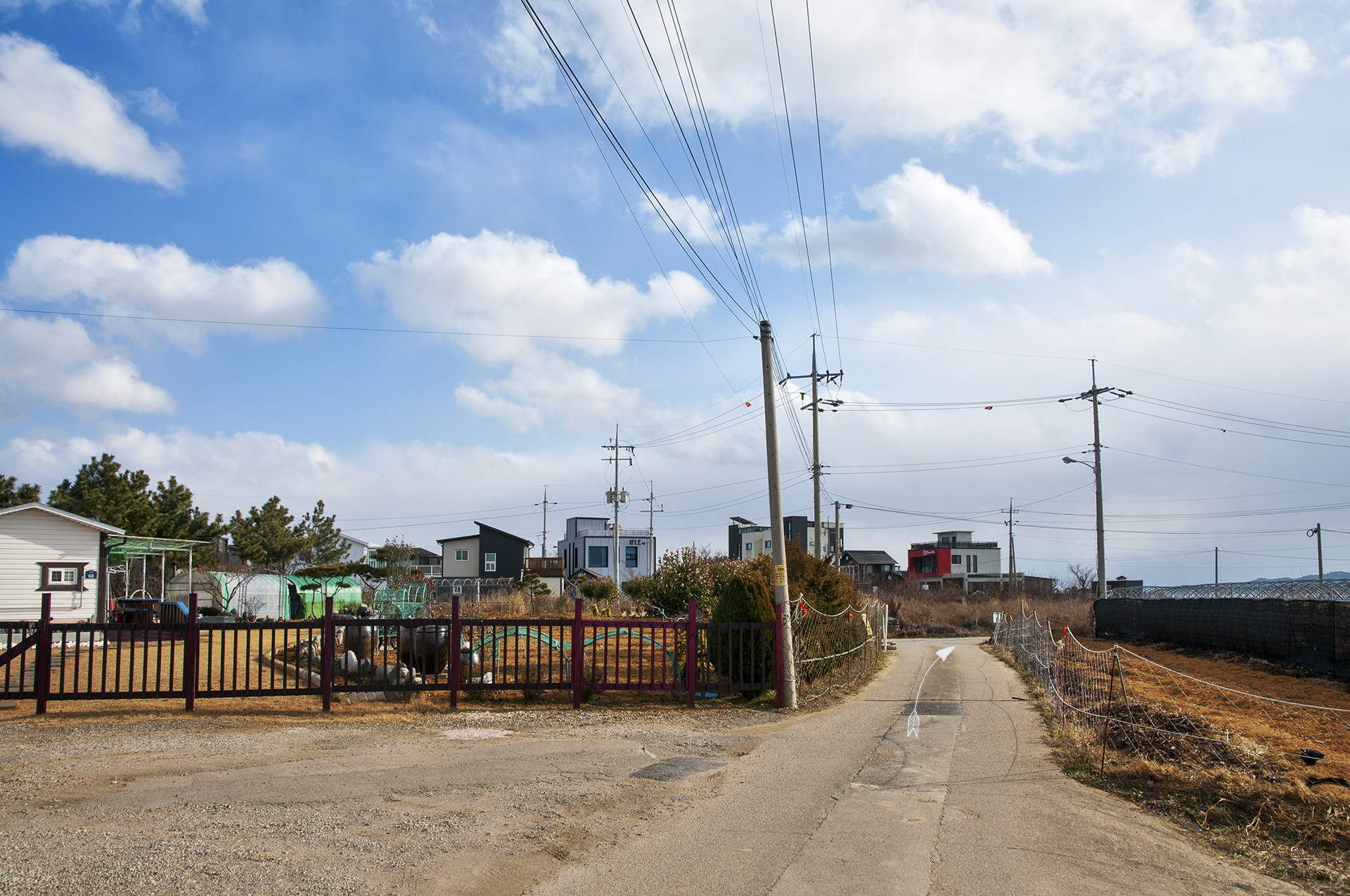 길이 끝나는 이 지점에서 밭을 가로질러 전원주택과 펜션이 즐비한 저 길로 나가야 한다.
