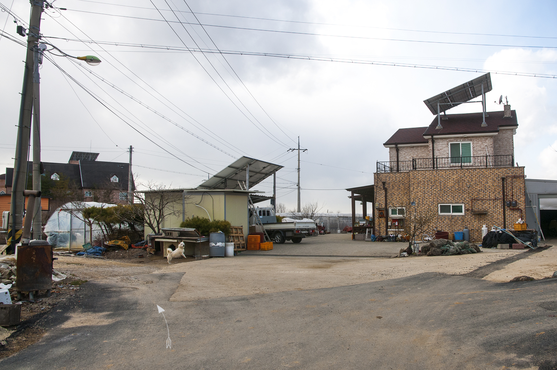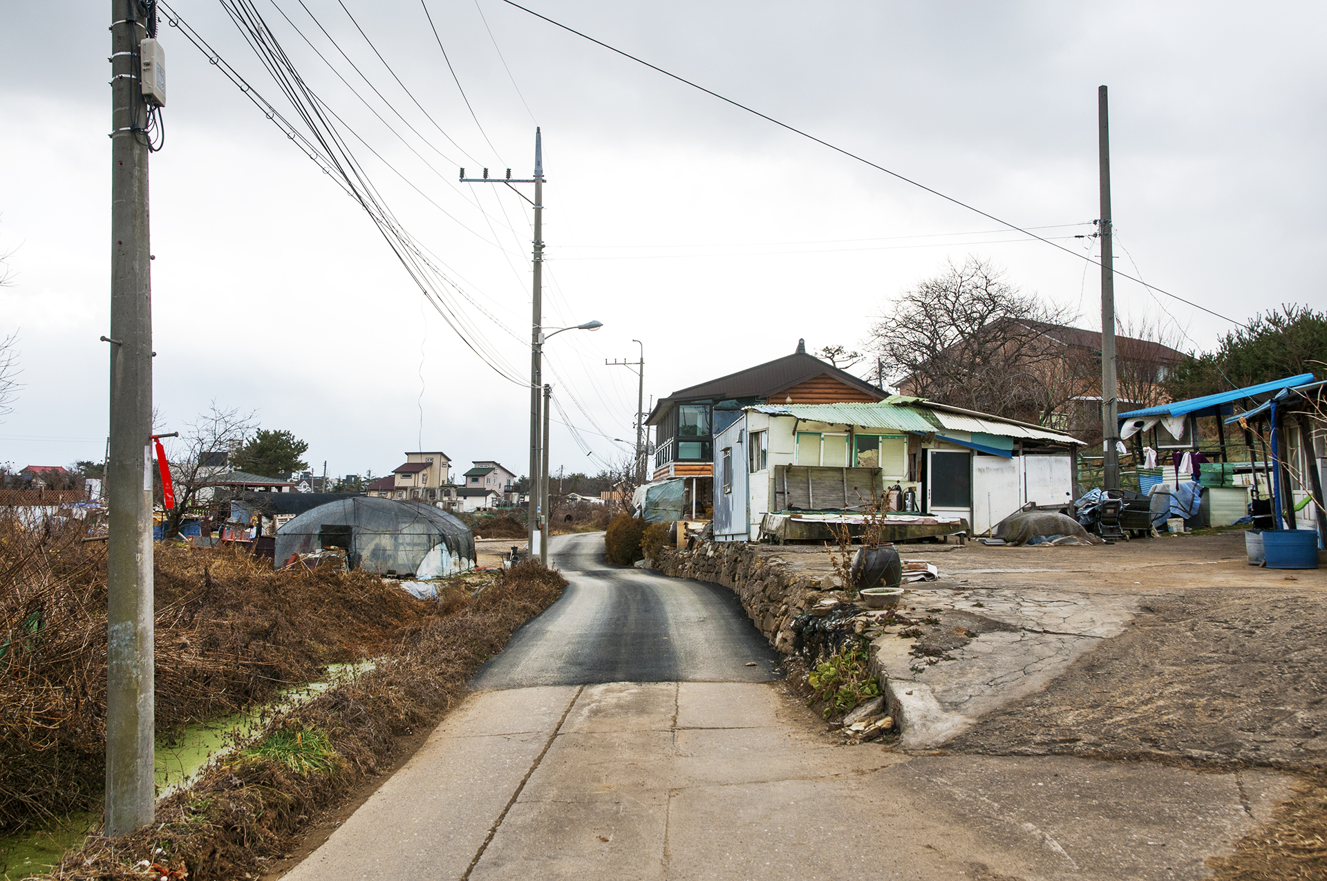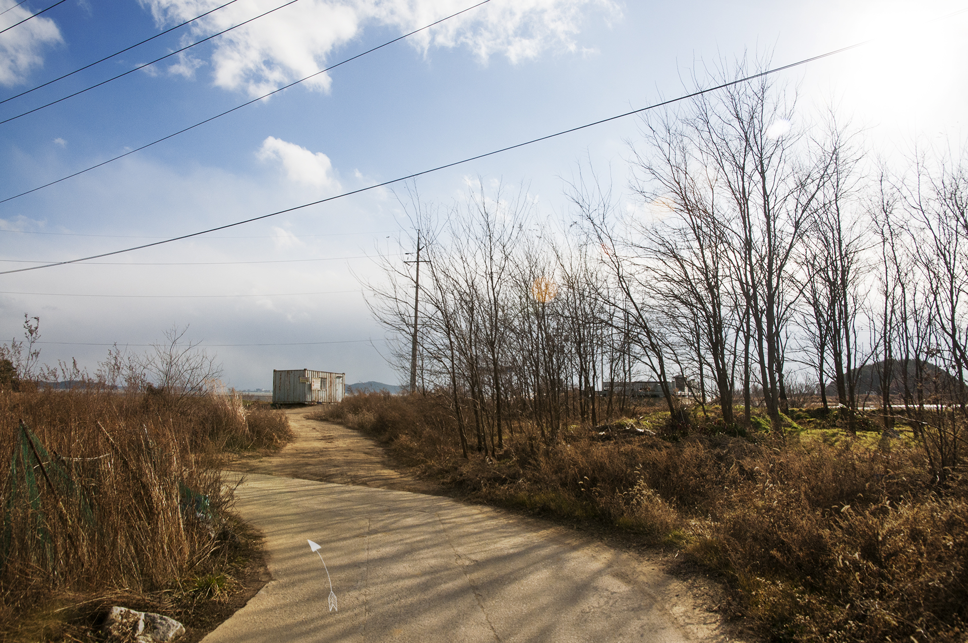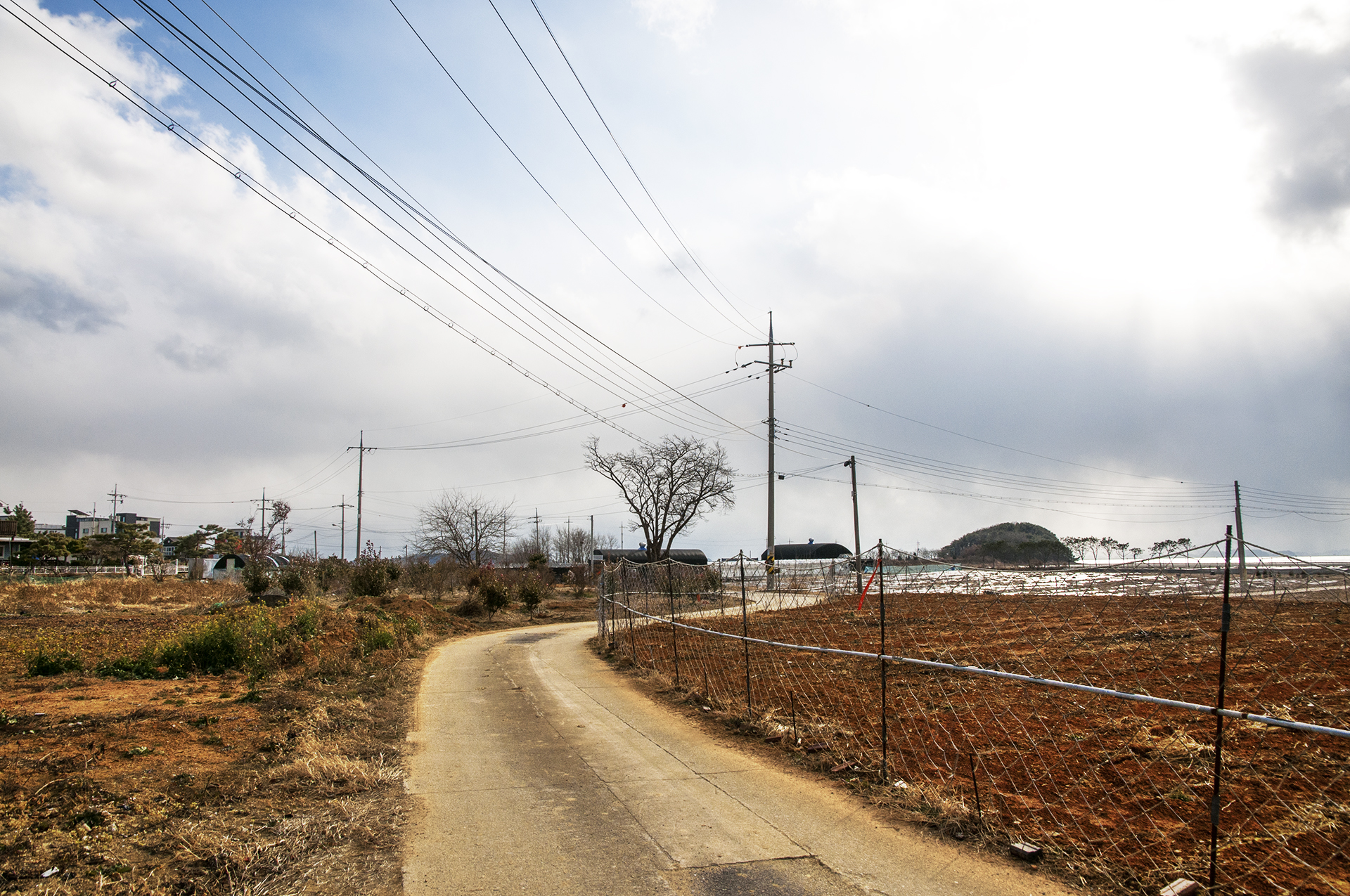 길이 끝나는 이 지점에서 밭을 가로질러 전원주택과 펜션이 즐비한 저 길로 나가야 한다.