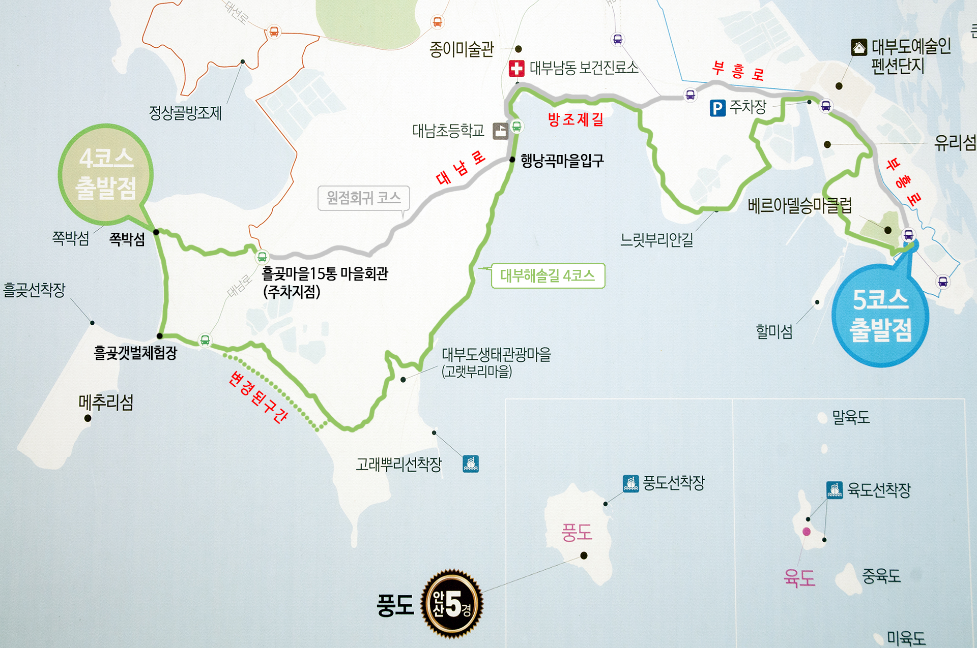 * 원점회귀(도보) : 4코스종점 - 부흥로 - 방조제길 - 대남초교 - 대남로 - 15통마을회관 (6.5km, 1시간30분소요)