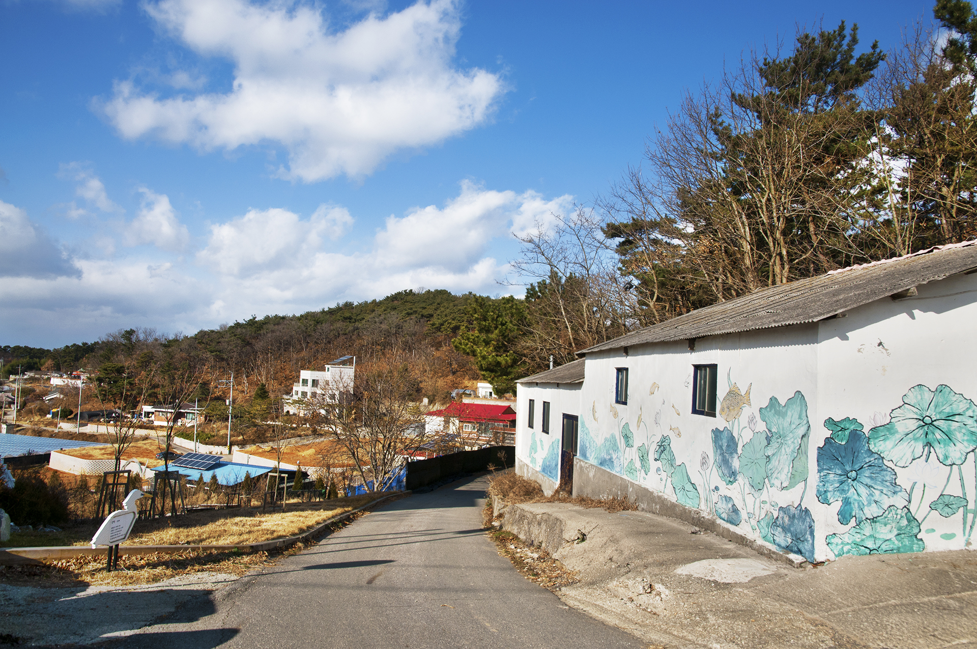 이곳은 행낭곡 마을로 저 앞까지 나가면 도로와 만나게 된다. "어서오세요"라는 짧은 문구가 도보여행자들의 힘이 되어 준다.