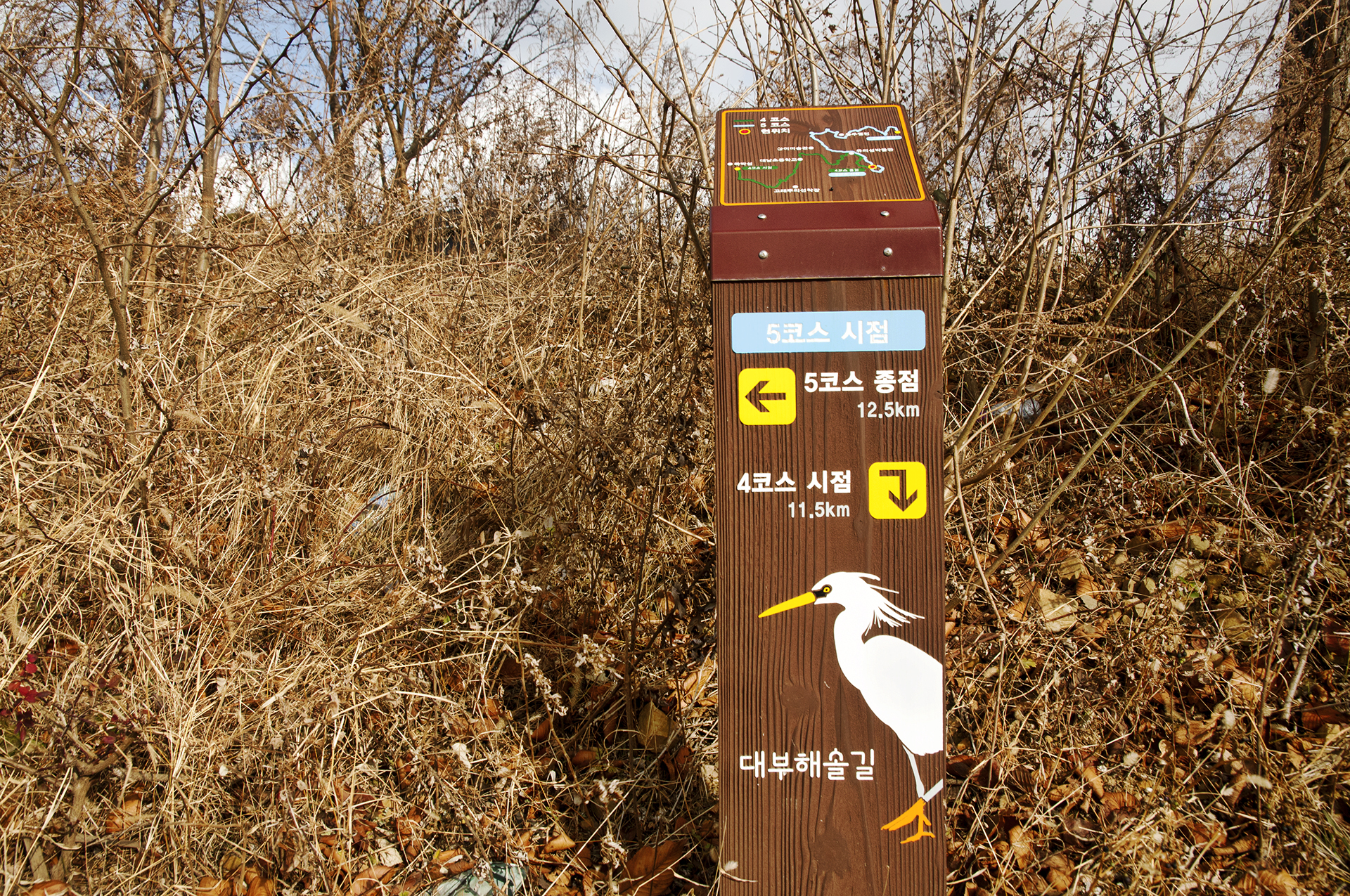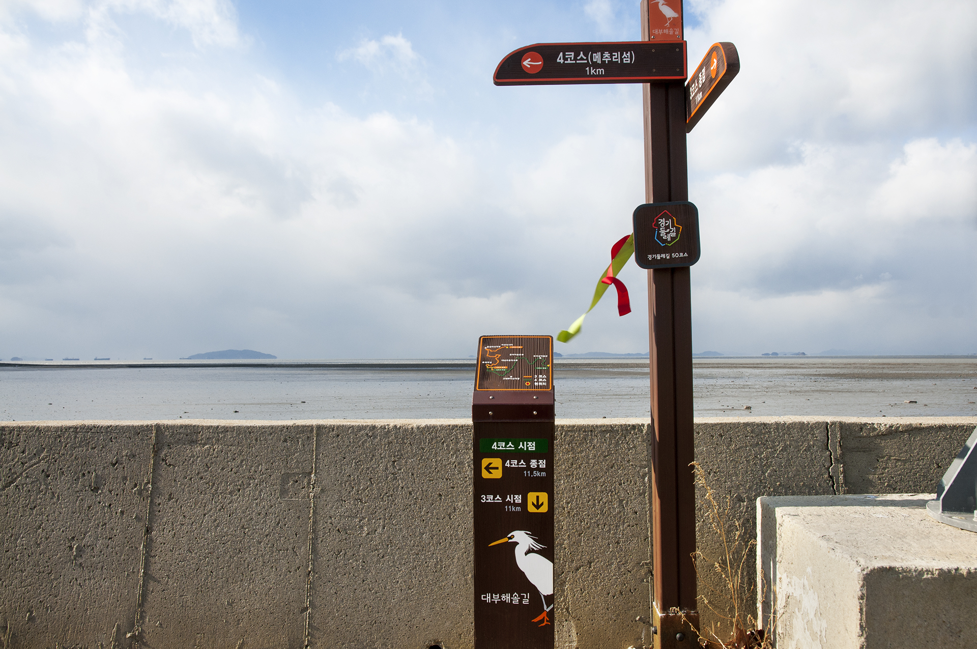 대부해솔길임을 알려주는 노랑부리 백로, 부리가 가리키는 곳이 가야할 방향이다.