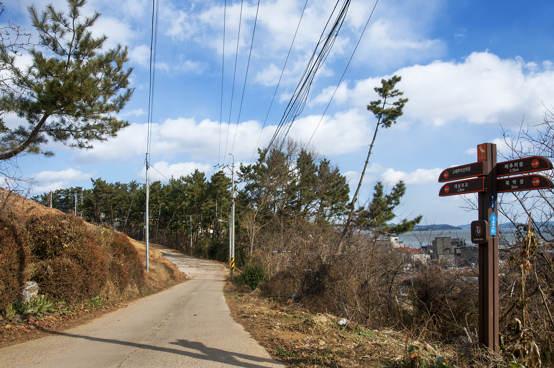 ㅏ자형 삼거리에서 우측방향 고랫부리길을 걸어 해안가까지 나가면 된다. 대남초교까지 이제 2.2km 남았다.