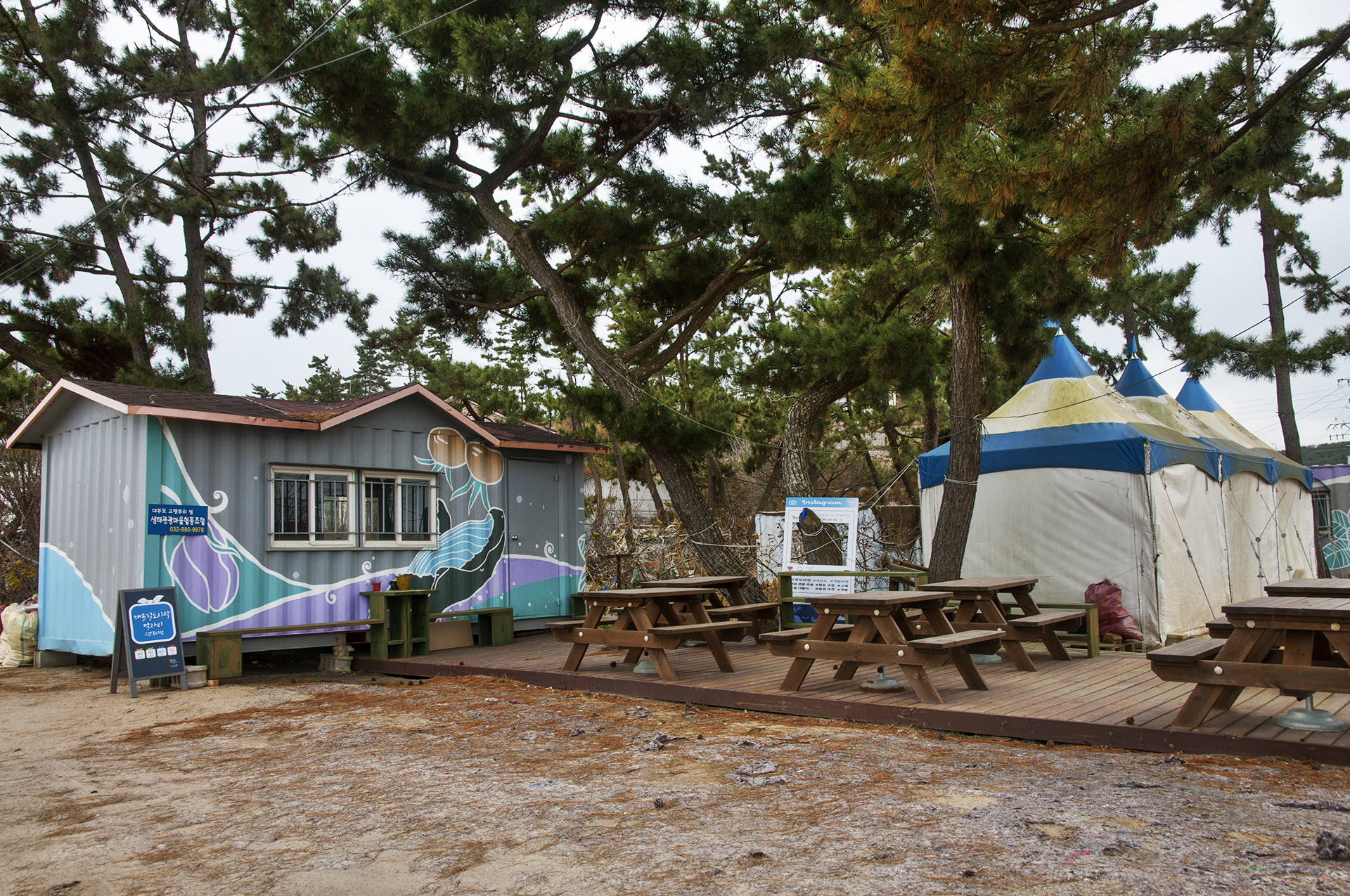 고래 그림이 그려져 있는 생태관광마을협동조합 콘테이너에 도착,