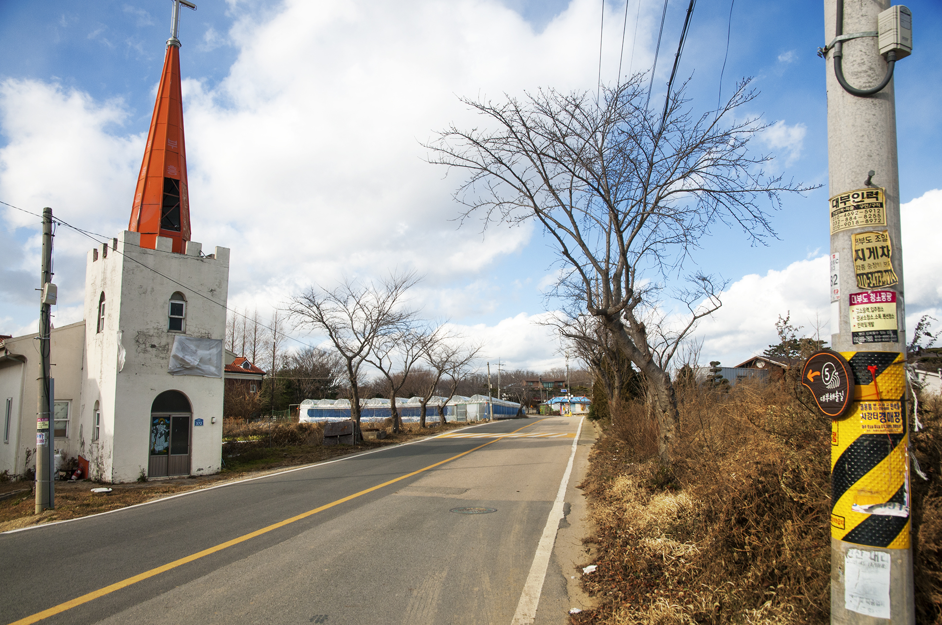문을 닫은채 관리가 안되어 있는 부흥교회를 지나는 중, 이 길은 5코스이기도 하다.