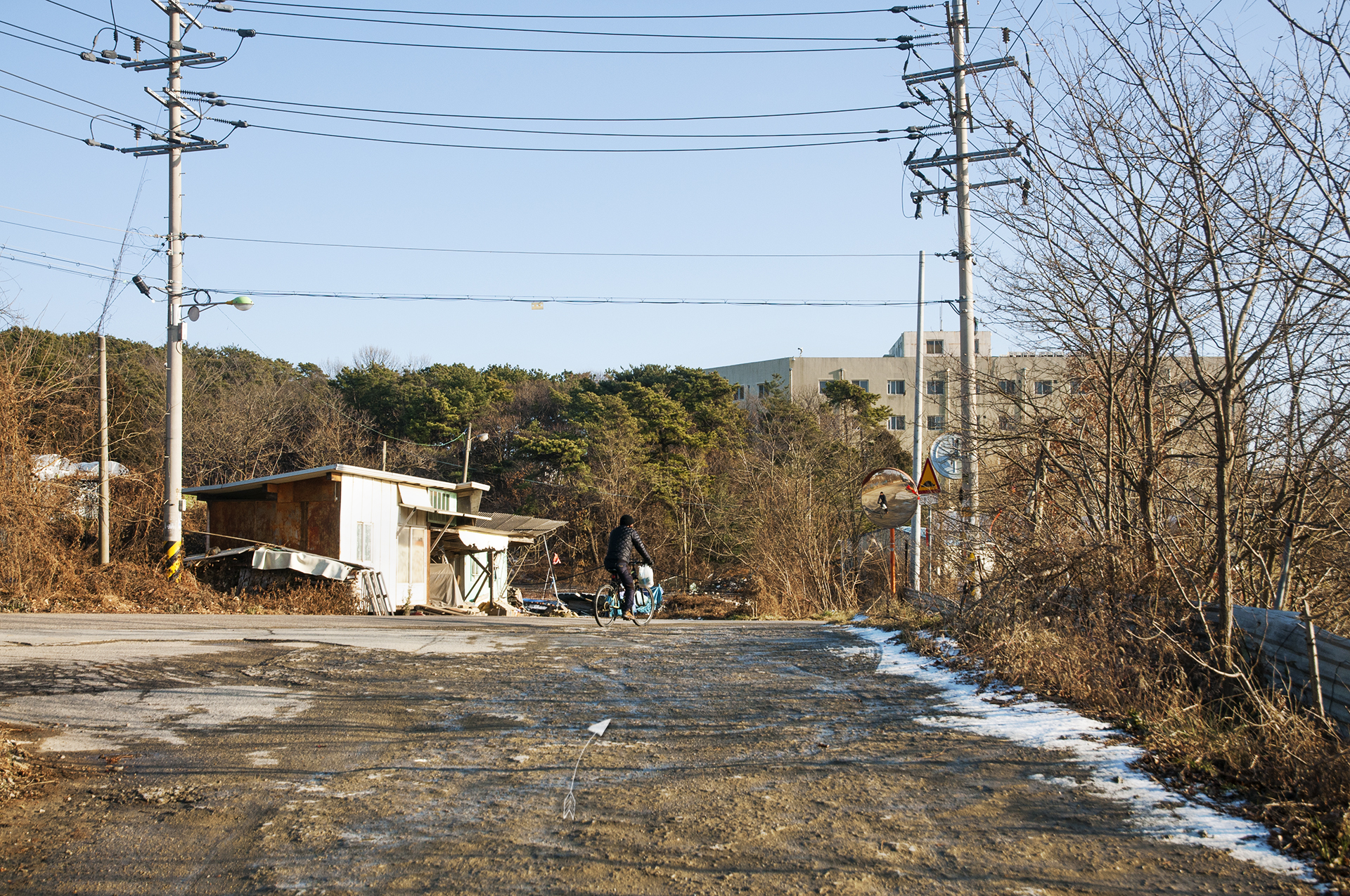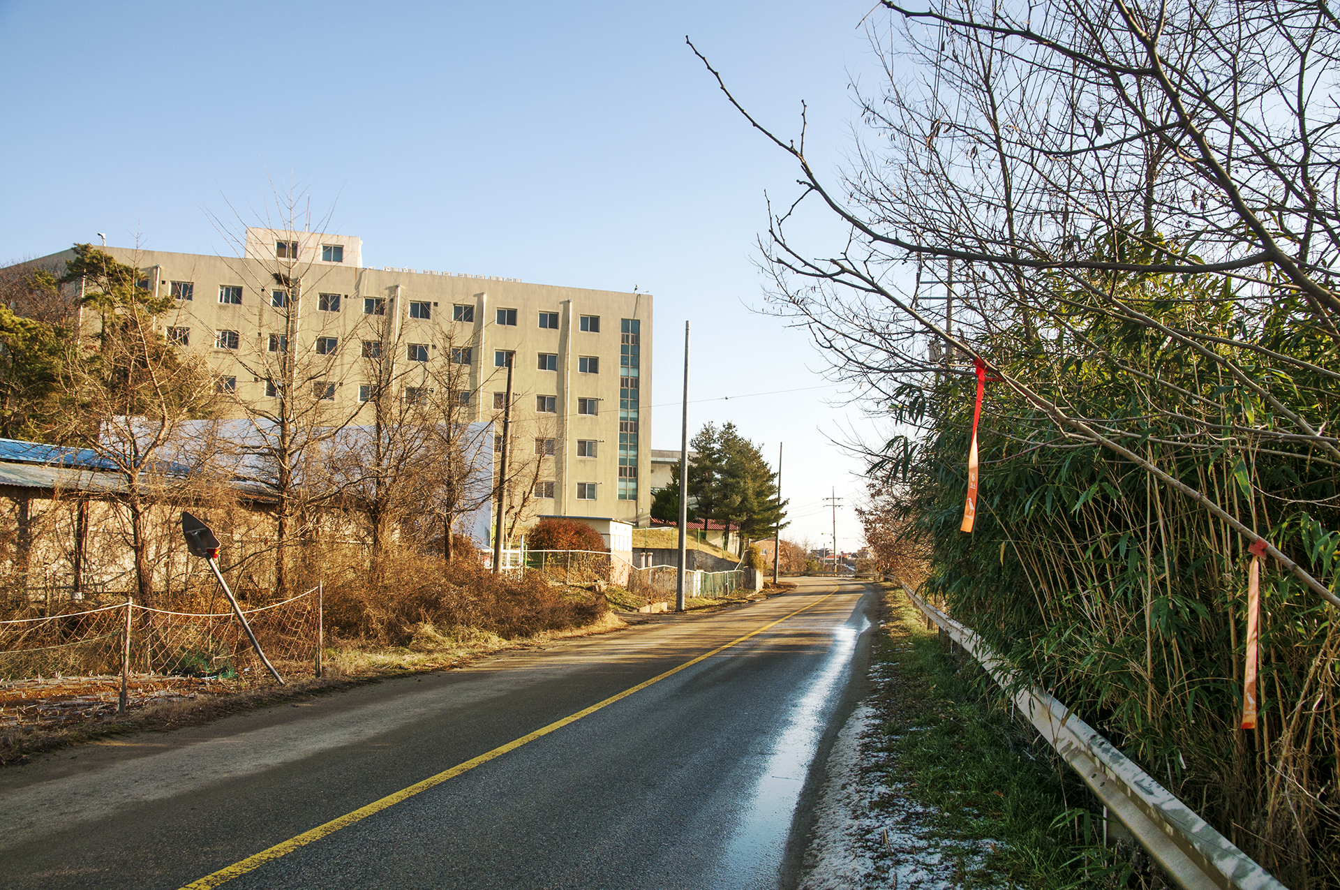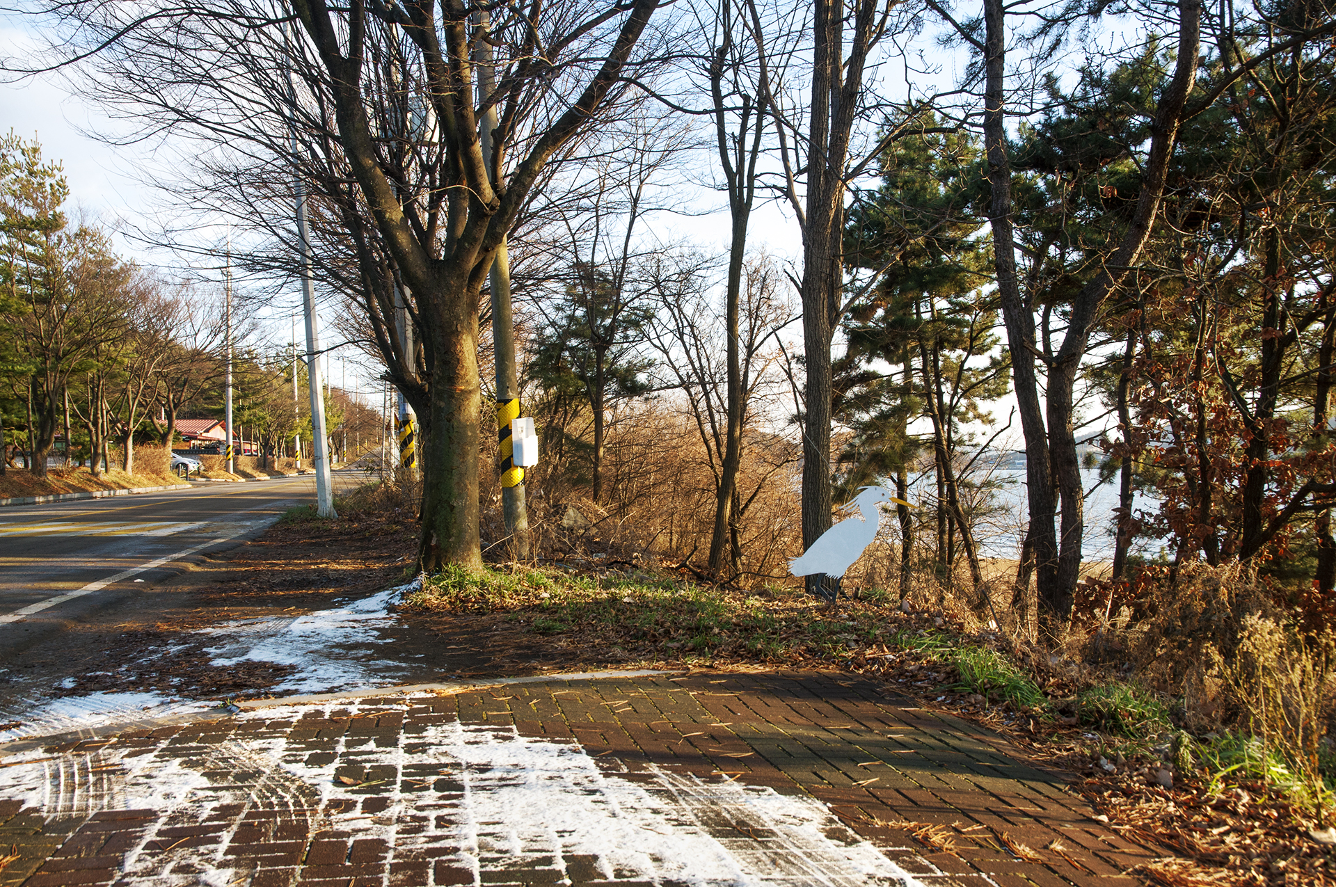 아침에 역방향으로 이 길을 지났었는데 아직도 눈이 녹지 않았다.