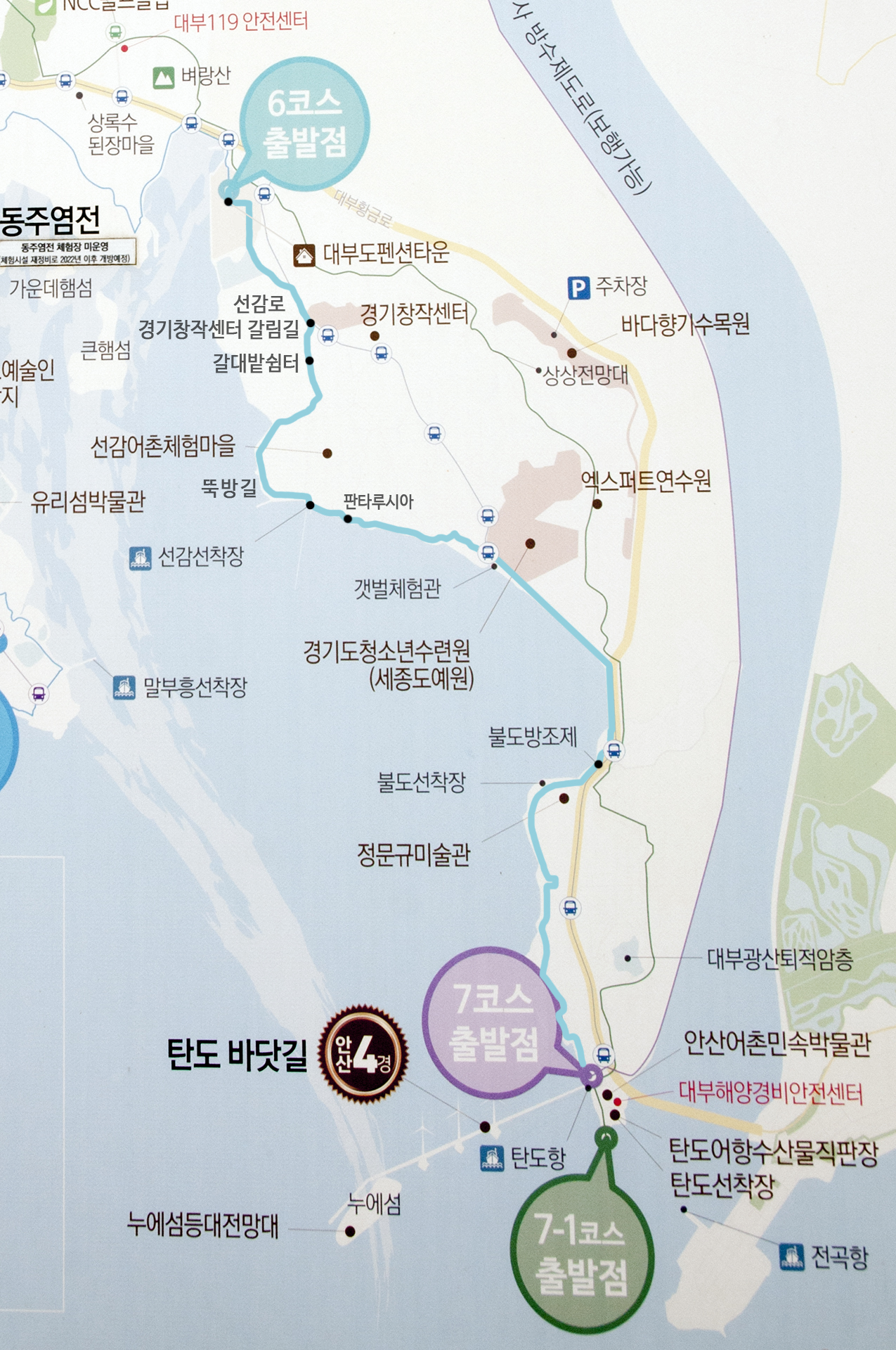 대부도펜션타운 - 경기창작센터 - 황금산 갈대밭 - 뚝방길 - 선감선착장 - 판타루시아 - 경기도청소년수련원 - 불도방조제 - 탄도항