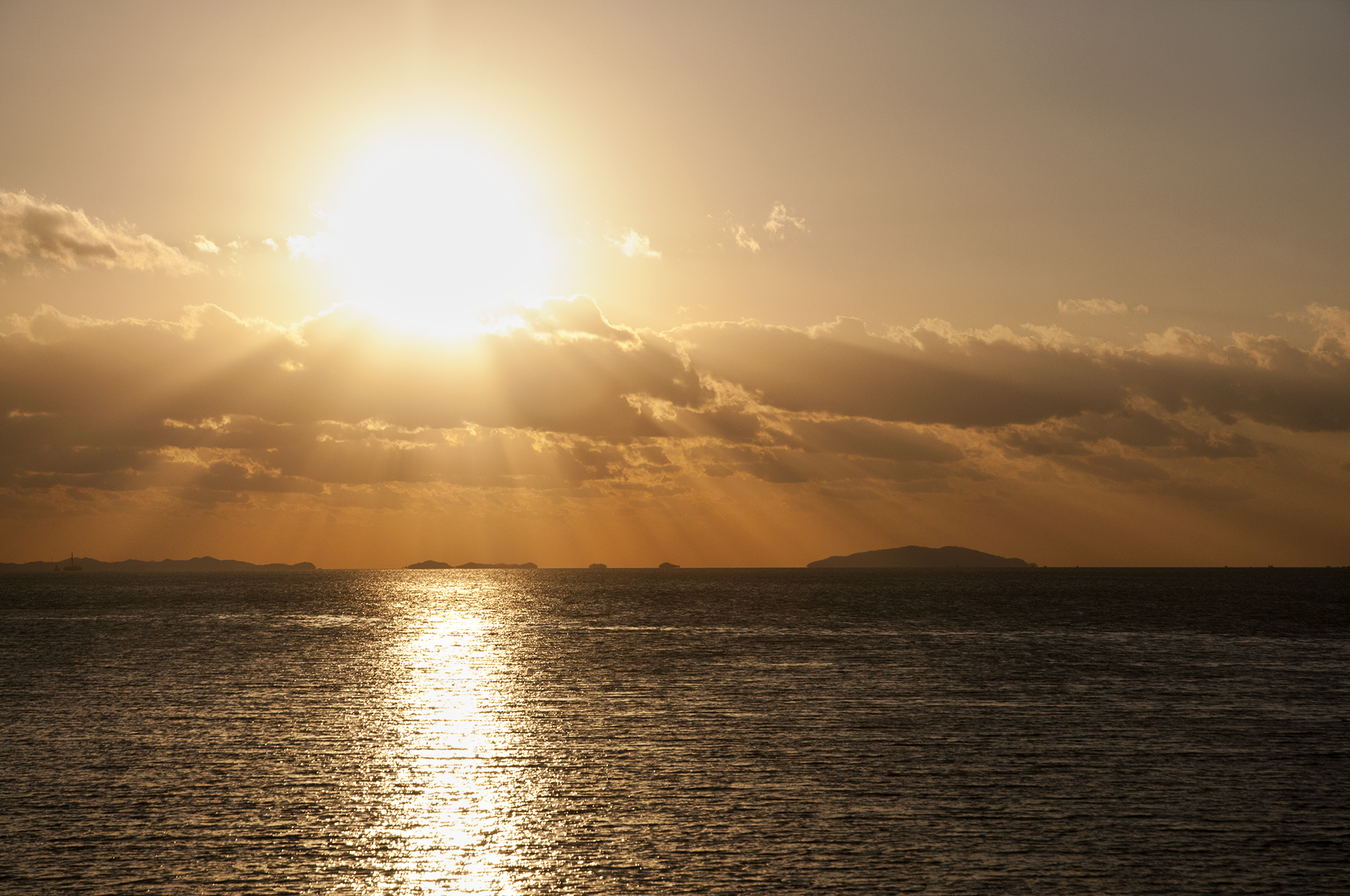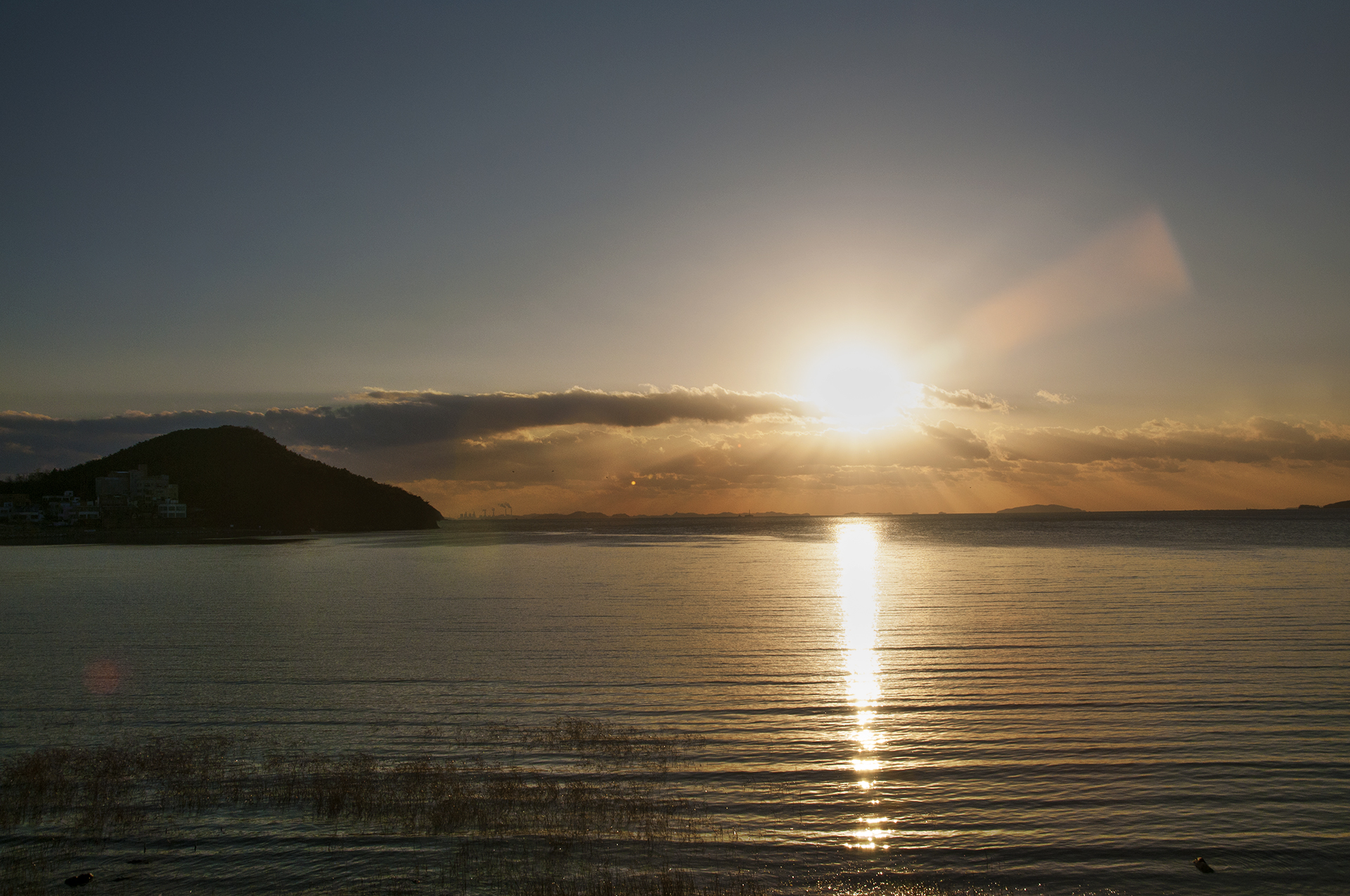 수평선 위로 박무현상도 없는 깨끗한 해넘이, 저 작은 두섬 사이로 떨어지면 좋으련만~