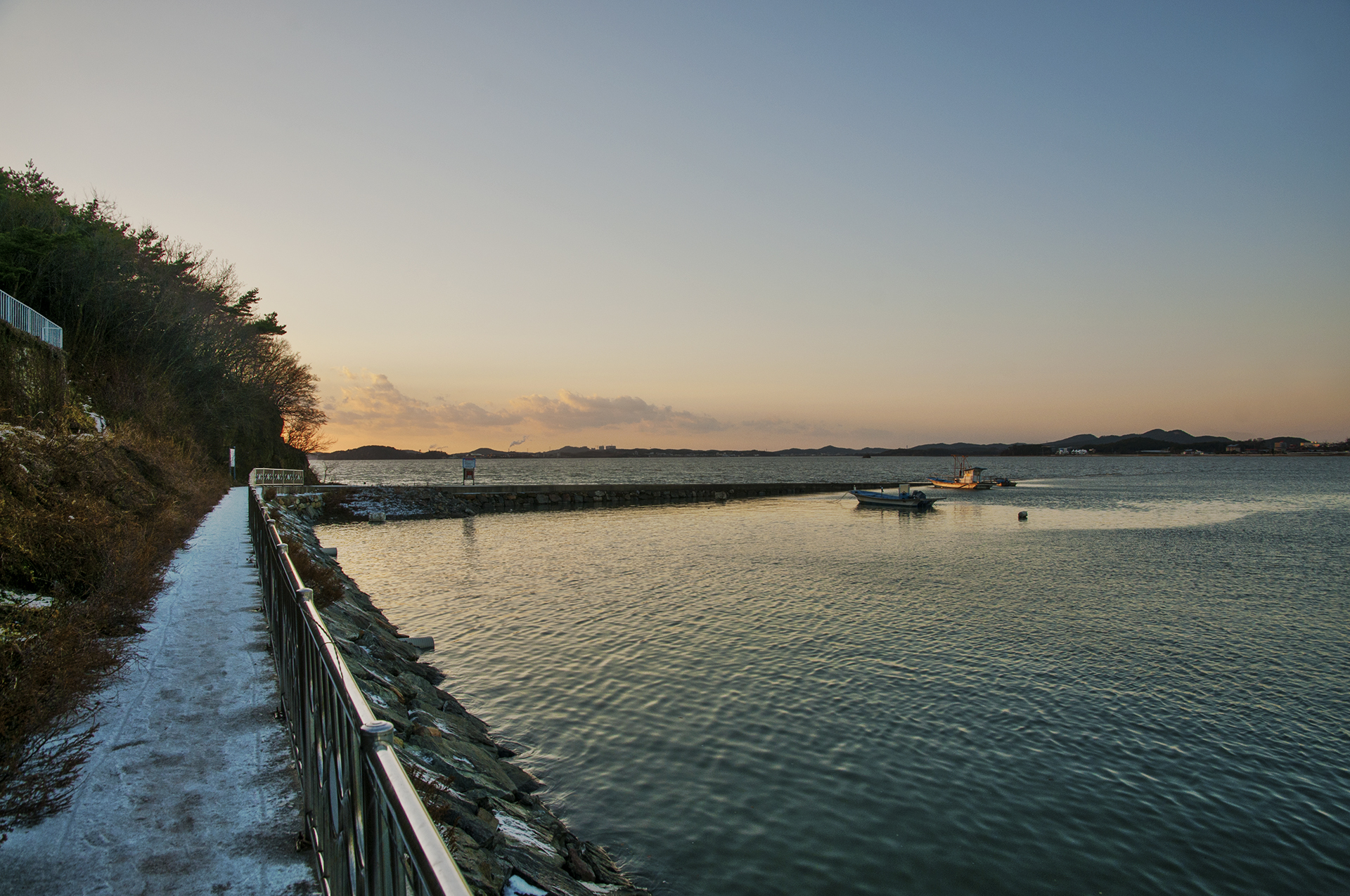 불도방조제에서 바라본 탄도항 방향, 몇분 사이에 노을이 빠르게 물들기 시작한다.