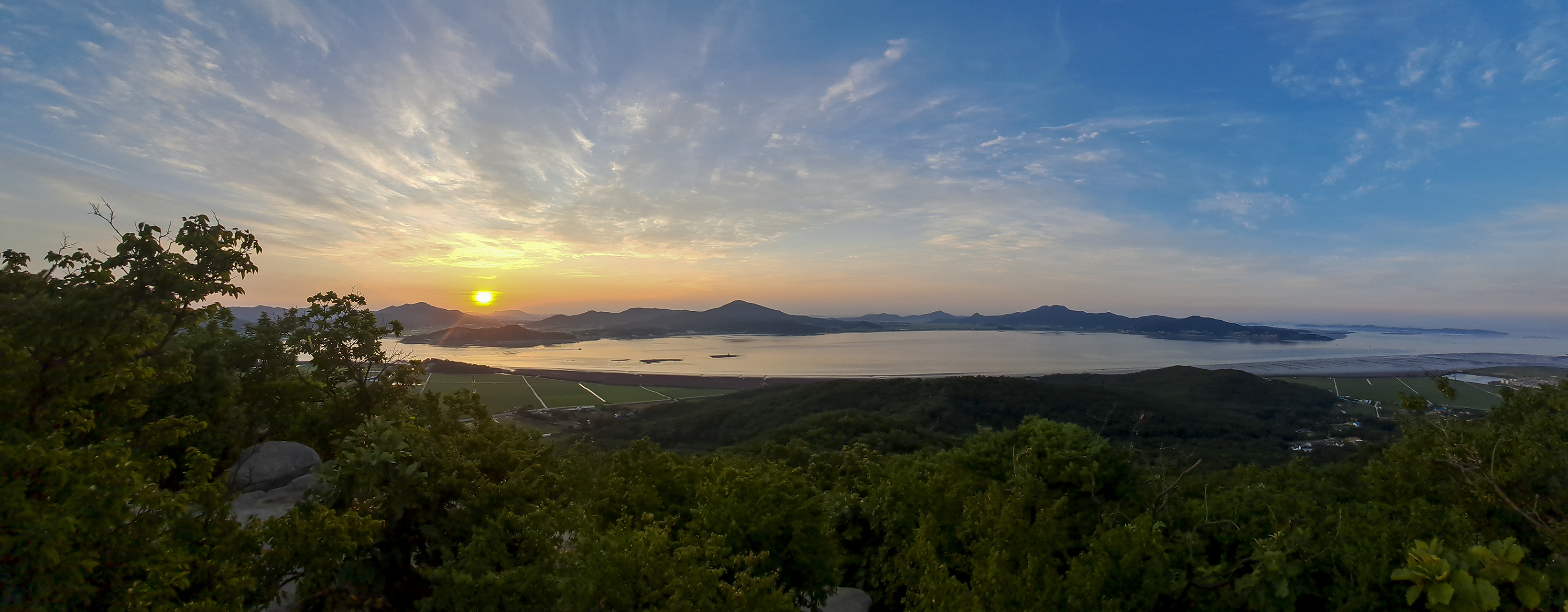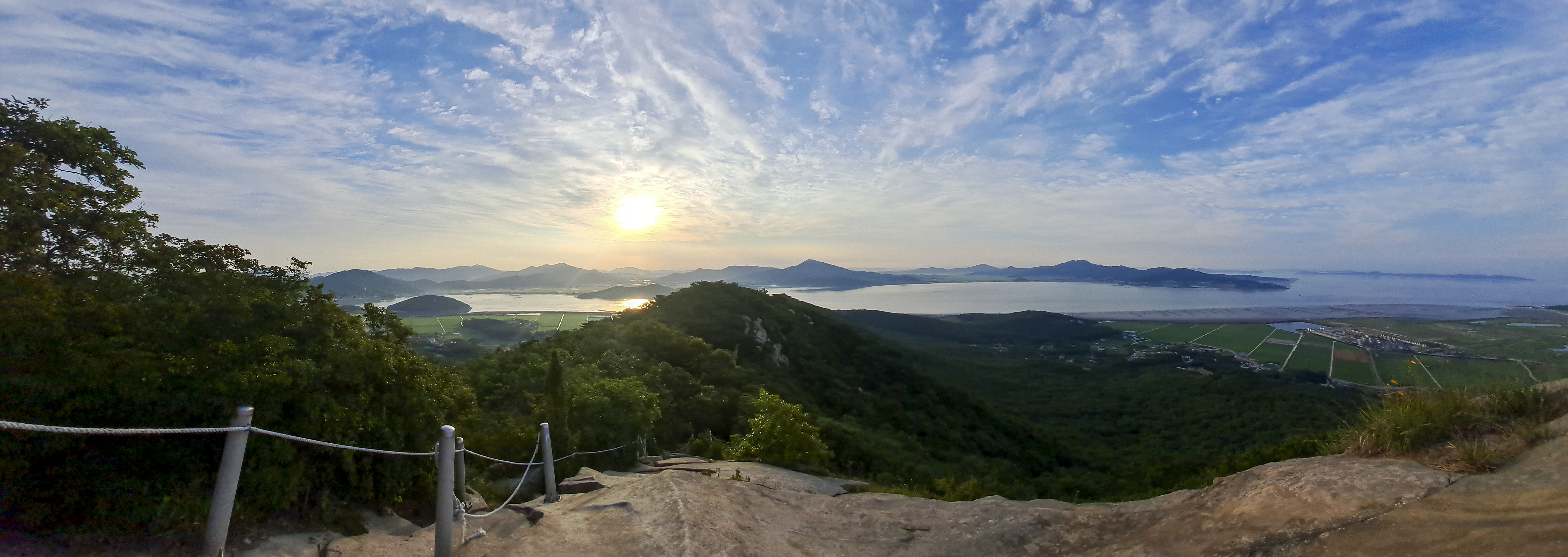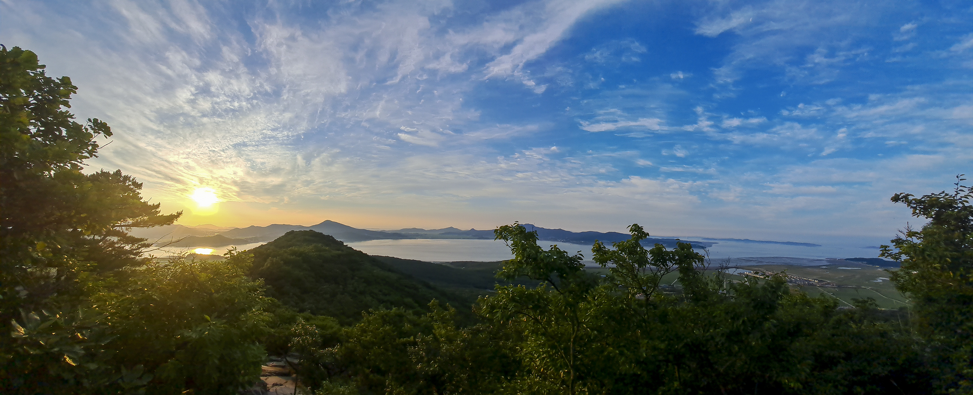 파노라마로 담아본 모습, 6월에는 덕정산과 진강산 옆으로 해가 떠오른다.