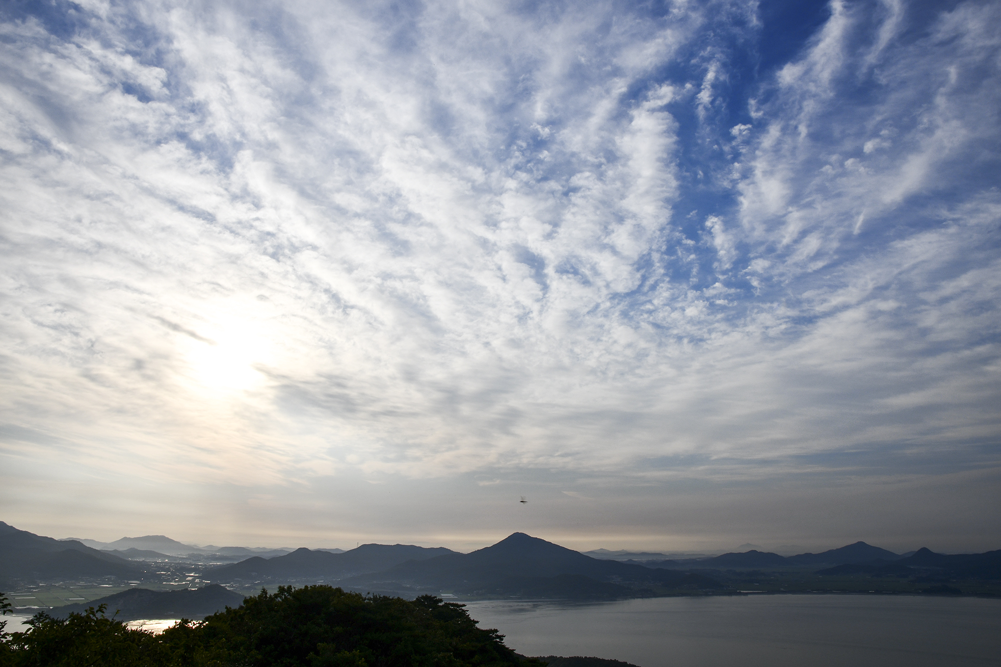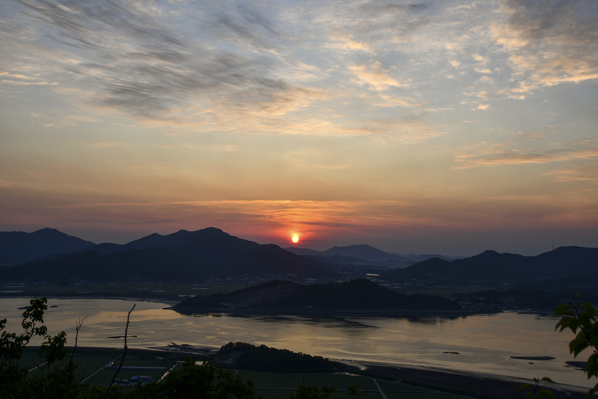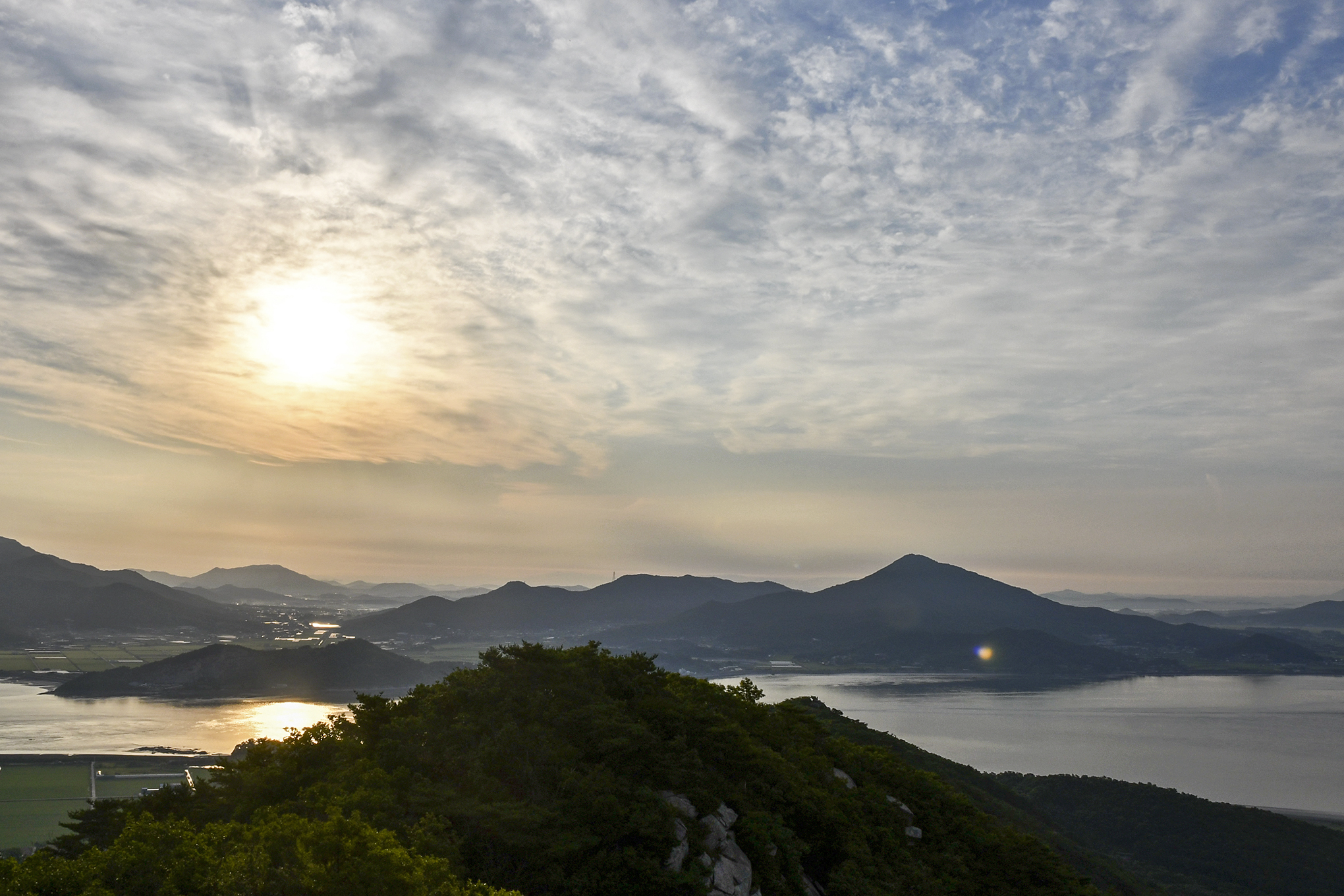 파노라마로 담아본 모습, 6월에는 덕정산과 진강산 옆으로 해가 떠오른다.