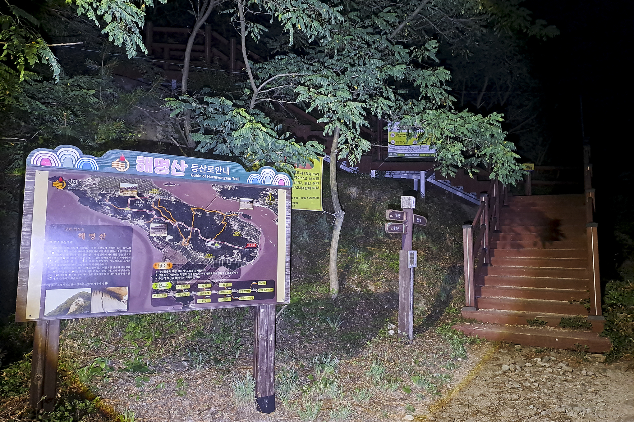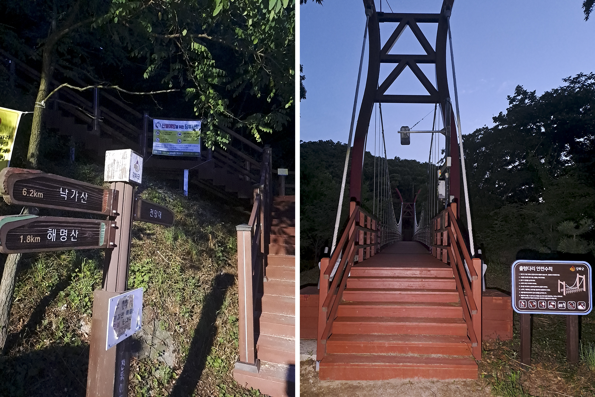 데크계단을 따라 올라가 출렁다리를 건너면 되는데, 이정목에는 낙가산과 해명산이 반대방향으로 표시되어 있다.