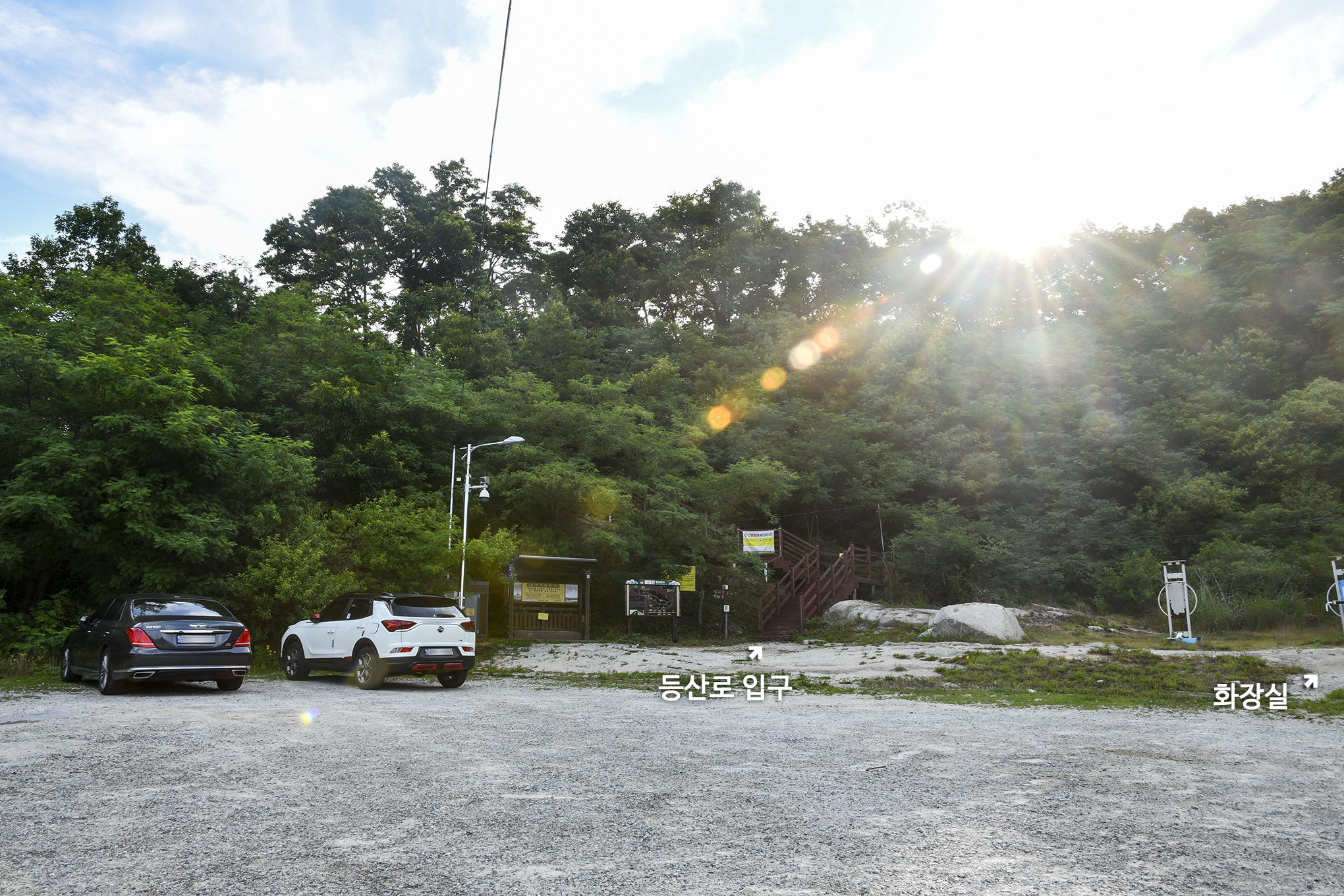 주차장 가장자리에 에어건과 등산안내도가 있고 옆으로 등산로가 바로 시작된다.