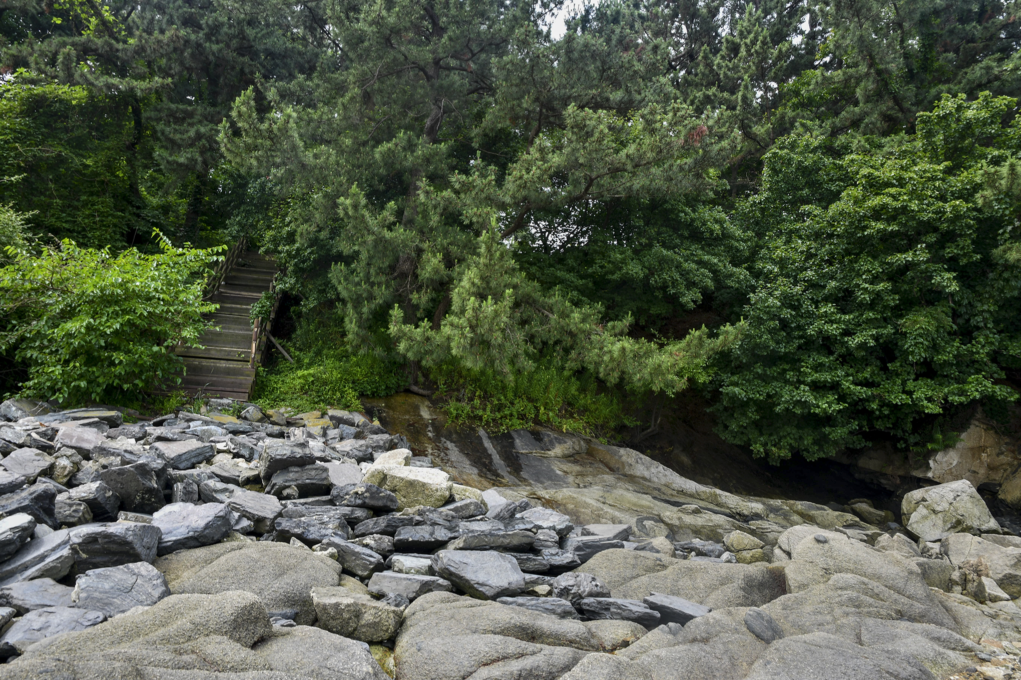 해변 끝에서 숲으로 올라가는 계단이 보인다.