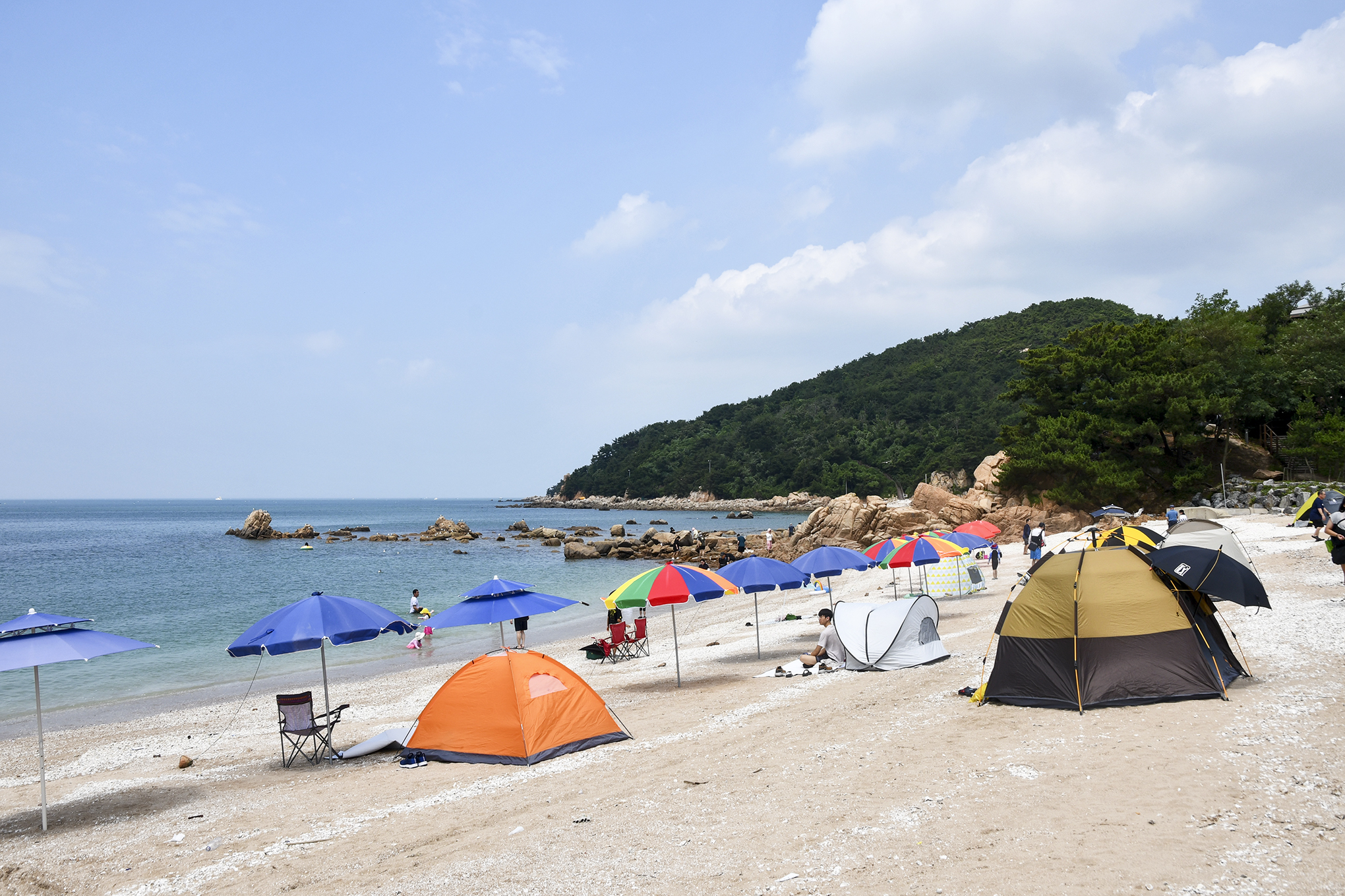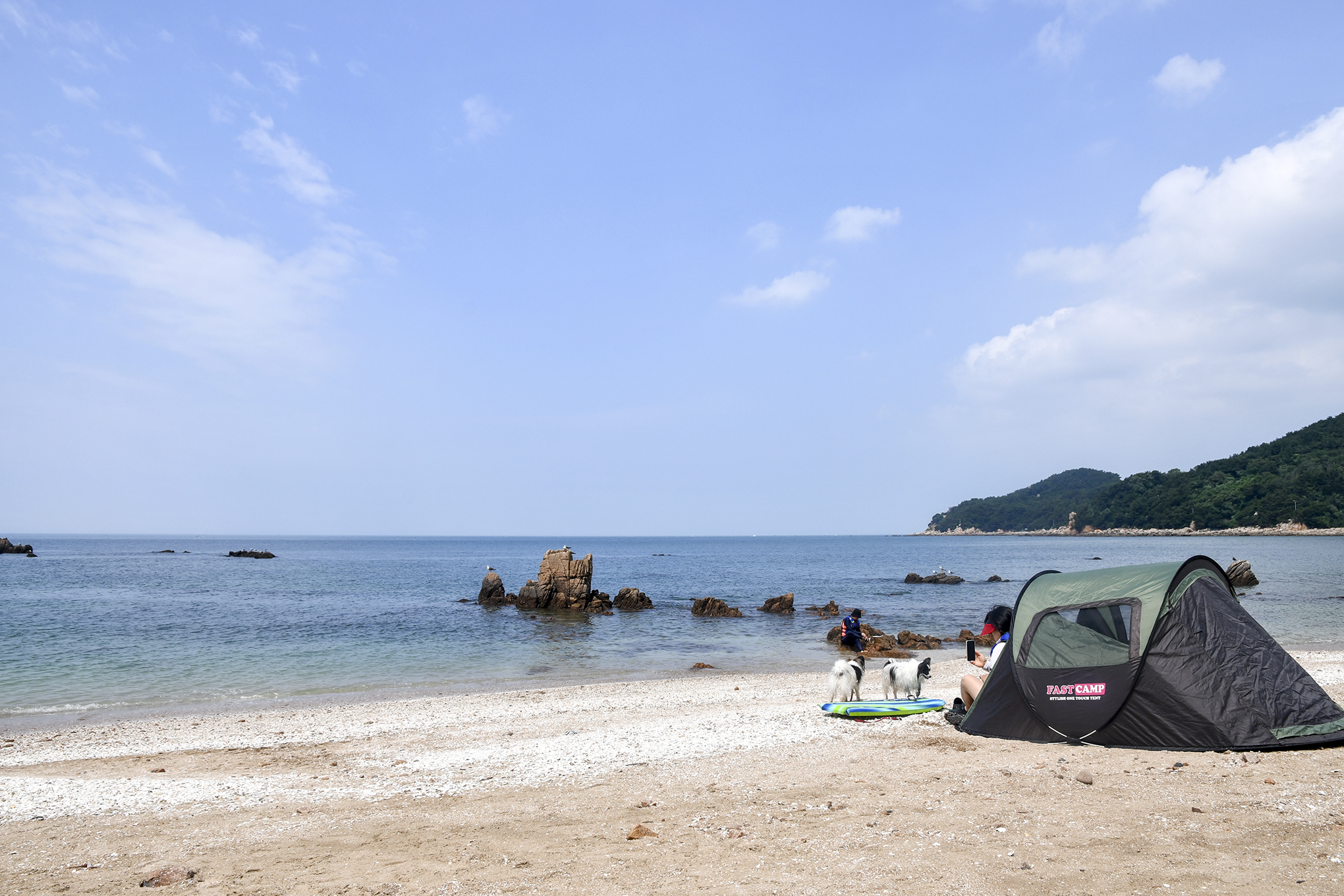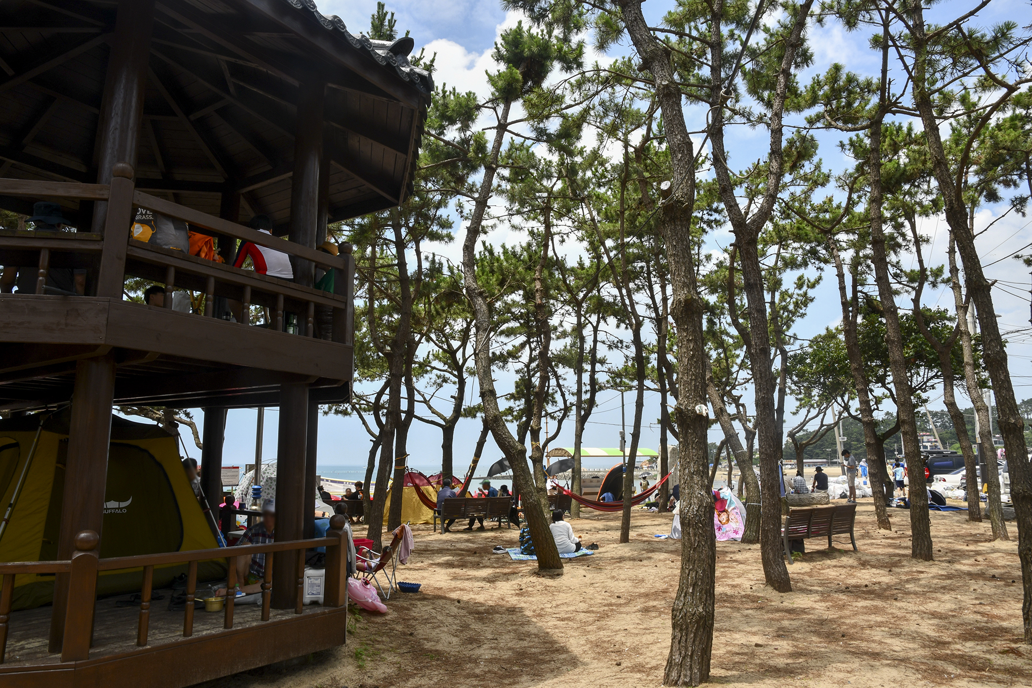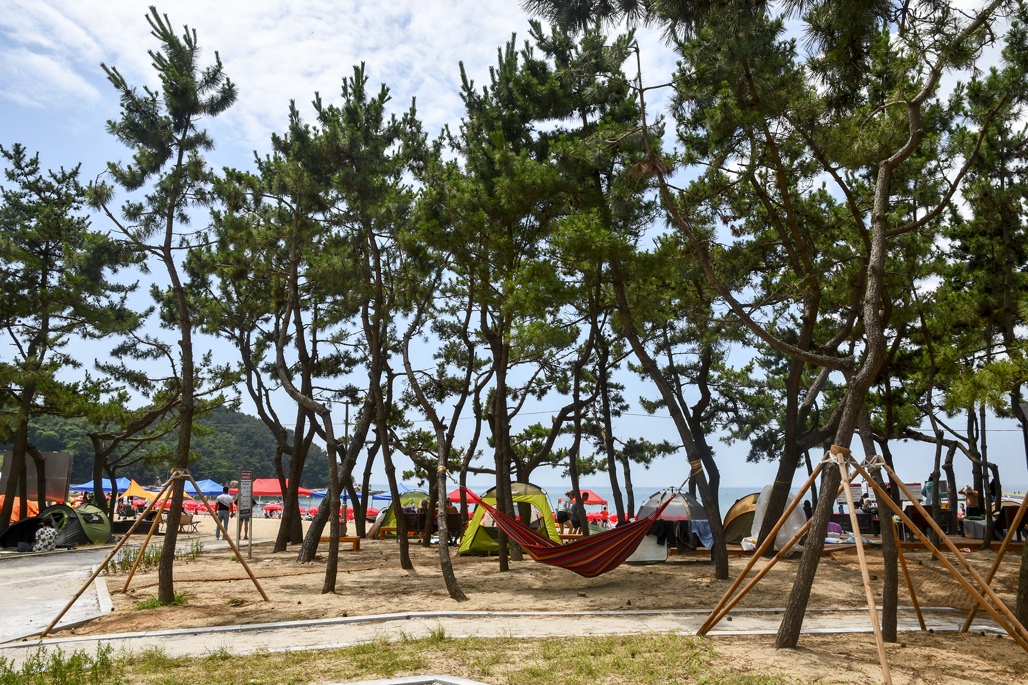 해변 입구쪽에는 솔밭공원이 있어 소나무숲 사이 텐트나 해먹을 설치할 수도 있다.