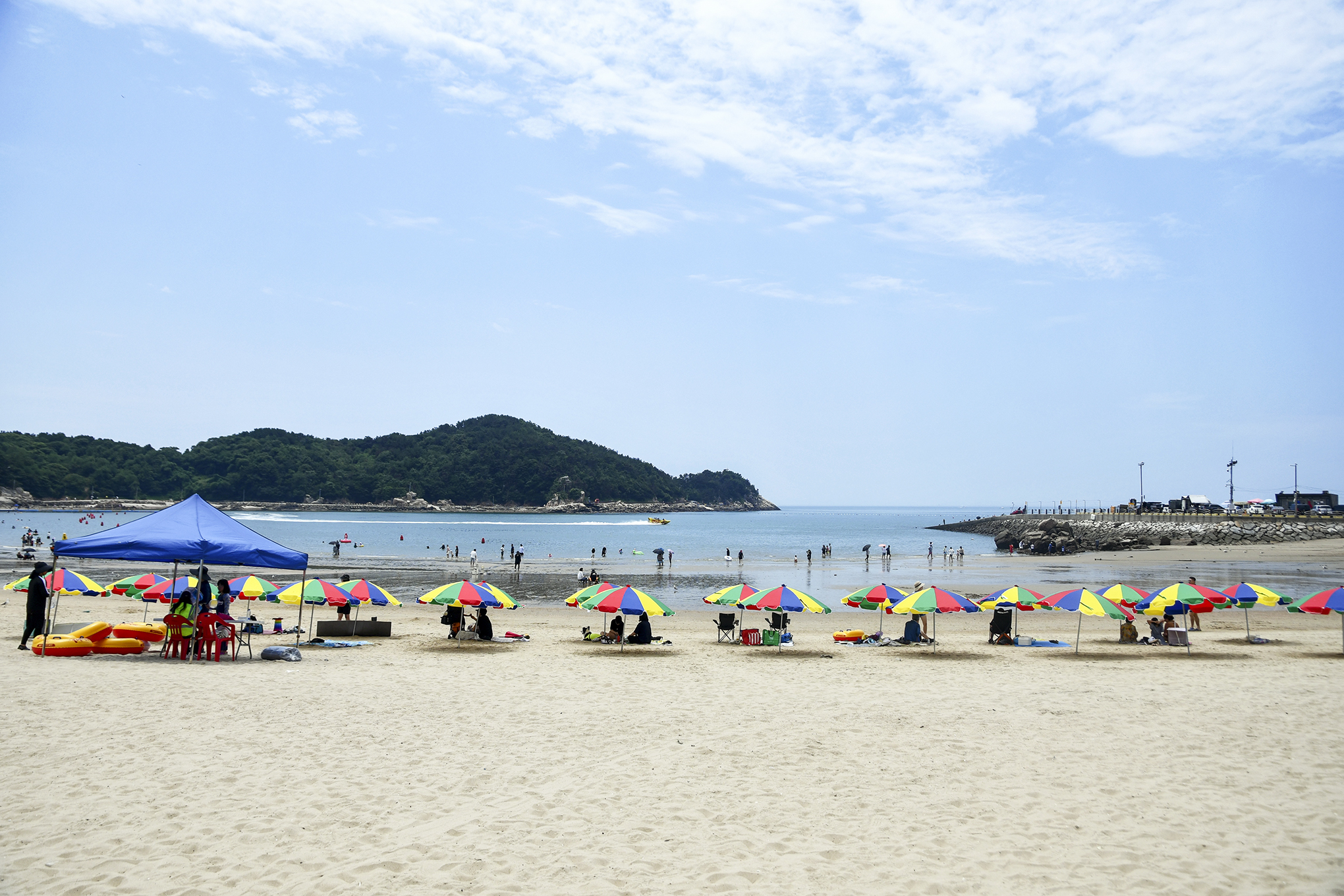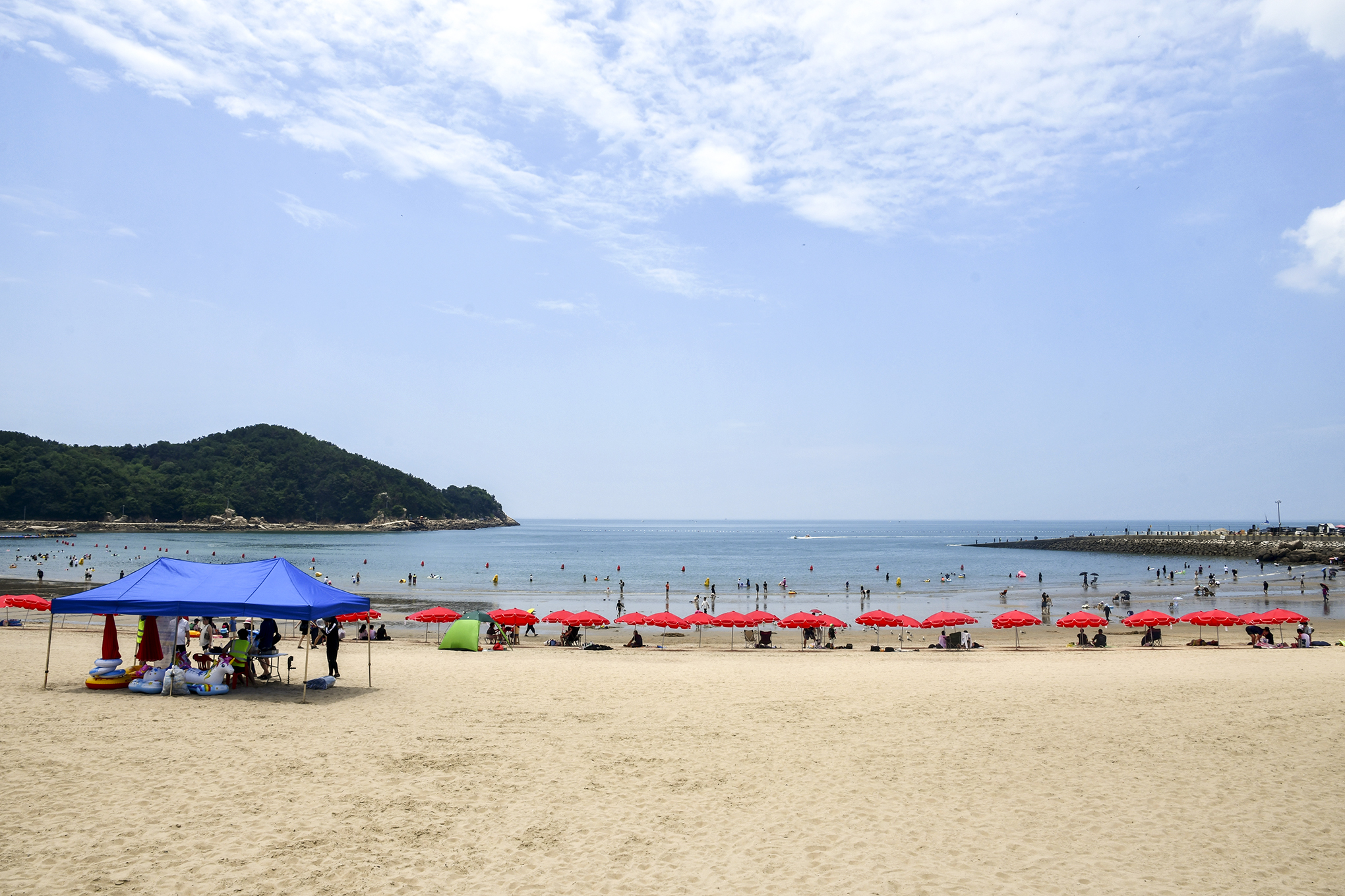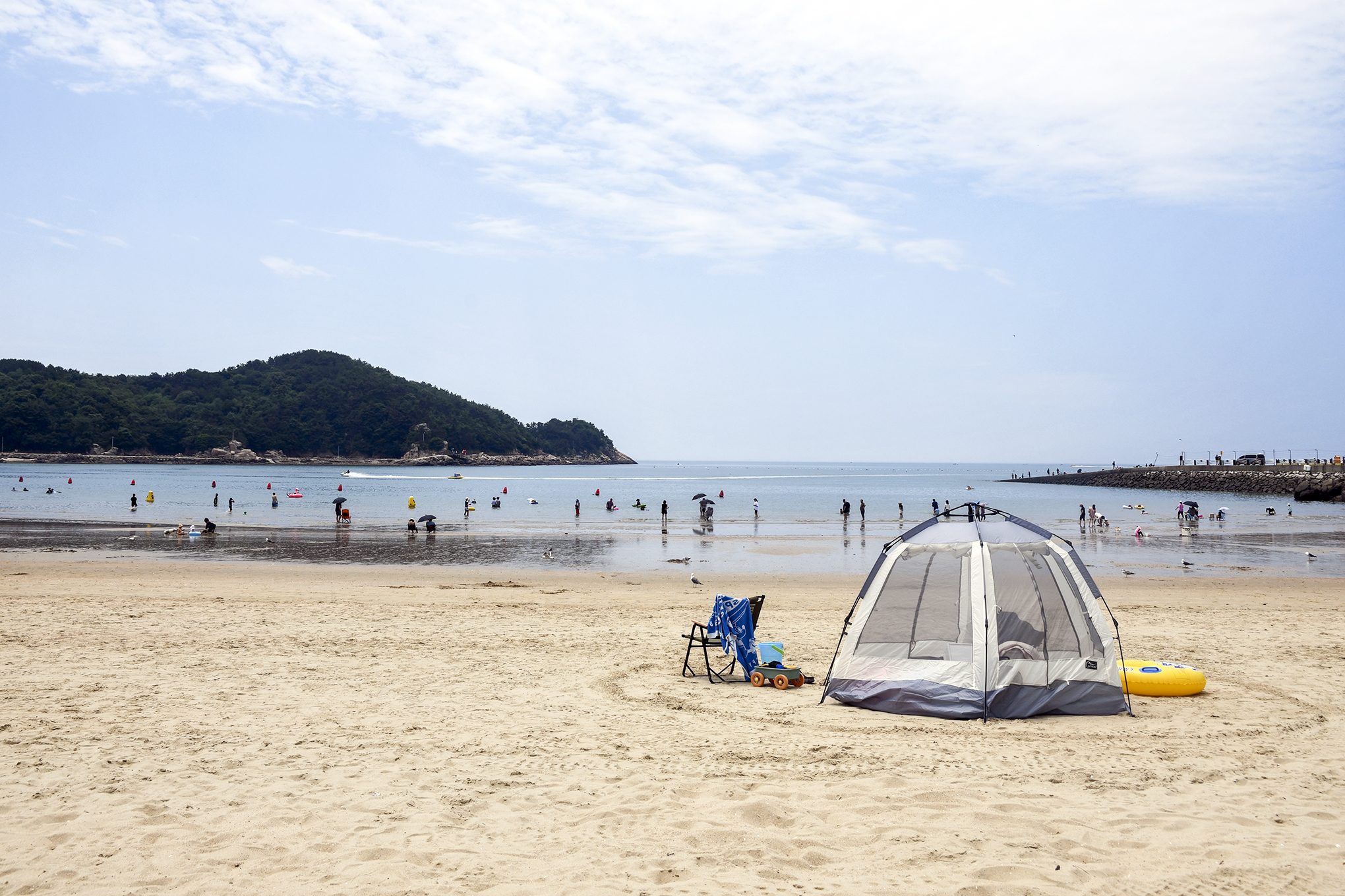 물이 빠지는 간조 때는 왼쪽에 바위들이 드러나 독특한 풍경의 사진을 담을 수 있고, 한여름 더위를 식혀줄 바다를 조금 더 가깝게 만날 수 있는 해변이다.