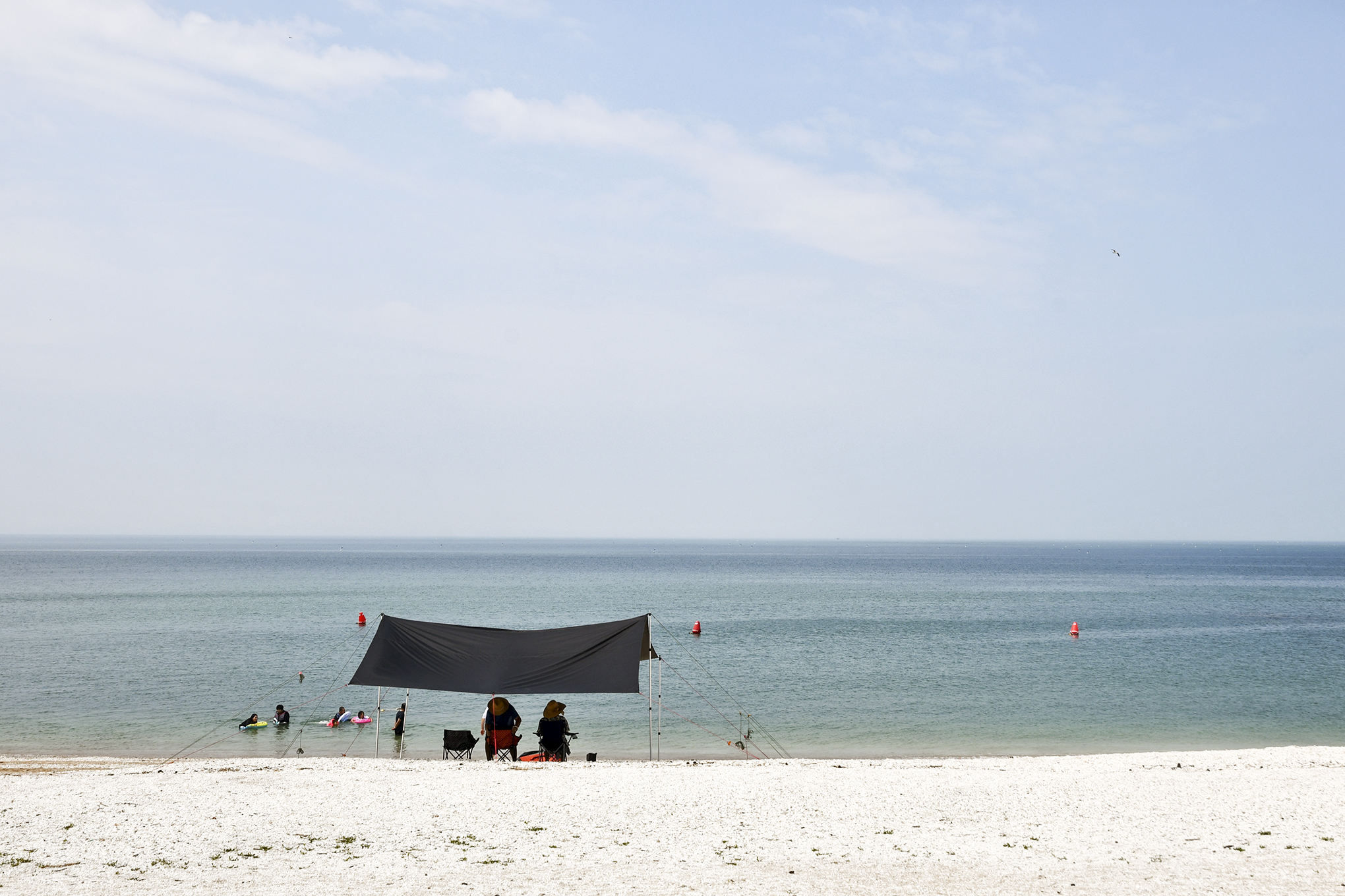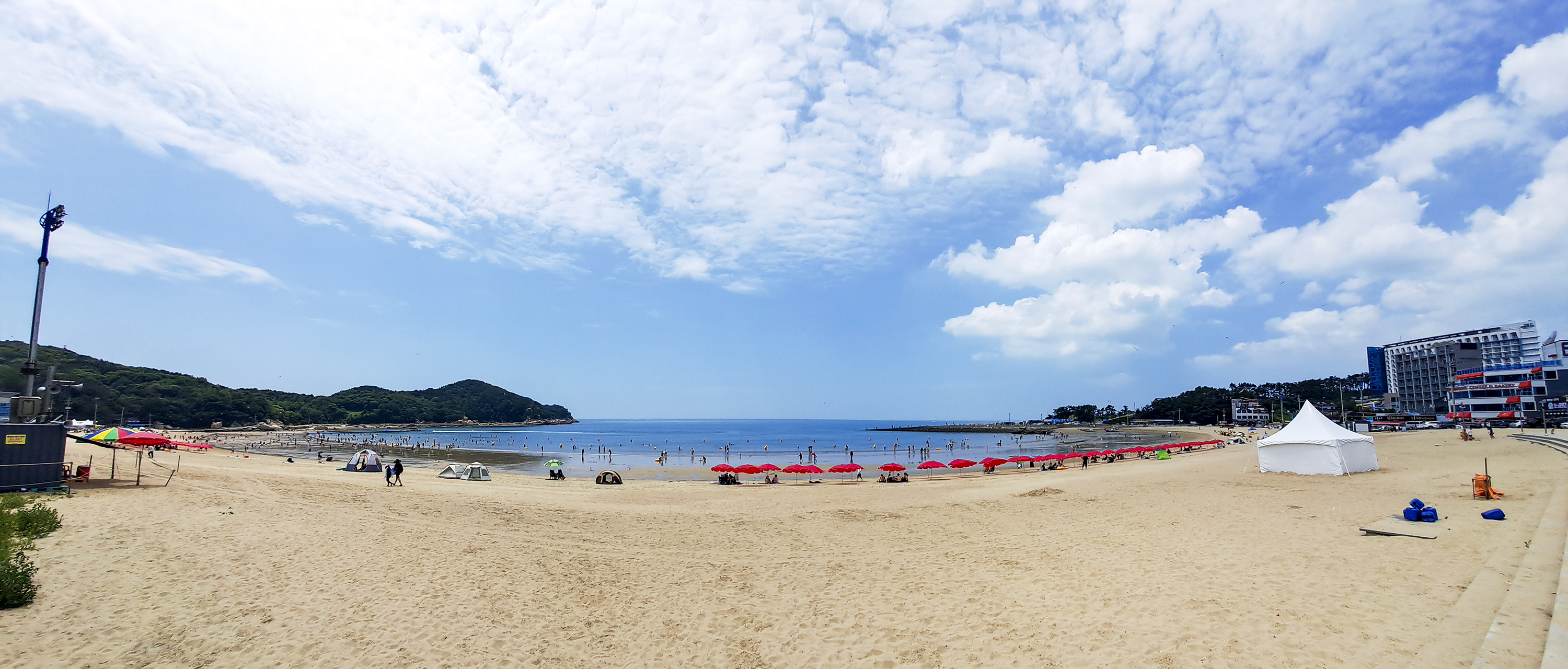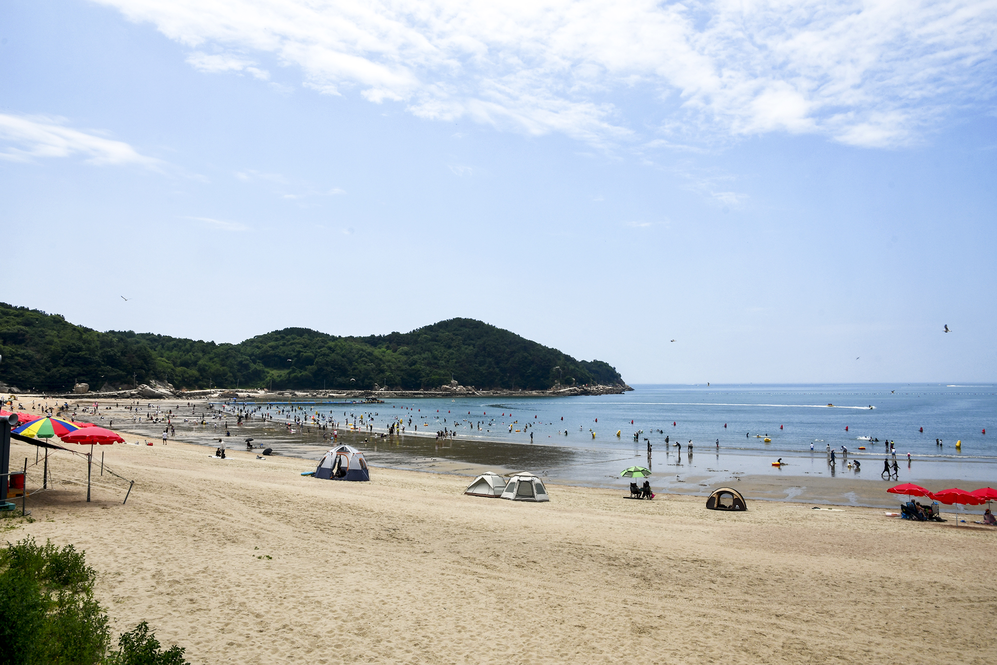 물이 빠지는 간조 때는 왼쪽에 바위들이 드러나 독특한 풍경의 사진을 담을 수 있고, 한여름 더위를 식혀줄 바다를 조금 더 가깝게 만날 수 있는 해변이다.
