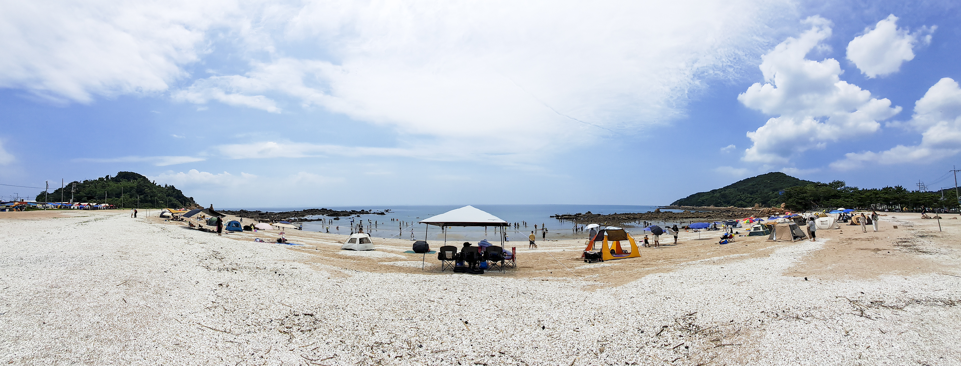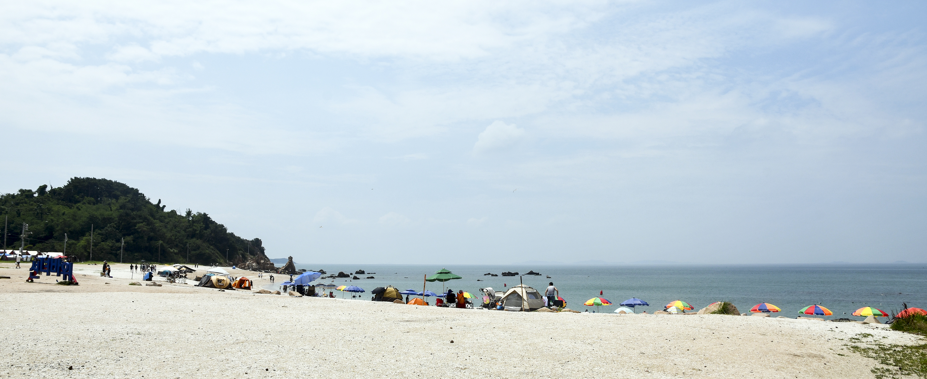 둥글게 형성된 백사장 길이가 약 700m, 간조 때 물이 빠지면 백사장 폭이 200m 까지 드러나 해변이 광활하게 느껴진다.