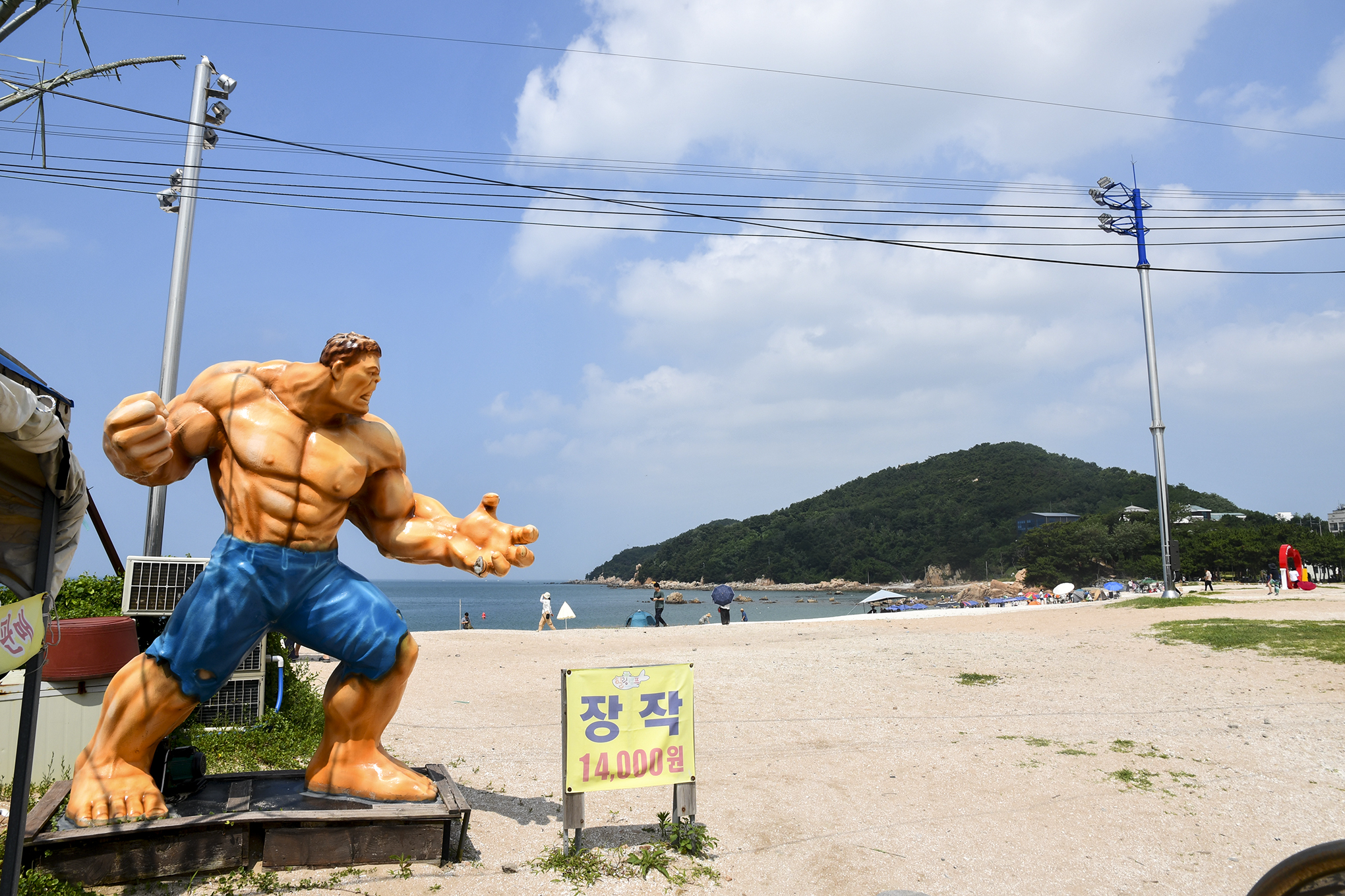 주차후 도로 건너 역동적인 포즈의 헐크 앞을 지나 해변으로 진입할 수 있다.