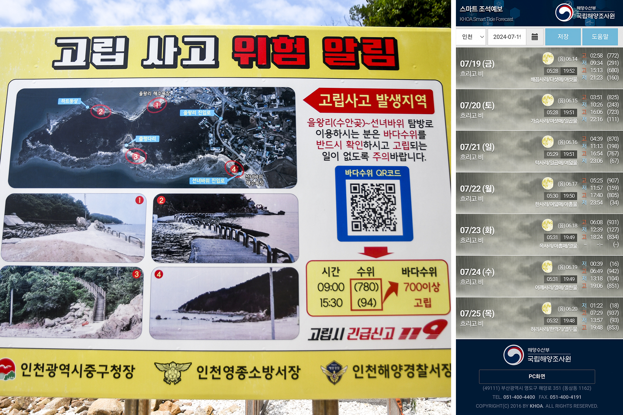 만조시에는 고립사고 위험이 있을 수 있으니 바다 수위를 반드시 확인해야 한다.