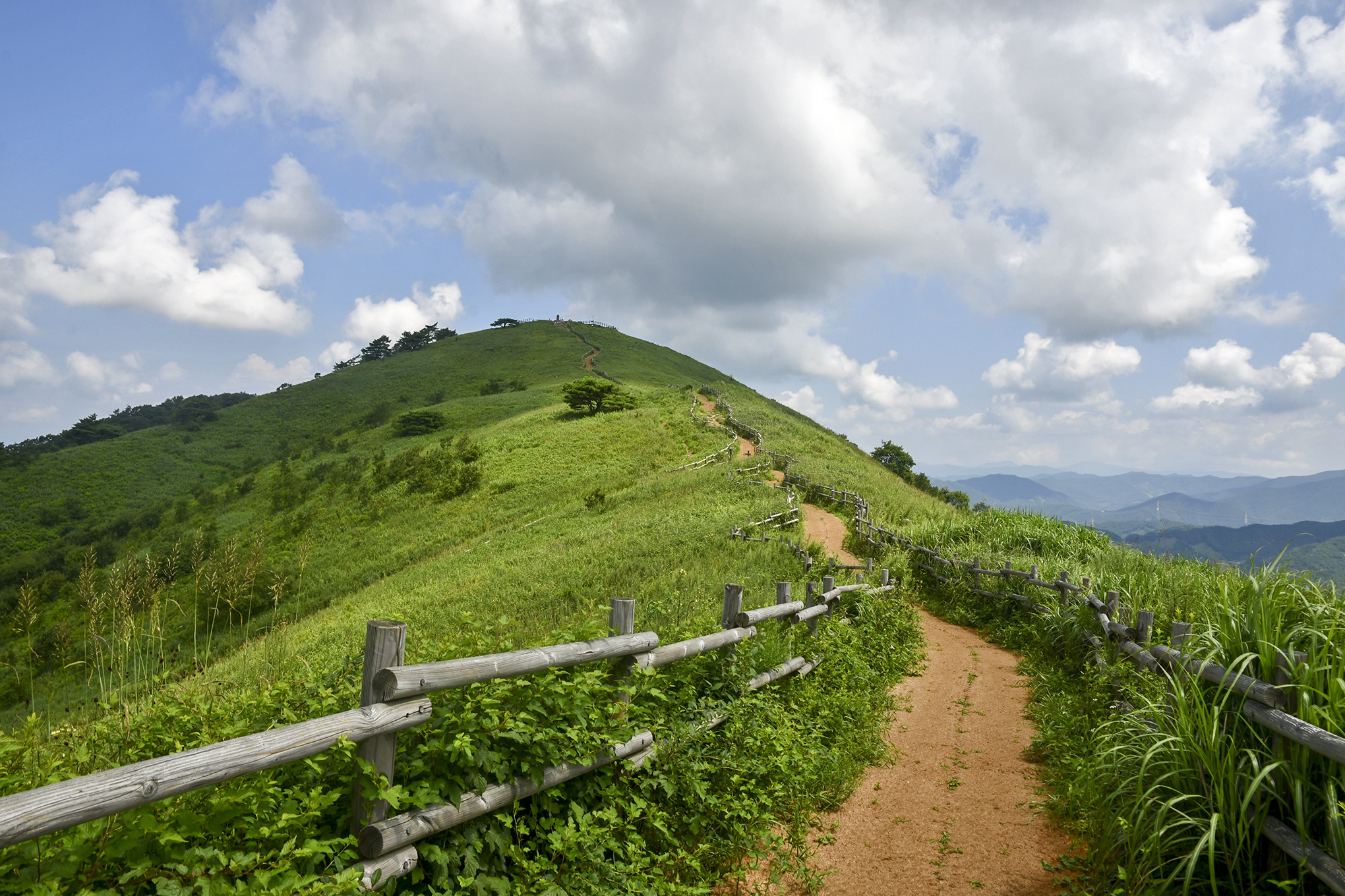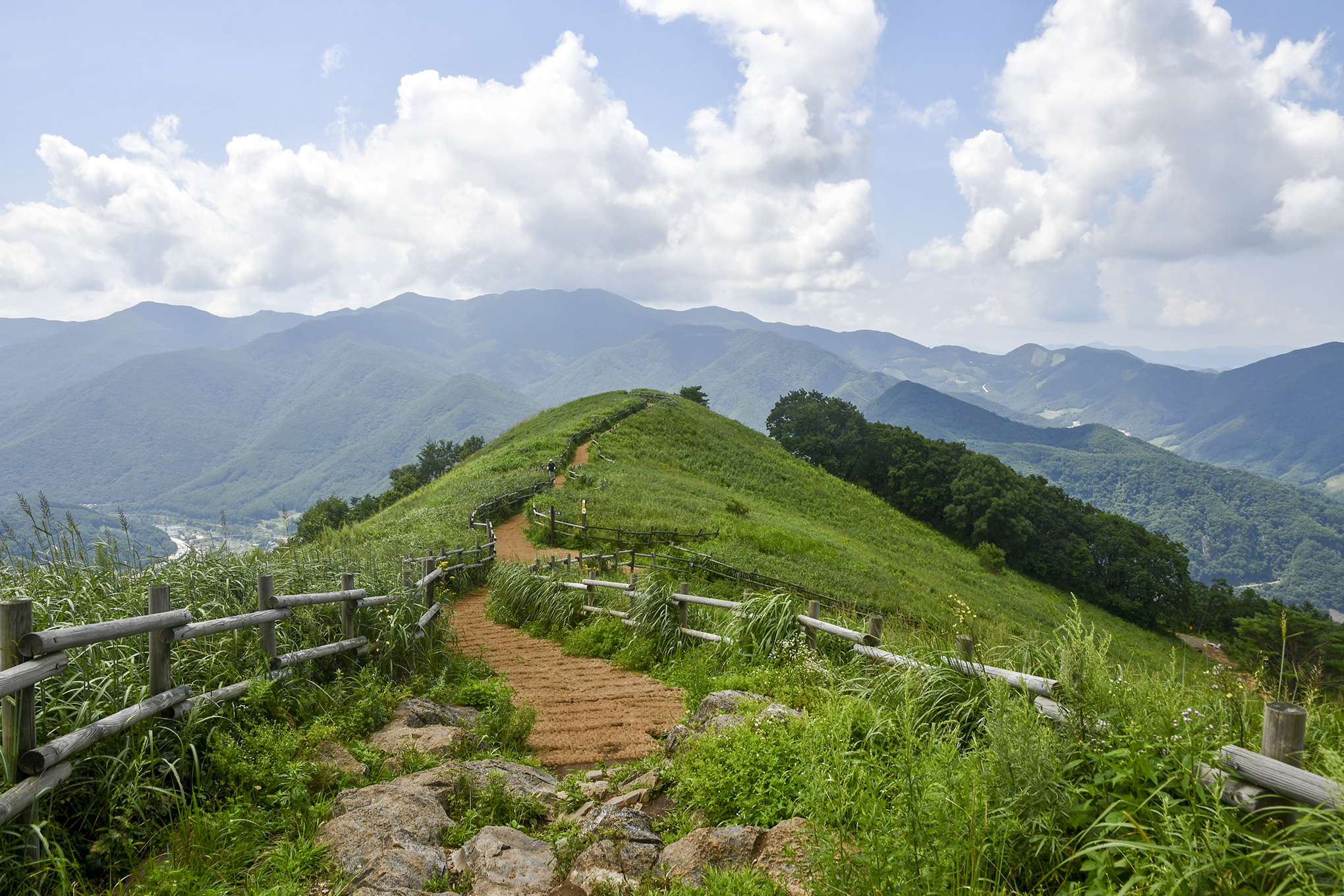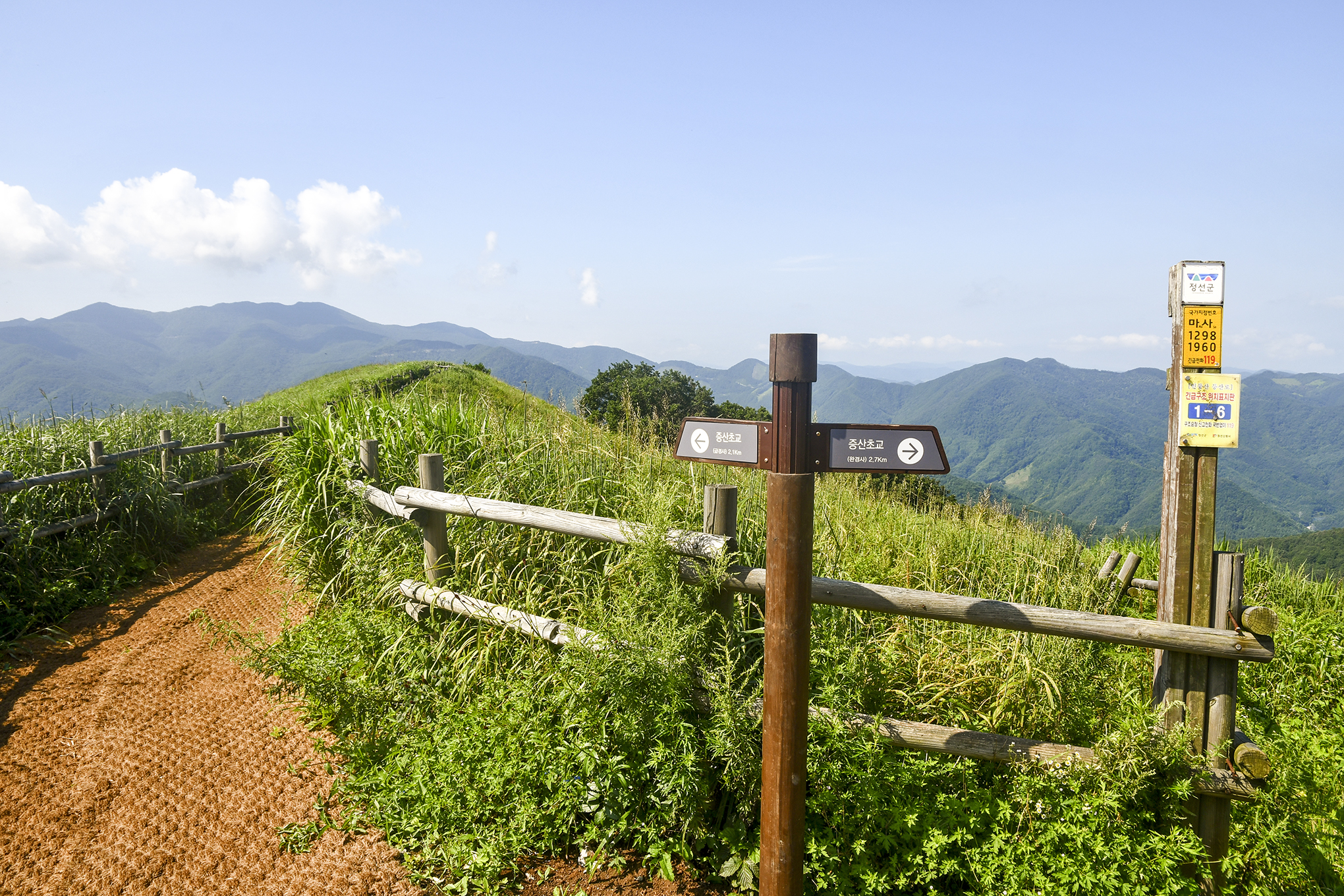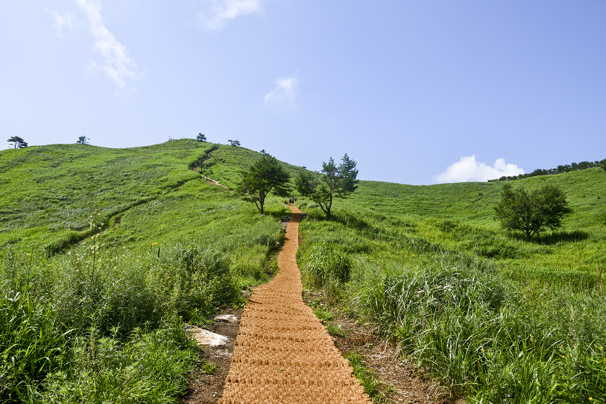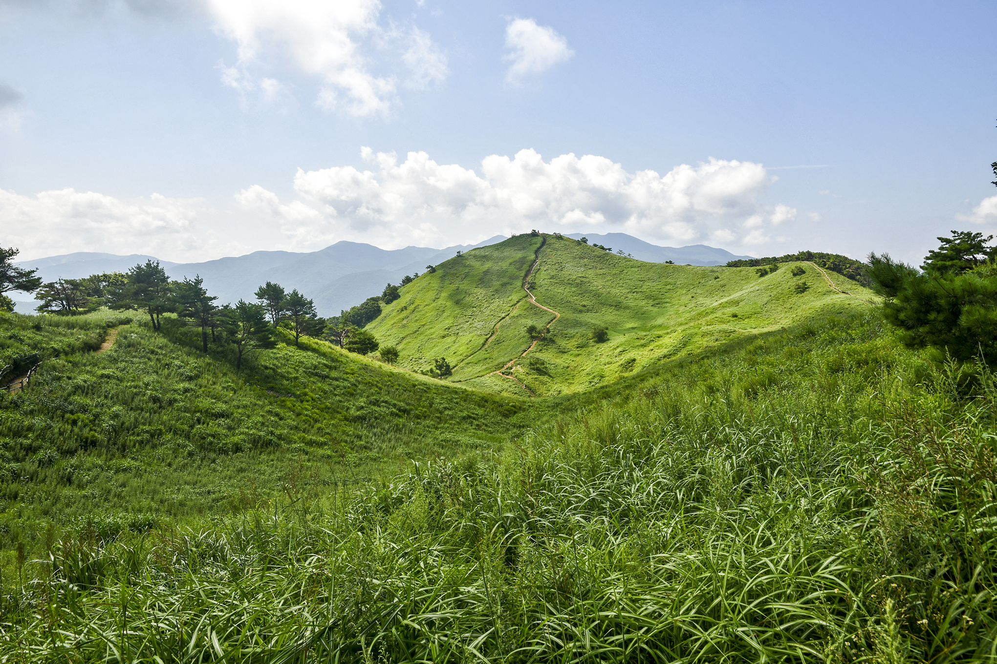 억새풀이 가득한 민둥산, 가을이면 은빛 억새가 반짝이며 장관을 연출하는 길이다.