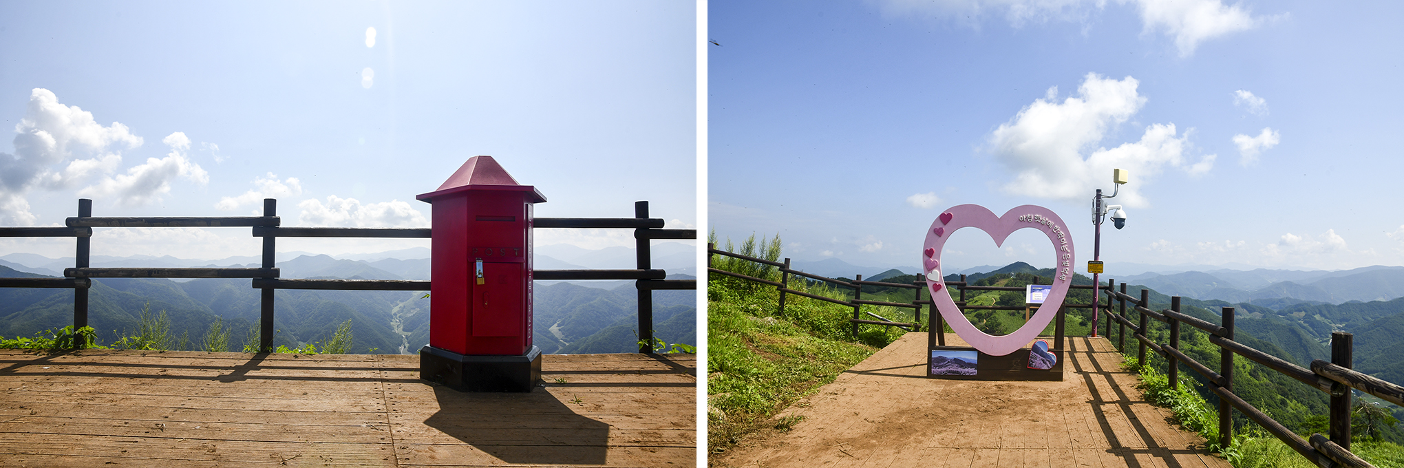 정상 전망대에 세워져 있는 우체통과 하트 포토존