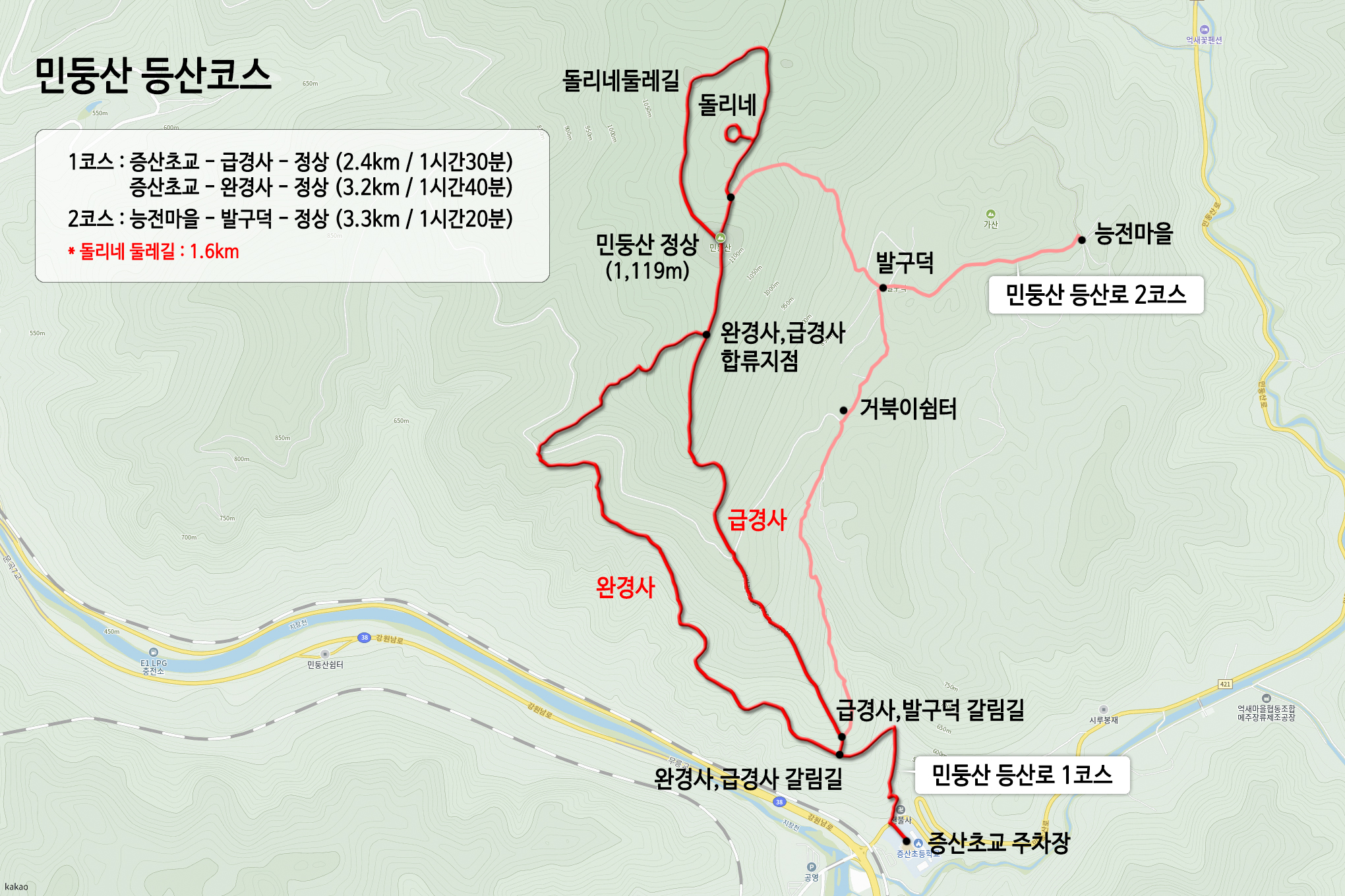 * 1코스 : 증산초교 - 정상 (급경사 2.4km/1시간30분, 완경사 3.2km/1시간40분 소요)